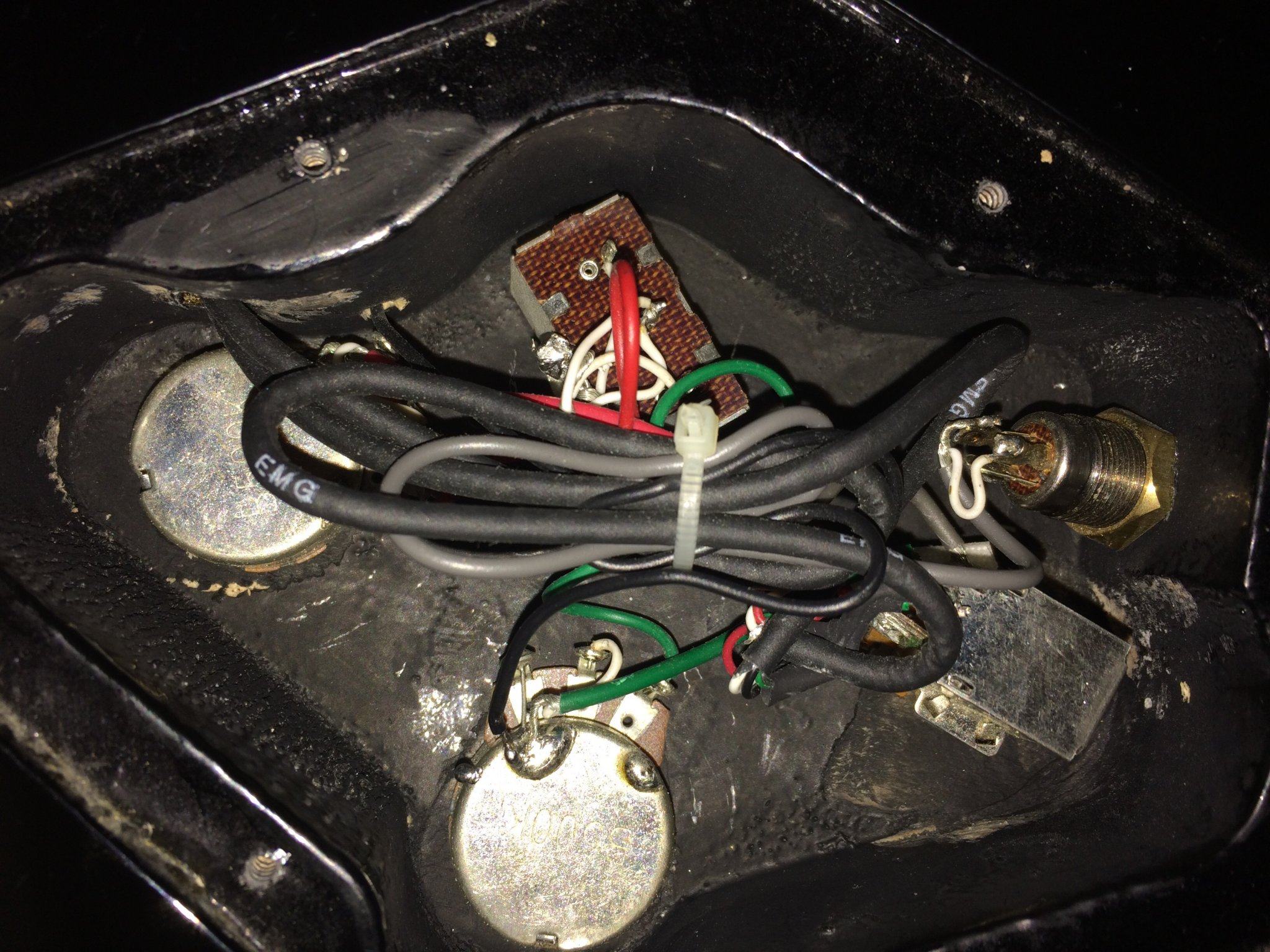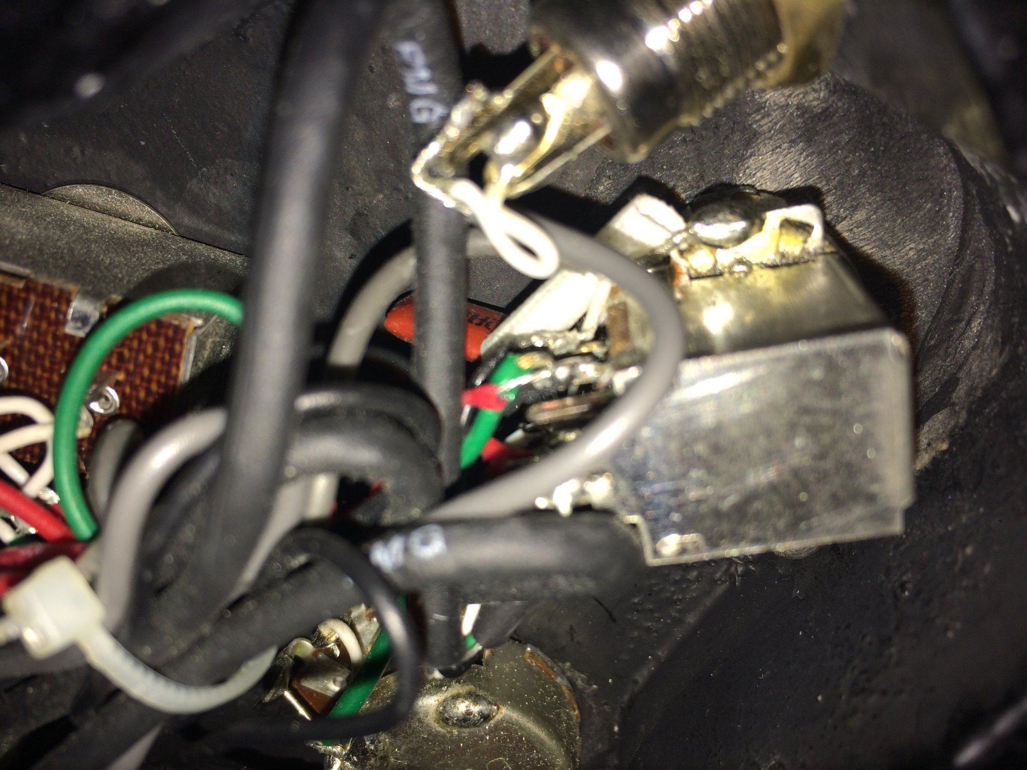 вот у двух круглых больших потенциометров нужно убедиться, что их вывод не касаются дерева, которое покрыто черным графитом. Открути потенциометры (сняв ручки отвернув гайки) и проклей под ними (так чтобы то место, где контакты могут коснуться, точно было заизолировано) с этой сфотографированной стороны изоленту и прикрути снова (а можно открутив их, на весу попробовать какой будет звук)