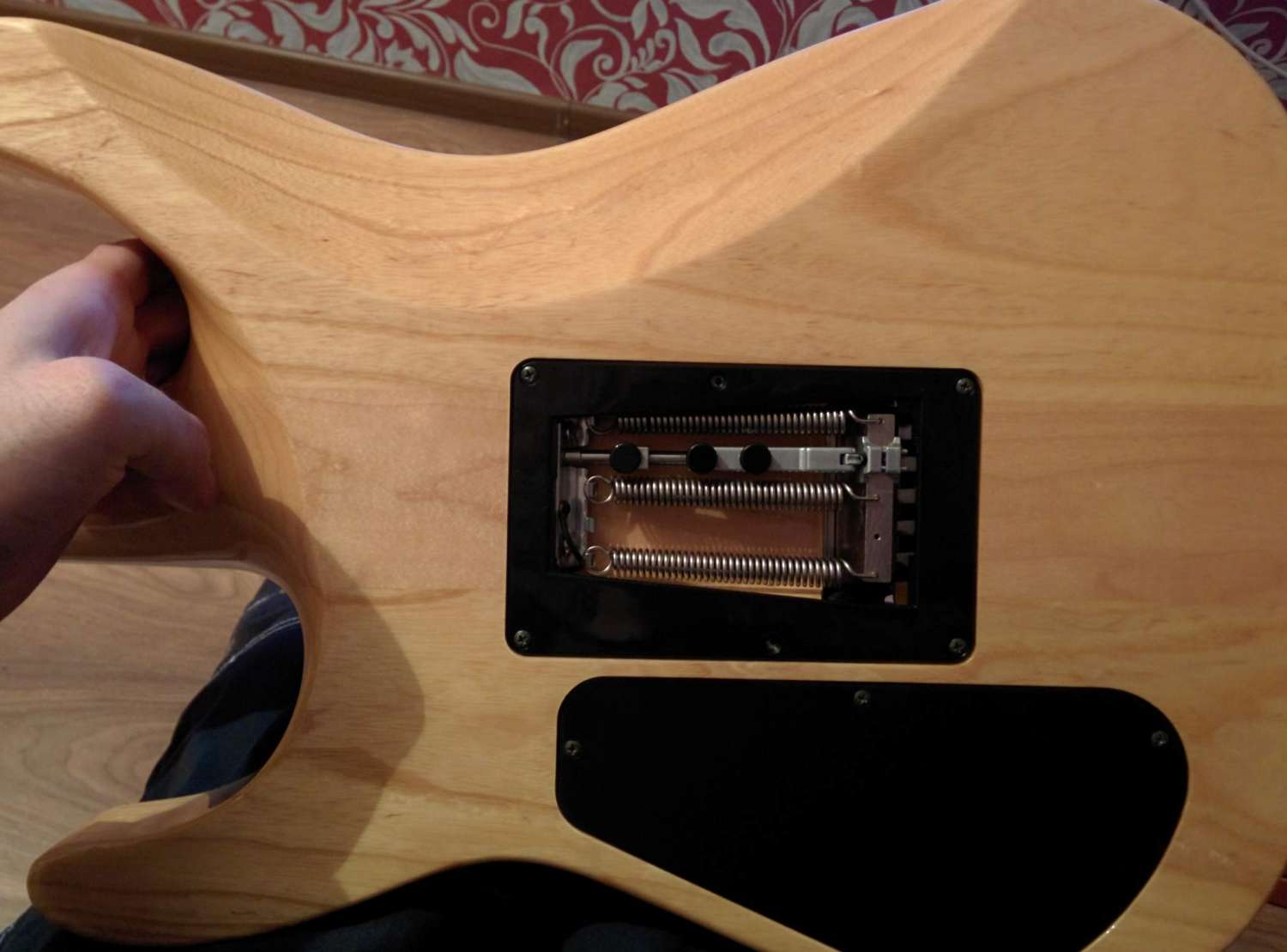 Продавец при продаже уверял, что дека из ольхи. Один знакомый, при знакомстве с инструментом, сказал, что ольха столько не весит, возможно это ясень. Если верить моим напольным весам, гитара с замененным флойдом на schaller lockmeister весит 3,5-4кг.