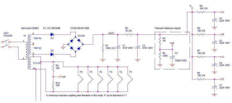 old, Делается делитель от анодки с получением порядка 80В, фильтруется конденсатором и подается на среднюю точку накала сформированную или резисторами или центральным отводом накальной обмотки.