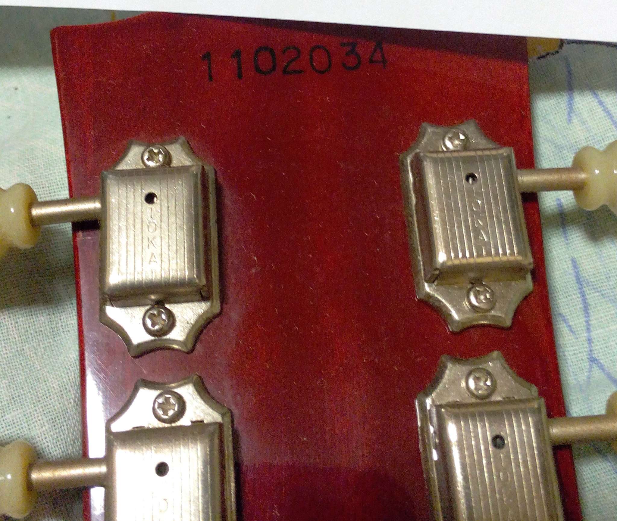 Довольно мало (по сравнению с общим количеством) гитар Tokai имеют серийный номер, представляющий собой чернильный штамп. Поскольку все чернильные номера на гитарах Tokai начинаются с цифр 01, 10, или 11 (соответствующие годам выпуска, которые вызывают наибольшее количество спорных вопросов), до недавнего времени считалось, что гитары с такими номерами делались в конце 1990's или 2000's годов, причем вне основного завода Tokai (например в Корее). Как бы там ни было, многие такие гитары имеют особенности, присущие японским гитарам Tokai более ранних годов выпуска (в частности двухкольцевые колки да и название модели "Reborn" просуществовало лишь до 1980го года), так что если у Вас в руках такой инструмент, то сделан он был, по всей видимости, в Японии в 1980-81 году.,осталось выяснить,какой серии инструмент,и после можно говорить о цене.