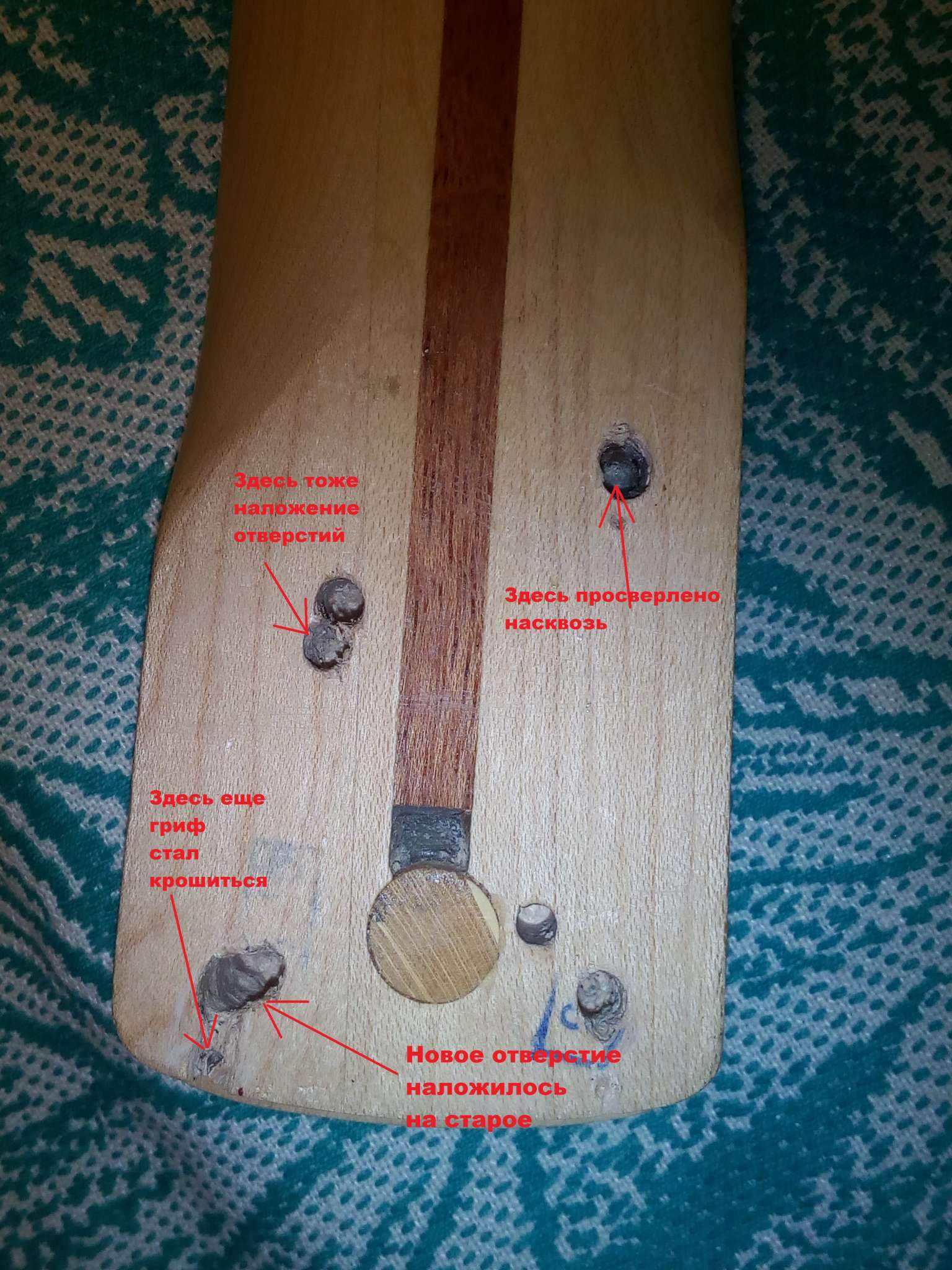 Теперь только попробовать толстые струны поставить и натянуть как следует - может обратно выгнет... хотя эту гитару уже собирался выбросить.
