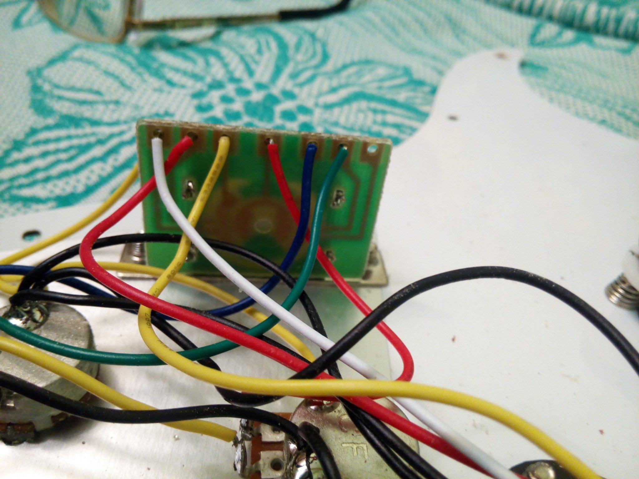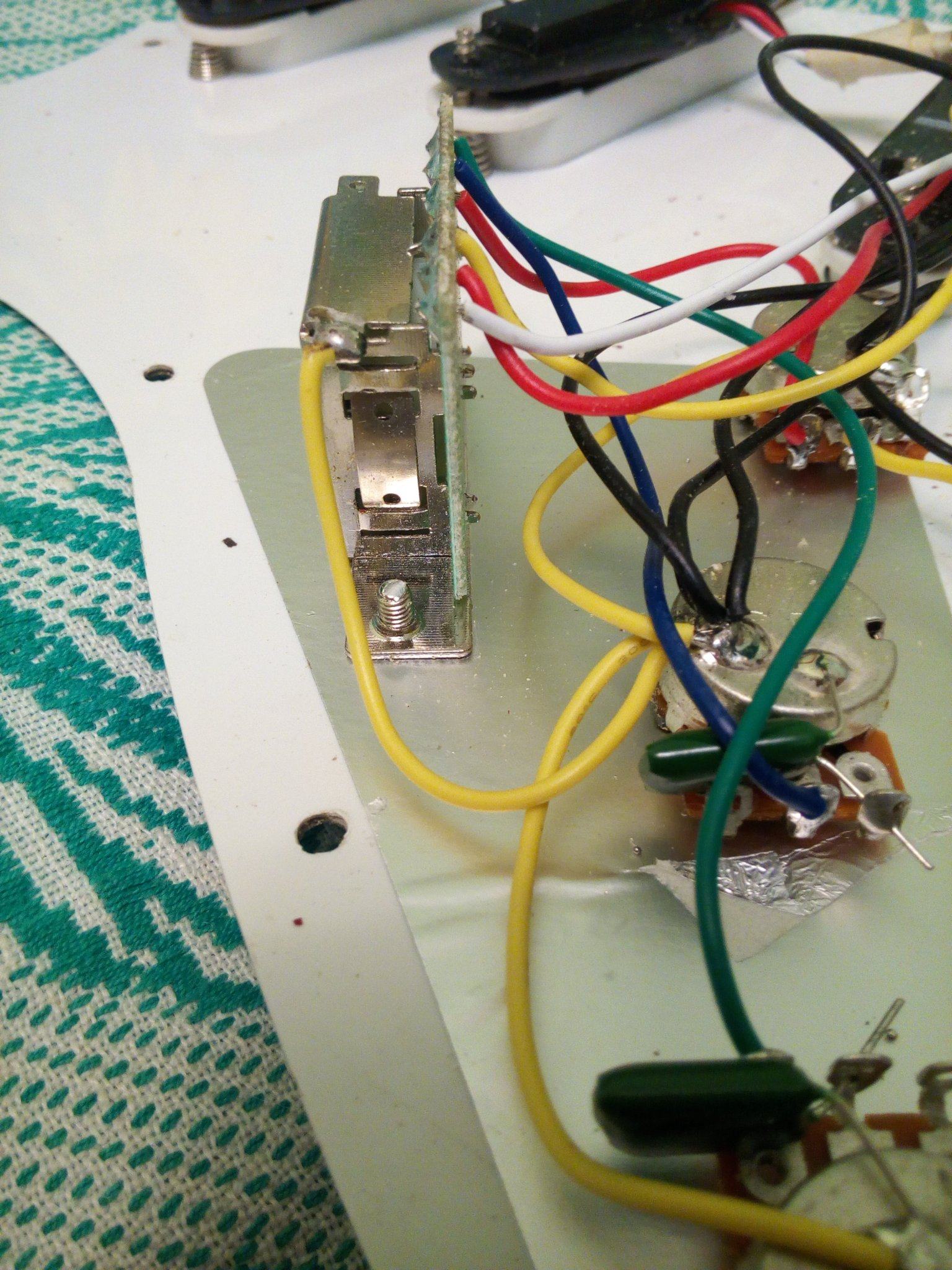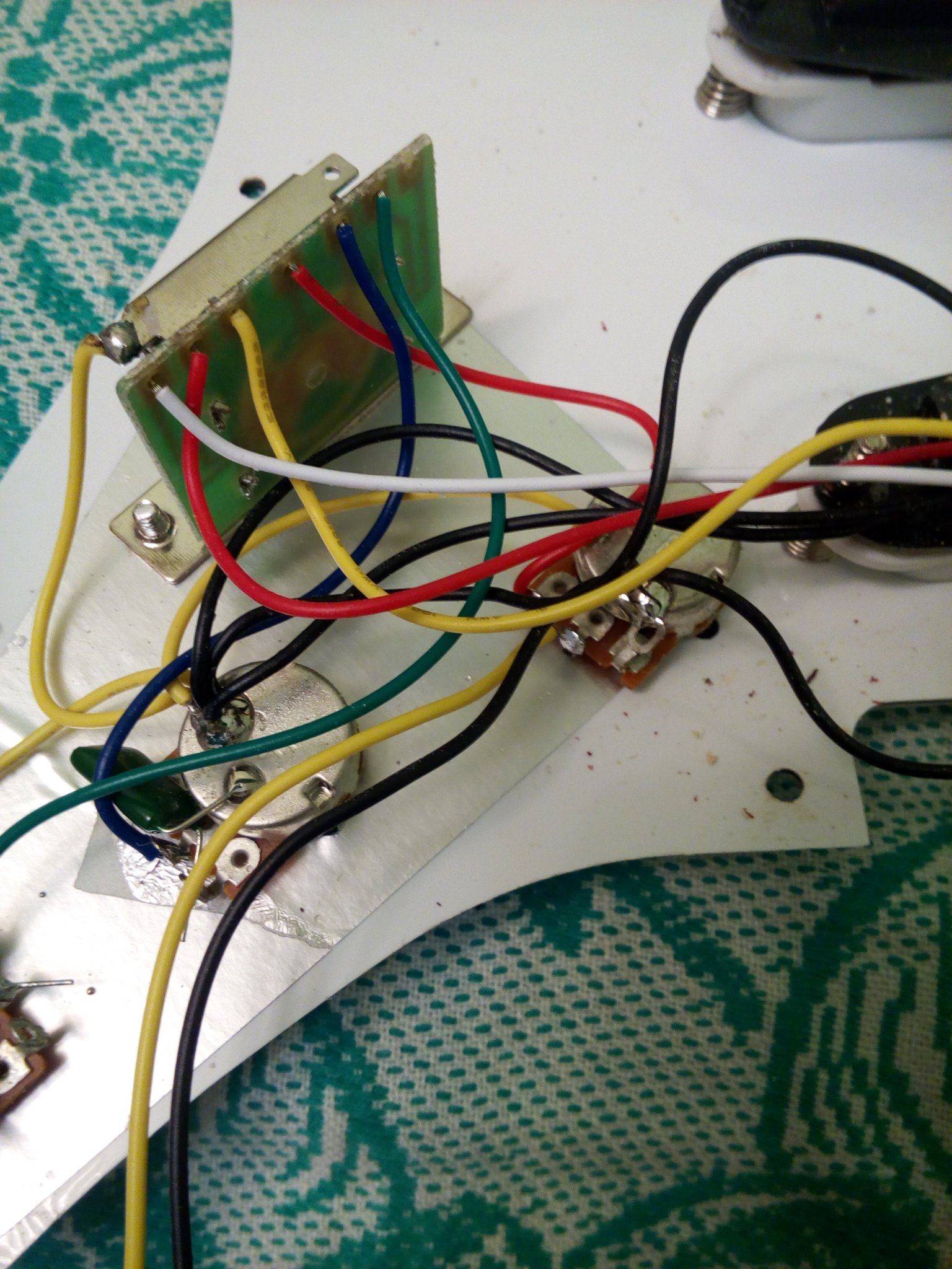 В бридж воткнул рельсовый хамбакер белкат. Распаял его как ты и говорил, красный на свитч (в ножку на место бриджевого сингла), голый и чёрный на массу ( на потц), белый и зелёный вместе и залепил изолентой. Звук конечно отличается от сингла, но все равно какой-то не очень хайгецнистый после игры димарзио супердисторшен(у друга он в бридже на его палке).