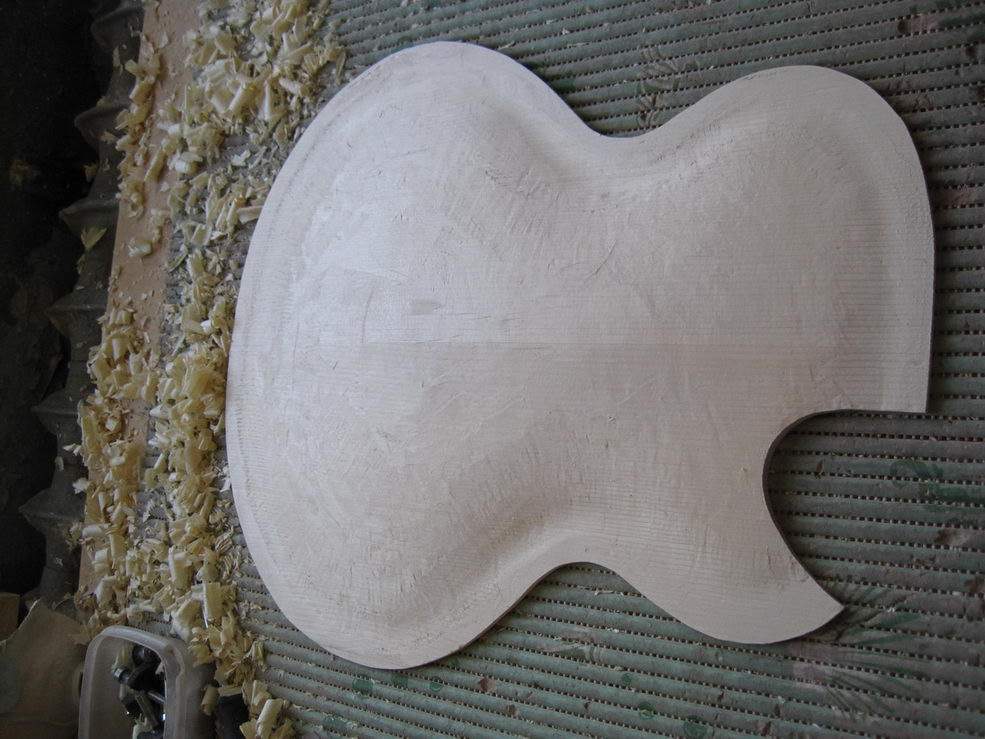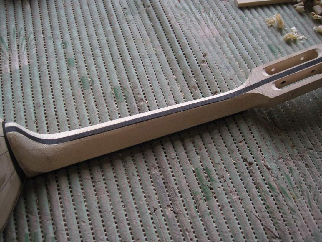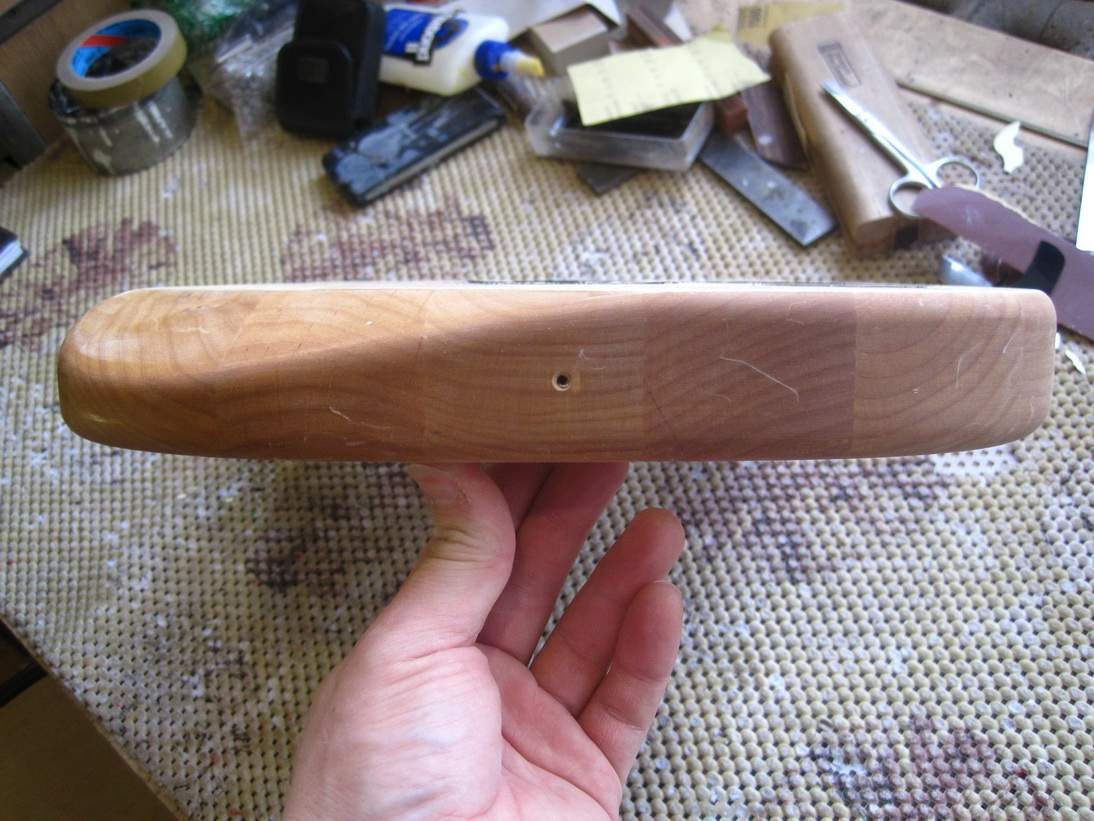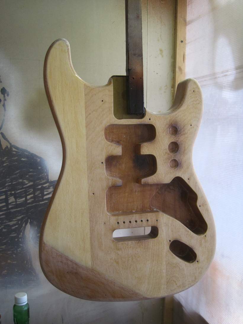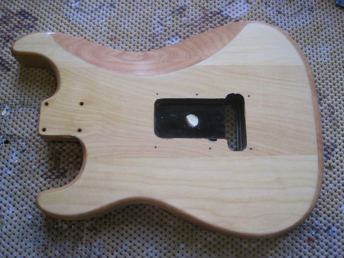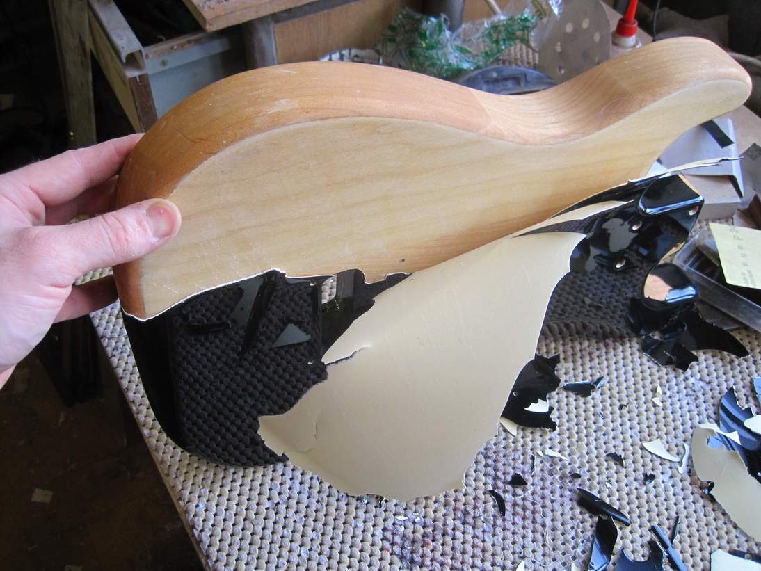 Сдираем всё шпателем с нагревом феном и обнаруживаем корпусец из 7 кусков ольхи со шпоном сверху, чтобы склейки сквозь краску не проступали. Красим двухкомпонентным акрилом. Толщина покраски в итоге около 0.3-0.5 мм.