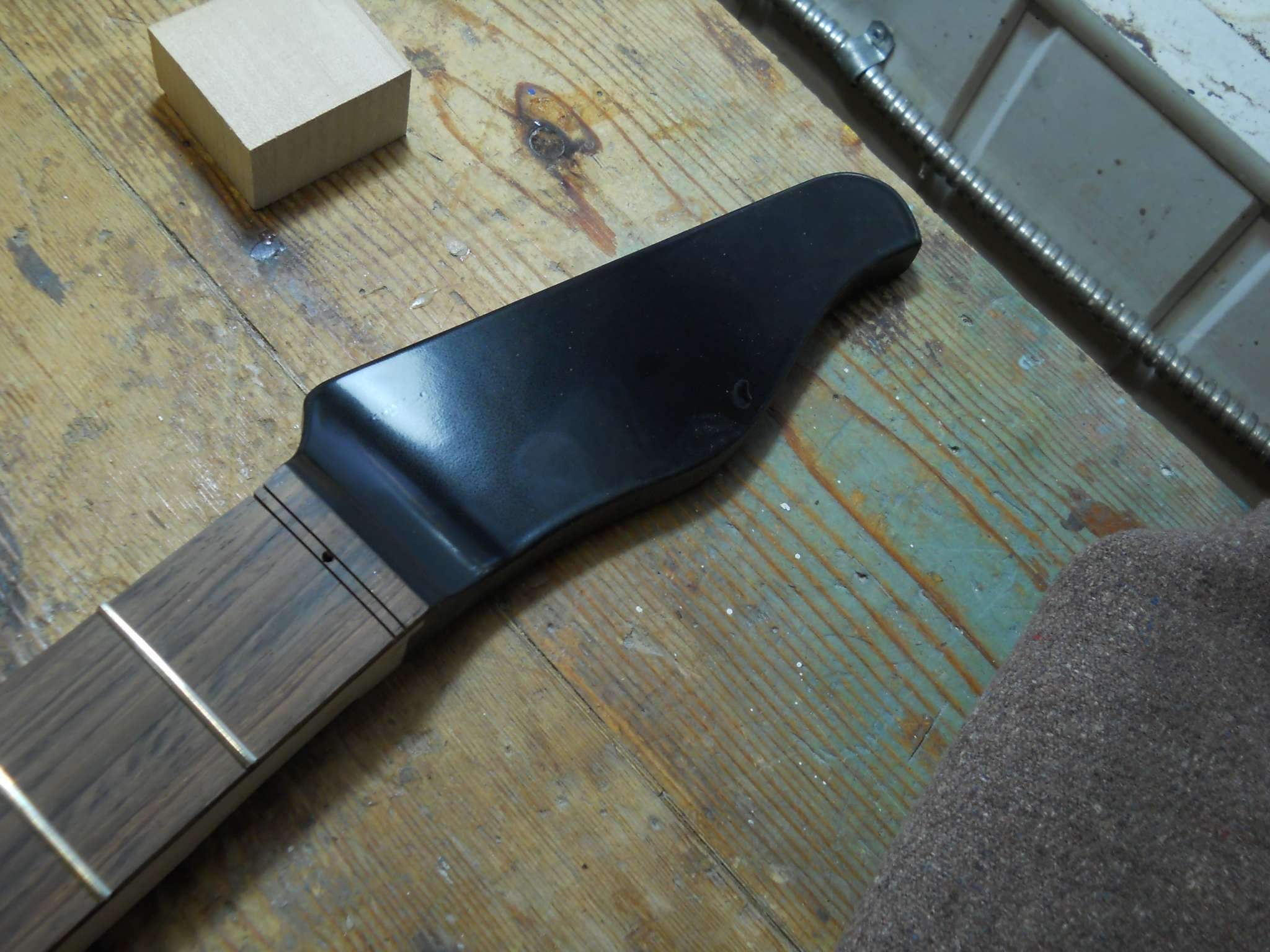 Накладка тоже заранее отпиливается и наблюдается. Базовую плоскость накладки фрезерую перед приклейкой. Начиная с подгонки
