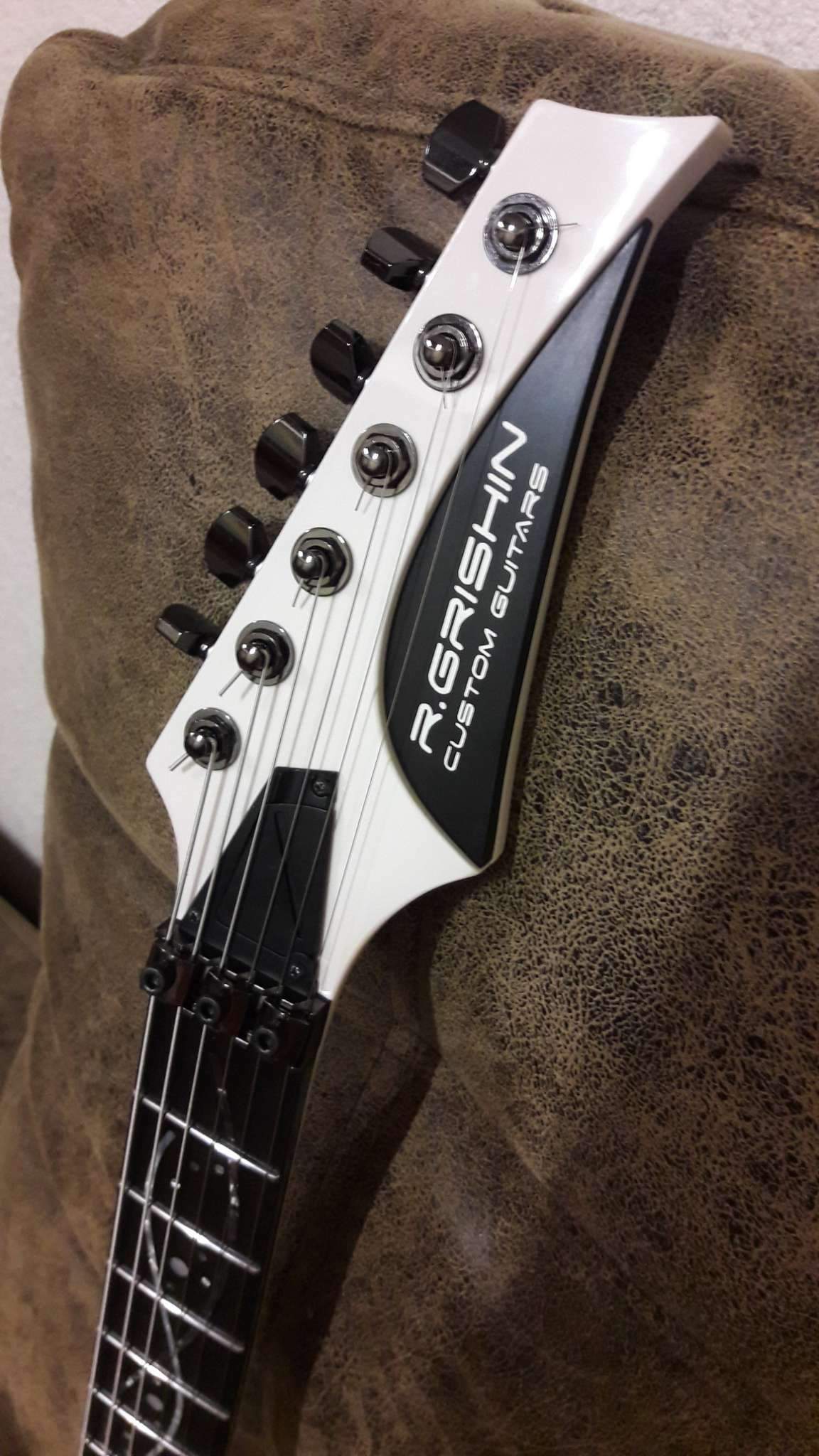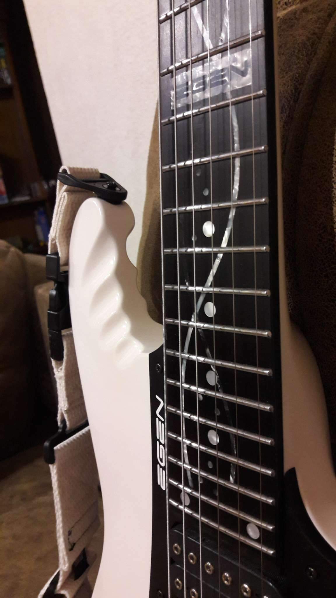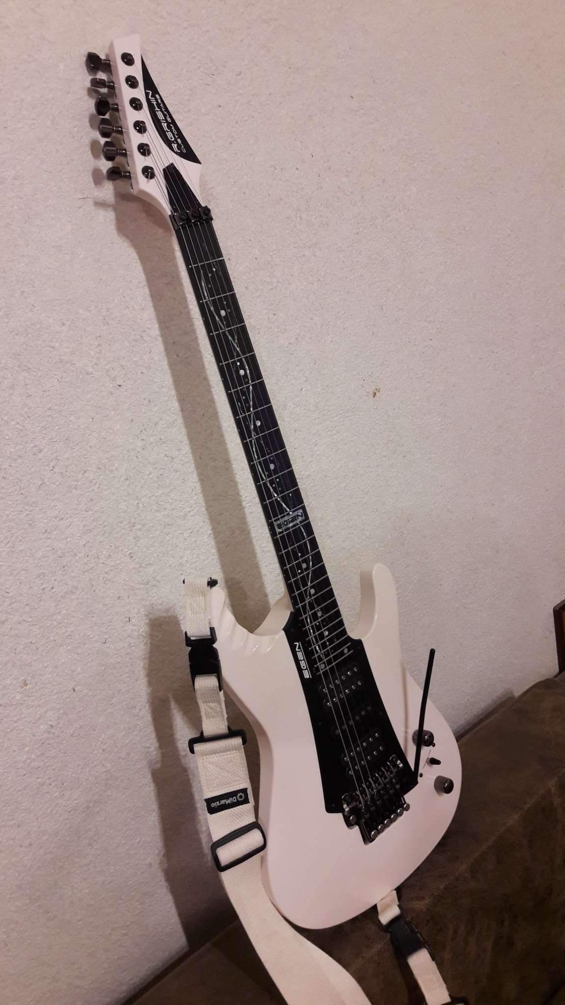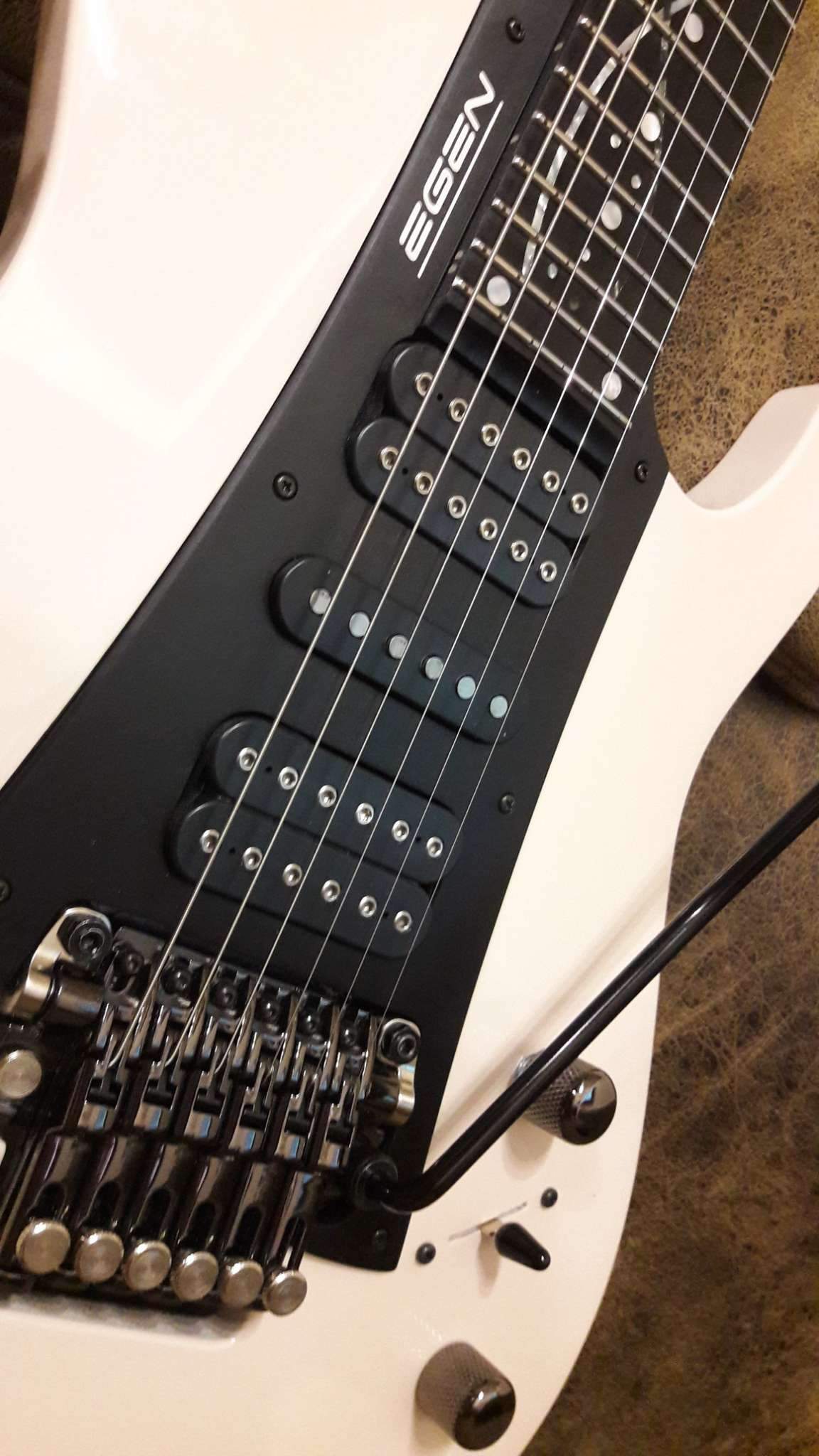 Закончилось томительное ожидание очередного Гришинского творения. Очень доволен. Из того, что задумывалось, осталось только внешнее напоминание о прототипе (IBANEZ EGEN) и сет звукоснимателей, к слову сказать, очень удачный. Глянец покрытия и мат эбена (под маслом), белое и чёрное, плавность форм корпуса и вызывающая резкость в голове грифа. Оговорюсь, на что то мне пришлось сподвигнуть мастера, где то он спустил меня с небес. Рад, что моя задумка и его руки и опыт вместе создали этот инструмент. Хочется сказать, что гитара выглядит лучше, чем звучит. Но.....!!! как она звучит!!! (выложу позже, обещаю). СПАСИБО, Виталич!!!