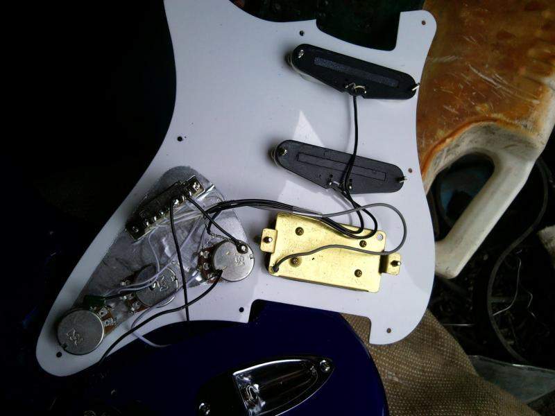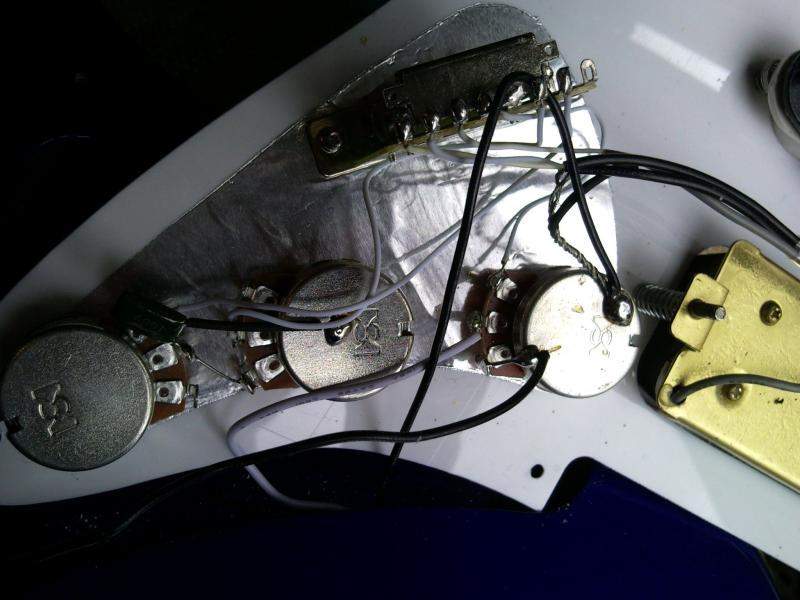 http://www.seymourduncan.com/support/wiring-diagrams/schematics.php?schematic=1h_2s_1v_2t_5w схему, будто у него гитара распаяна так. Но у меня нет! Совсем по-другому. И если перепаять все согласно той схеме, то звука у меня нет, есть фон, при любом положении переключатель датчиков одинаковый. Но я уже перепаял, только потом понял, что фотки оригинальной моей распайки вышли нечеткие, и восстановить все не смог. В интернете схем подобных моей не нашел. На фотках показано, как все было в оригинале. Если кто сможет расшифровать полностью, или кому эта схема знакома, напишите, буду очень благодарен. А пока, я спаял все настолько точно, как смог, в итоге работает все за исключением регуляторов тона, обоих. В чем ошибка? Ну и самое главное: а как, собственно, распаять именно мой экземпляр так, чтобы был толк от экранировки?