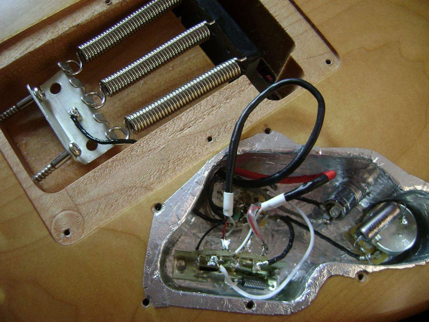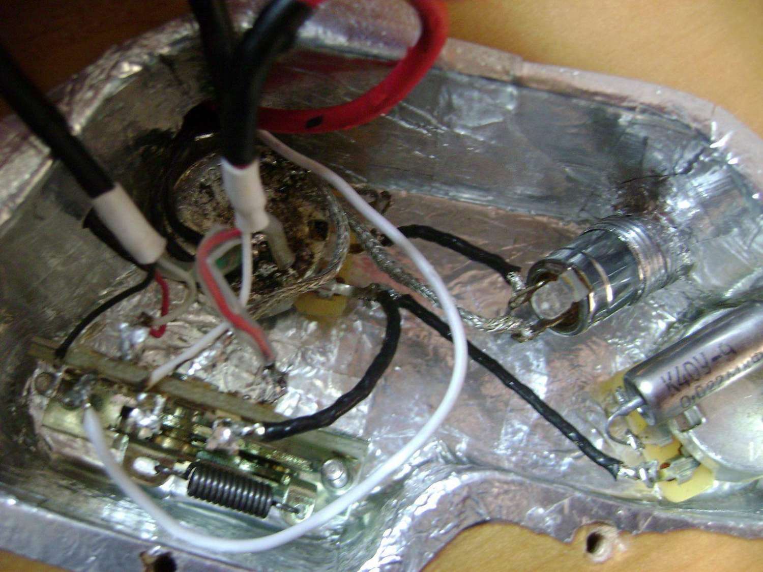 uzerPRO, А меня на сцене отсутствие экранировки не пугает. Раньше заморачивался, паял, экранировал, улучшал там и тон компенсаторы, и фольгу... Сейчас остыл... У меня страт полностью не экранированный., а полу-акустика кстати очень интересно заэкранирована - там все соединяется проводами в экране, сами потенциометры полностью обернуты сначала в резину, потом в фольгу, при чем так, чтоб фольга касалась ножки потенциометра. Достаточно мало фонит, но я подозреваю что за счет этого некоторая яркость пропадает.