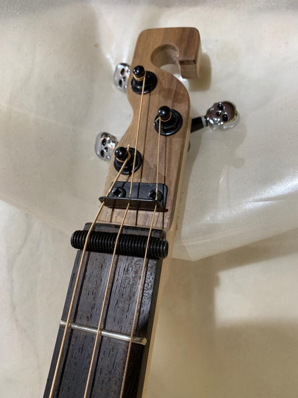 Делать отверстие в верхней деке не хотелось, поэтому сделал звукосниматель потоньше, но поширше. Толщина получилась 7 мм, ширина 36 мм, длина 71 мм. Основание согнул из куска консервной банки от тушняка, катушку сделал символическую - из тонкого картона (чтобы влезло больше провода), магниты - две штуки от мебельных защелок, намоточный провод - 0, 063 мм, влезло 4000 витков (магниты много места занимают).
