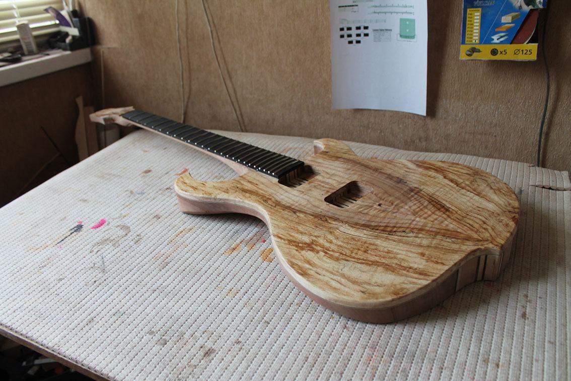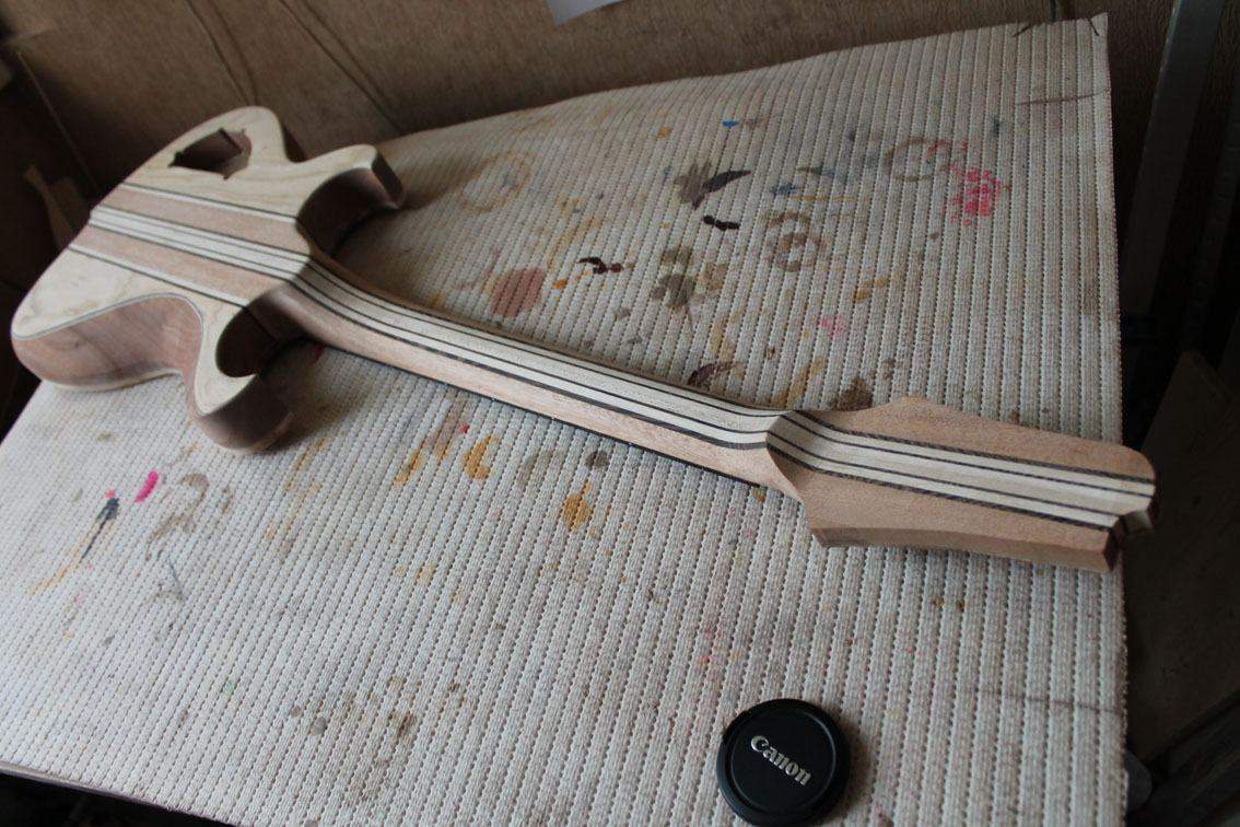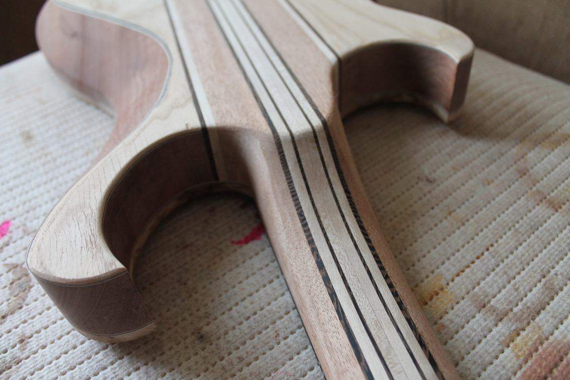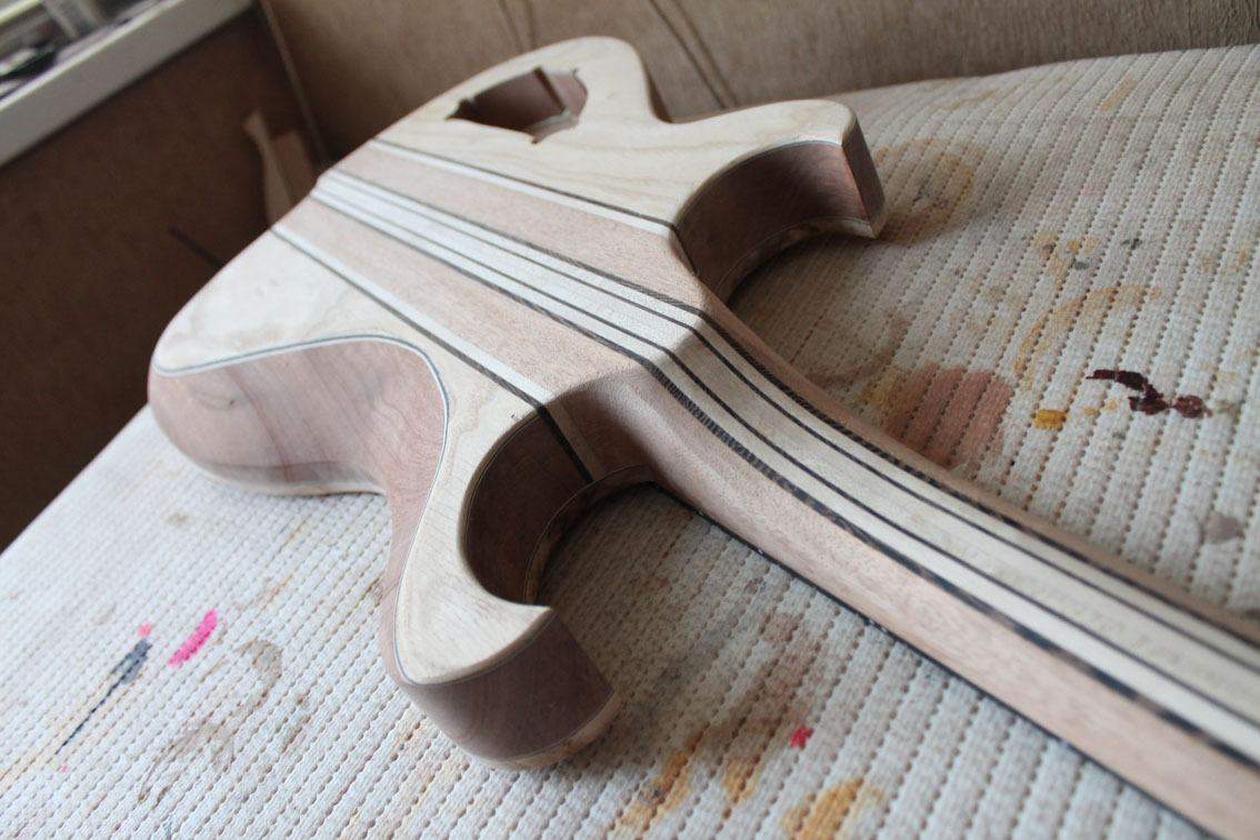 Не слишком ли много переклея.Все таки это прежде всего музыкальный инструмент.Даже на грифе (для стабильности и прочности)беребор не всегда оправдан.А на корпусе и подавно.Красота и оригинальность-явно в ущерб музакальной составляющей (читай основное).Клей в таком количестве-не лучший вариант, все таки он больше работает как демпфер между слоями.