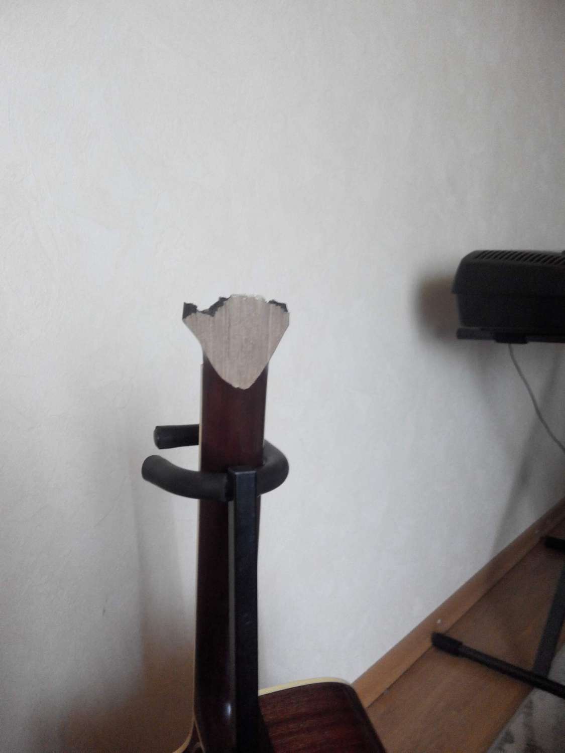 Случилось неприятное событие. При транспортировке гриф гитары "потерял голову"
