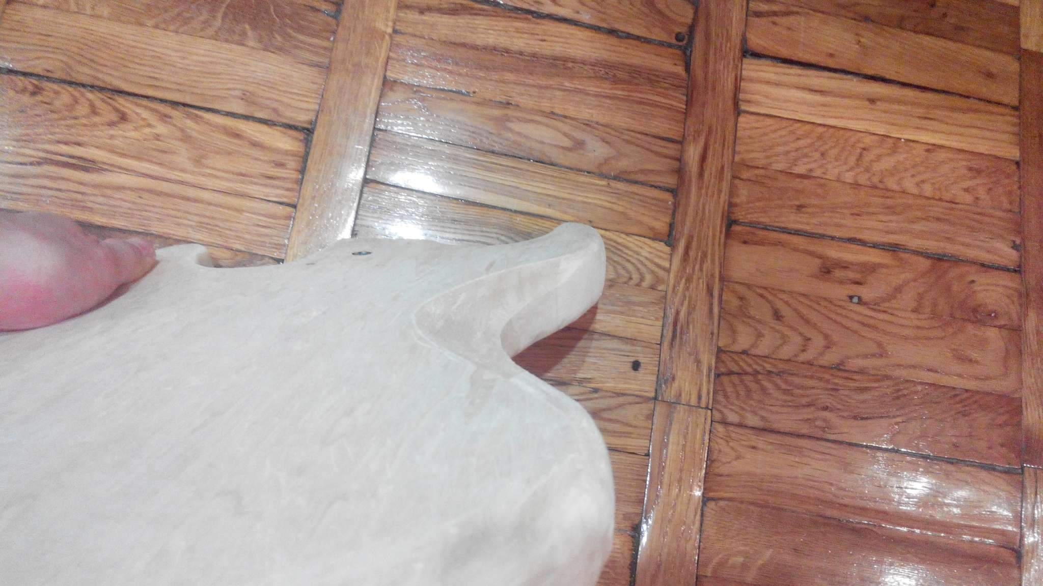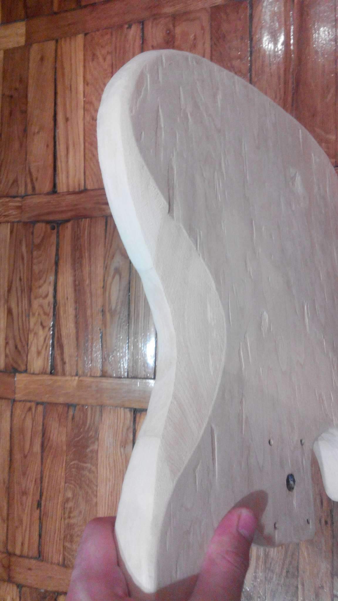 наибольший кусок древесины в деке - хорош, однако фрезеруя попал на стык с другим куском, а он рыхлый что ппц, за неимением шаблона, как и фрезы с подшипником, все делалось по чертежу на корпусе на глаз, ну и отлетела от того куска огромная щепа =(