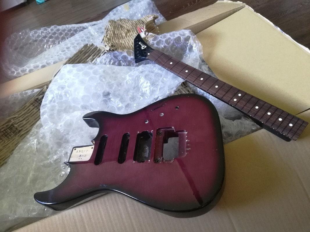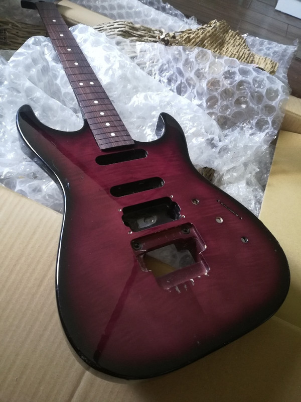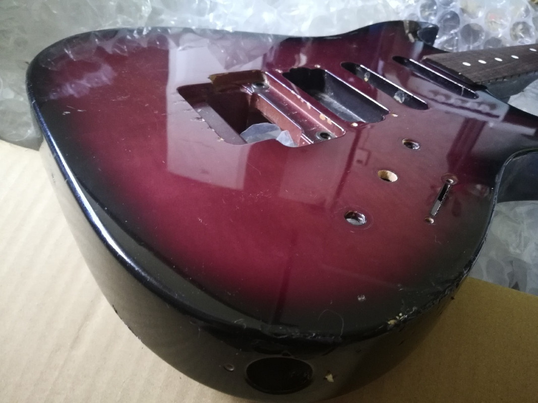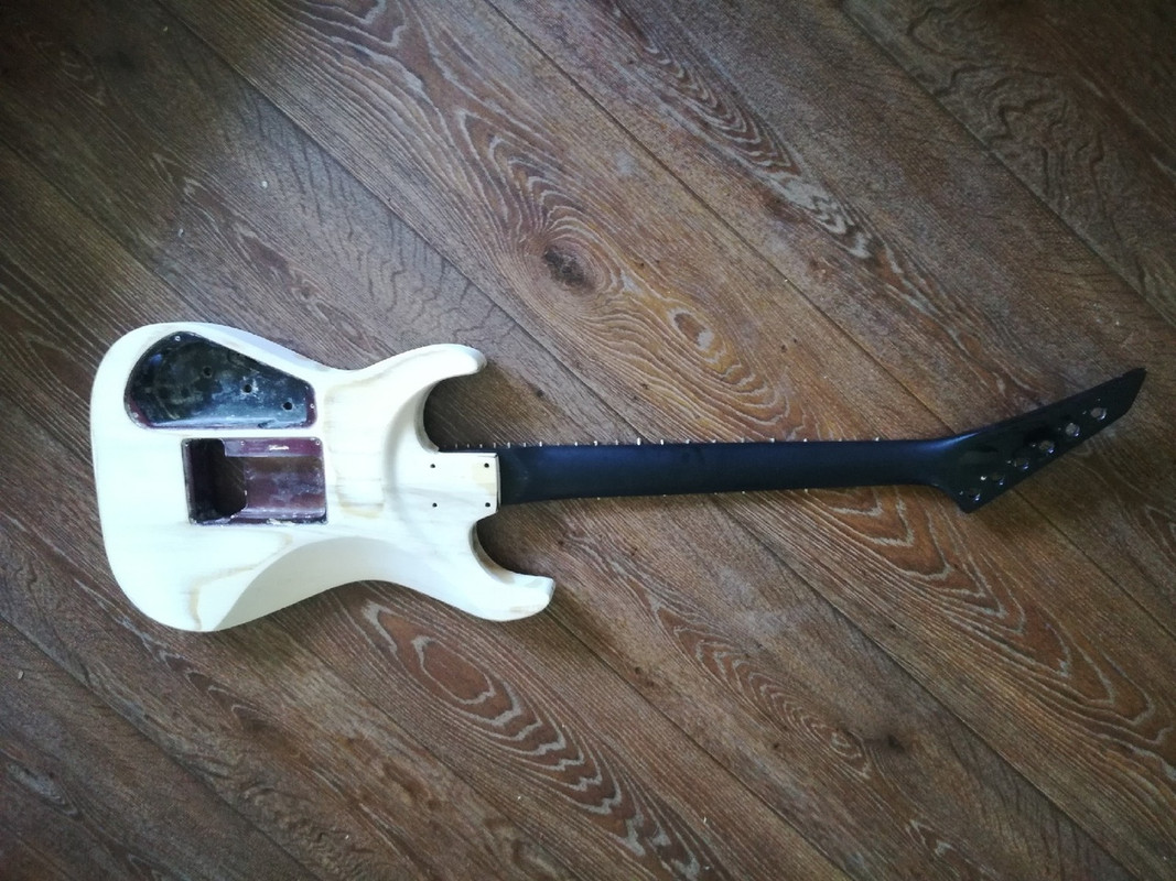 Что имели на самом деле-ровный (на удивление) гриф без ладов, с подубитой накладкой,покоцанный со всех сторон и везде корпус. Все повреждения не снимал, но я думаю и по таким фото понятно. А так же колки, флойд, топлок, в общем основная фурнитура была вся. Звучков не было.