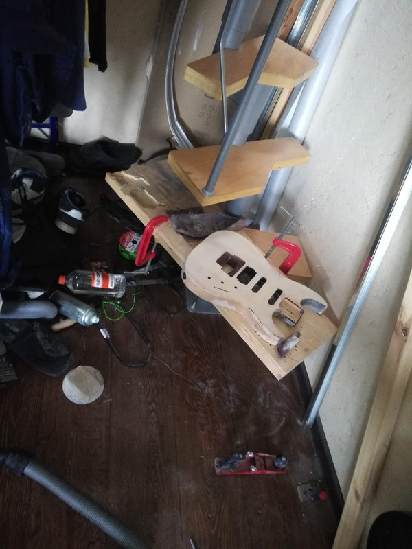 И самый главный косяк - в том что я косорукий чудак, решил задуть торцы накладки акриловым лаком после переладовки. Заклеил накладку, лады, сам гриф, оставил торцы. задул. Еще раз задул, и еще. Снимаю скотч-все протекло на накладку... Пытался тереть недолго уайт спиритом, и растворителем-все фигня полная. Плюнул. Залил всю накладку целиком лаком. С ладами. потом лады ободрал закатником. Ну ниче так вышло, но я хотел иначе. Но параллельно ищу родной гриф на нее. Ну или хотя бы клыкастый за вменяемые деньги. Для первого опыта мне очень большой урок.