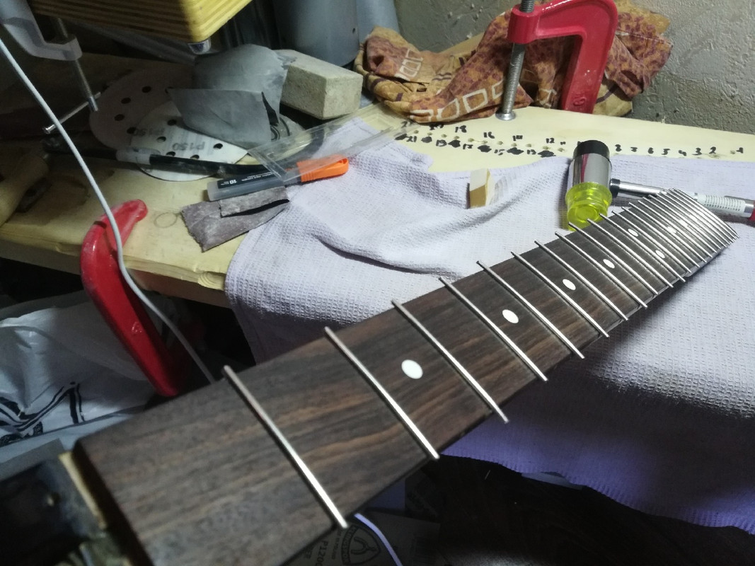 Я еще не распаял ее. А только очень аккуратно собрал не до конца вкручивая всё. Потому что она еще не досохла. Натянул струны чтоб гриф привыкал к нагрузке с новыми ладами, ну и побрякал проверяя параллельность ладов.