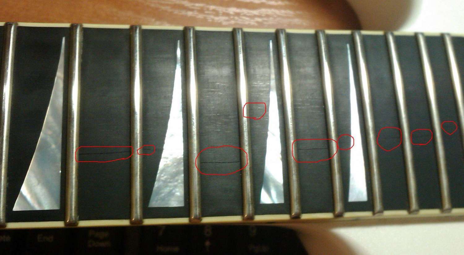 Нормально можно убрать только при замене ладов, чтоб залить и можно было нормально вышлифовать. Я бы не трогал до плановой смены ладов (у самого на гитаре есть огрехи на накладке, правда с инкрустацией -- посовещался с мастером, оставили до переладовки), но озаботился условиями содержания. Следишь ли за влажностью в месте хранения или хотя бы в кофре? Зима пришла...