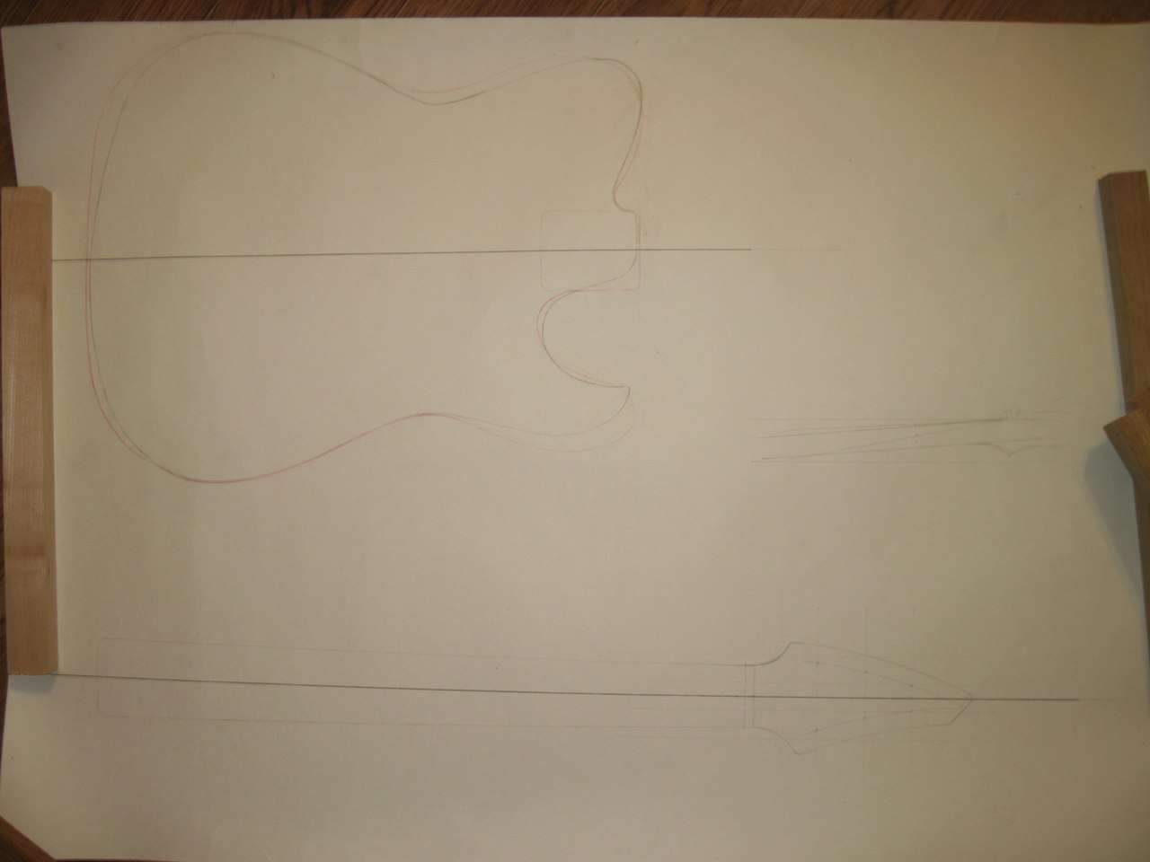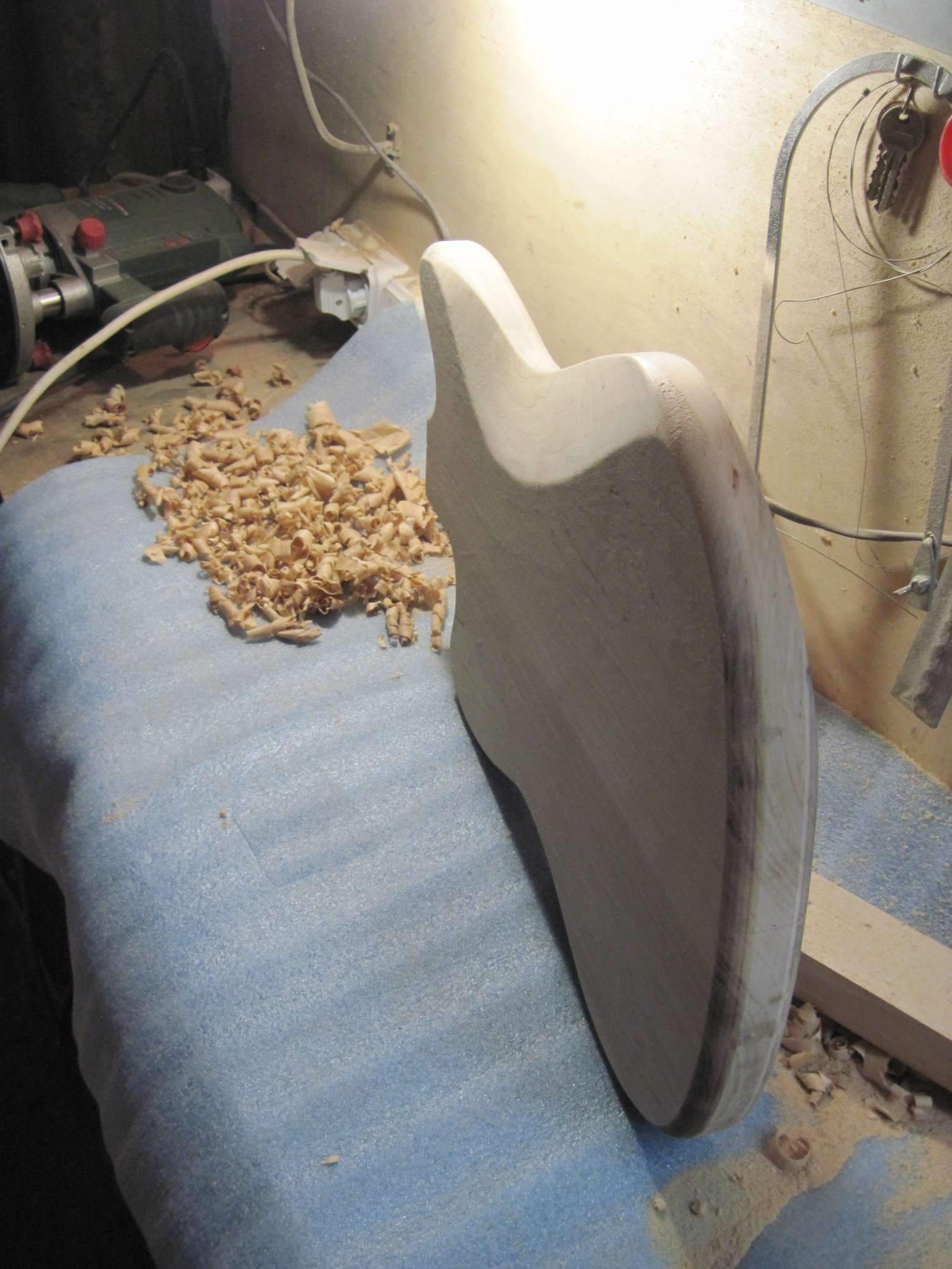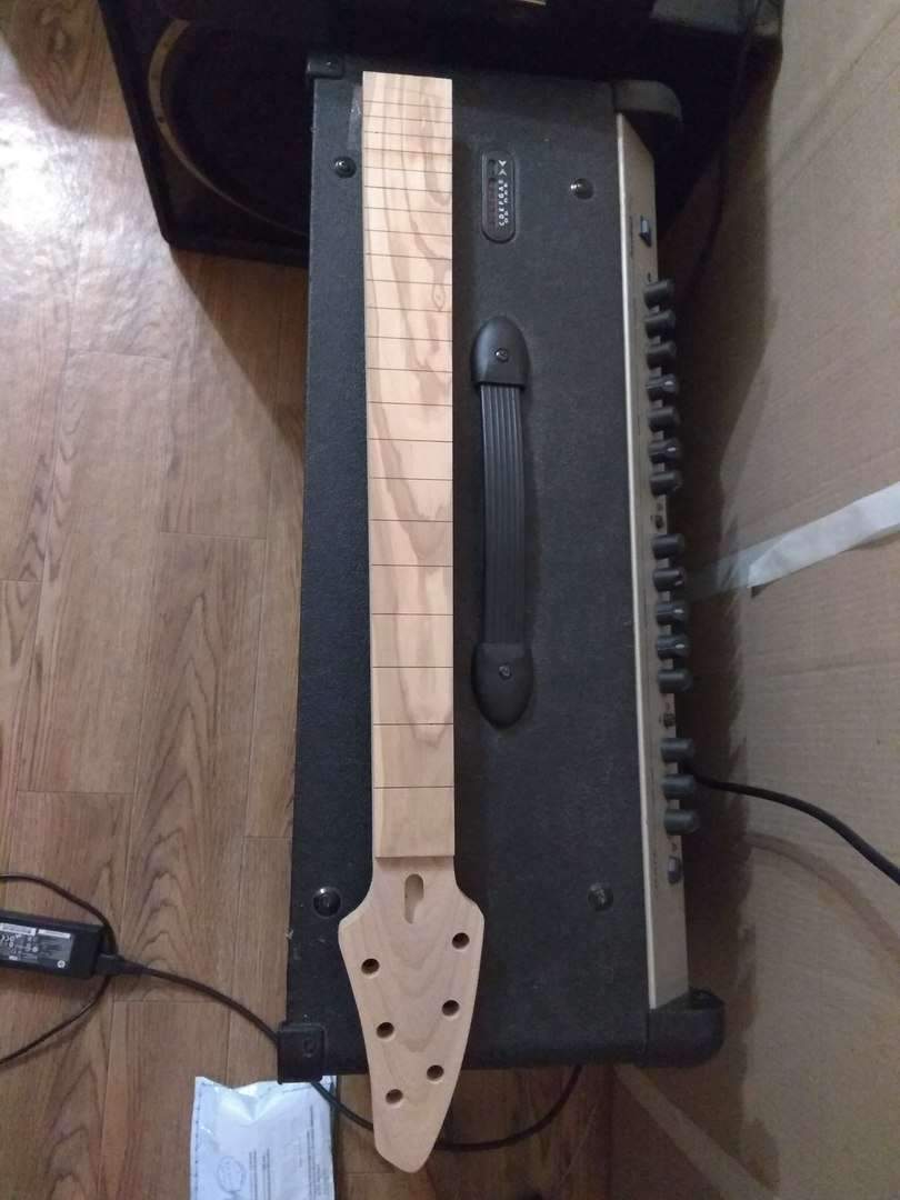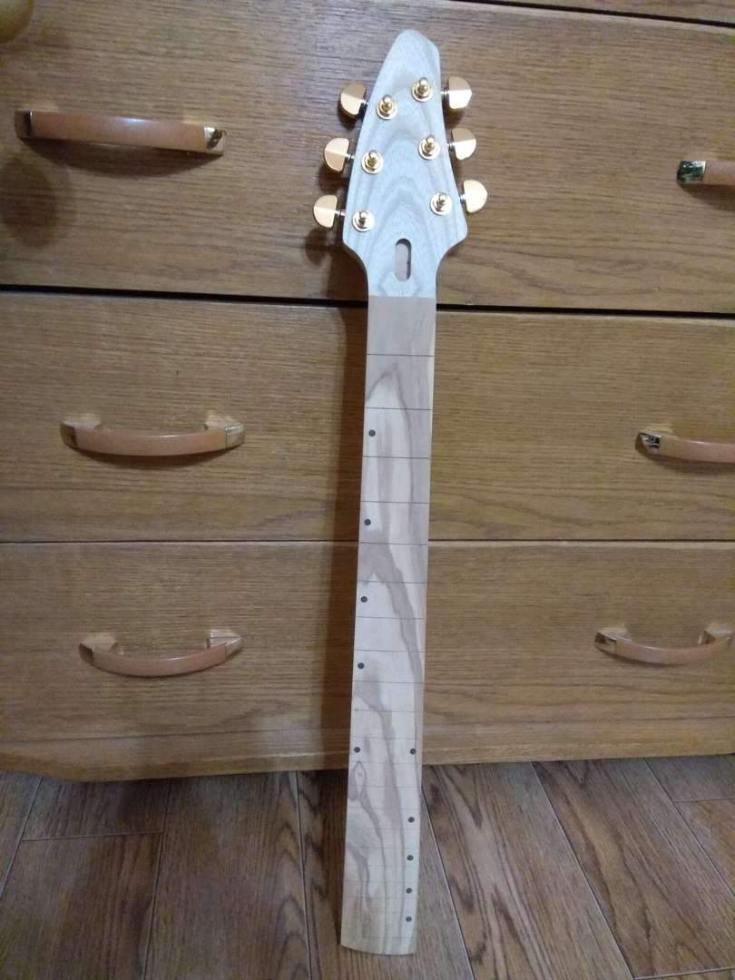 Здравствуйте, Всем. Хочу поделиться своим экспериментом, если можно так сказать. Решил сделать электрогитару. На листе бумаги, отталкиваясь от контуров телековского корпуса, нарисовал что то, что мне понравилось. Работа началась с изготовления грифа. Он переклей ироко и клена с накладкой из оливкового дерева.