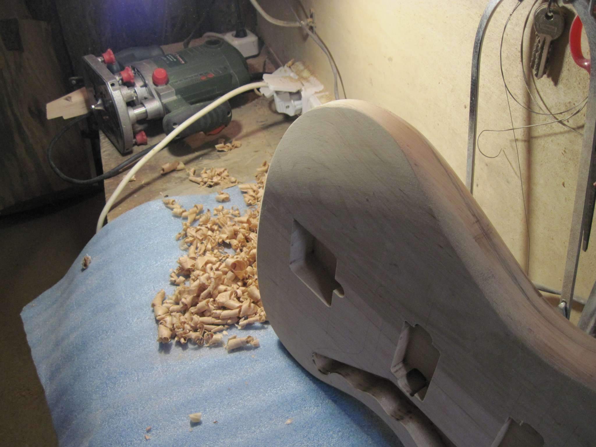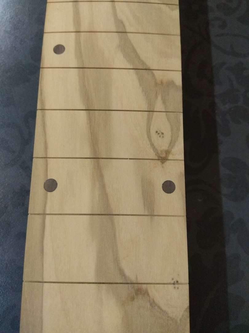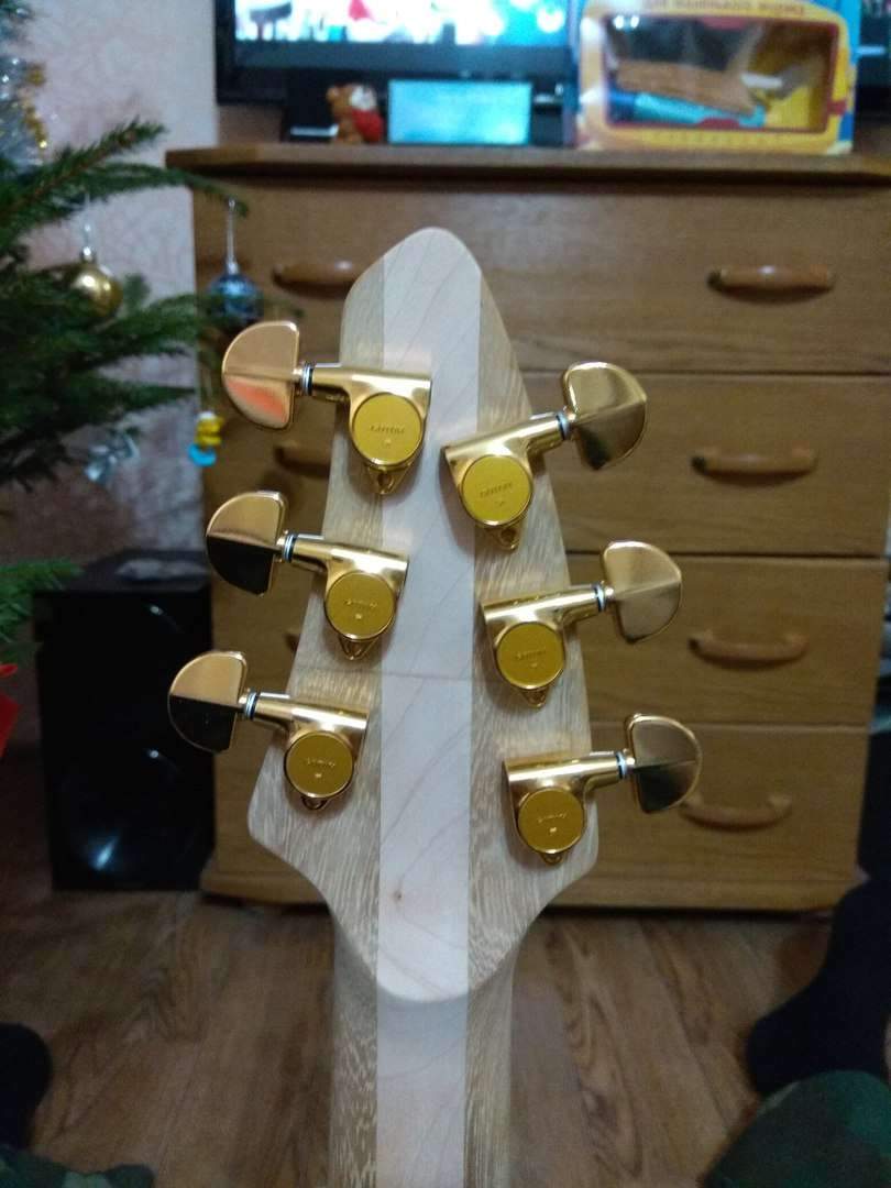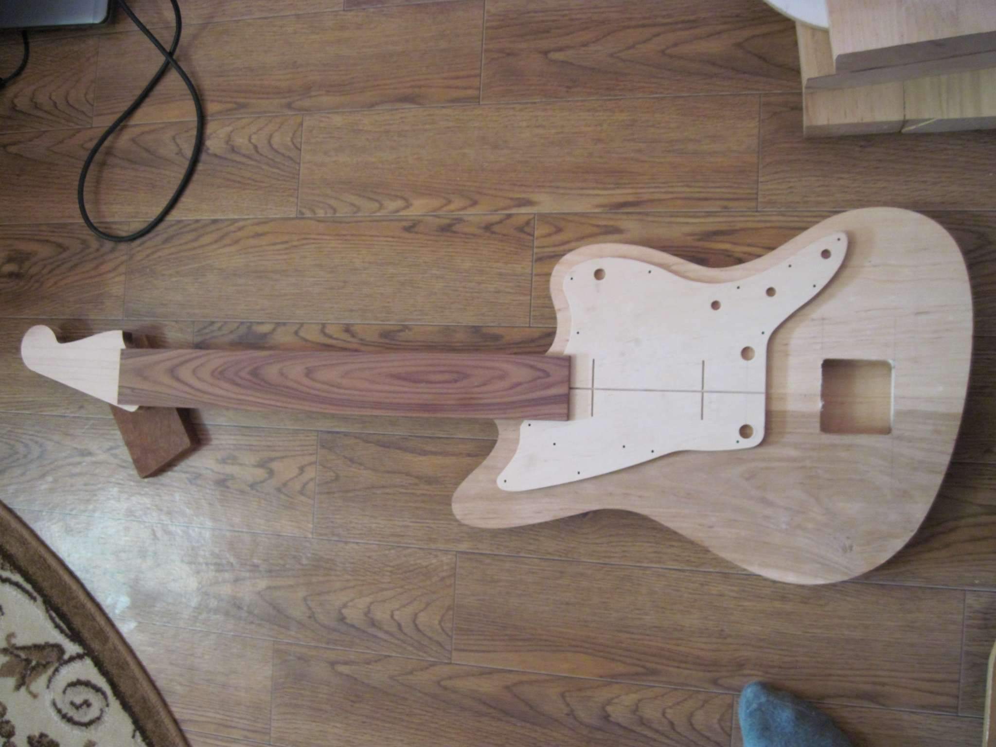 Здравствуйте, Всем. Хочу поделиться своим экспериментом, если можно так сказать. Решил сделать электрогитару. На листе бумаги, отталкиваясь от контуров телековского корпуса, нарисовал что то, что мне понравилось. Работа началась с изготовления грифа. Он переклей ироко и клена с накладкой из оливкового дерева.