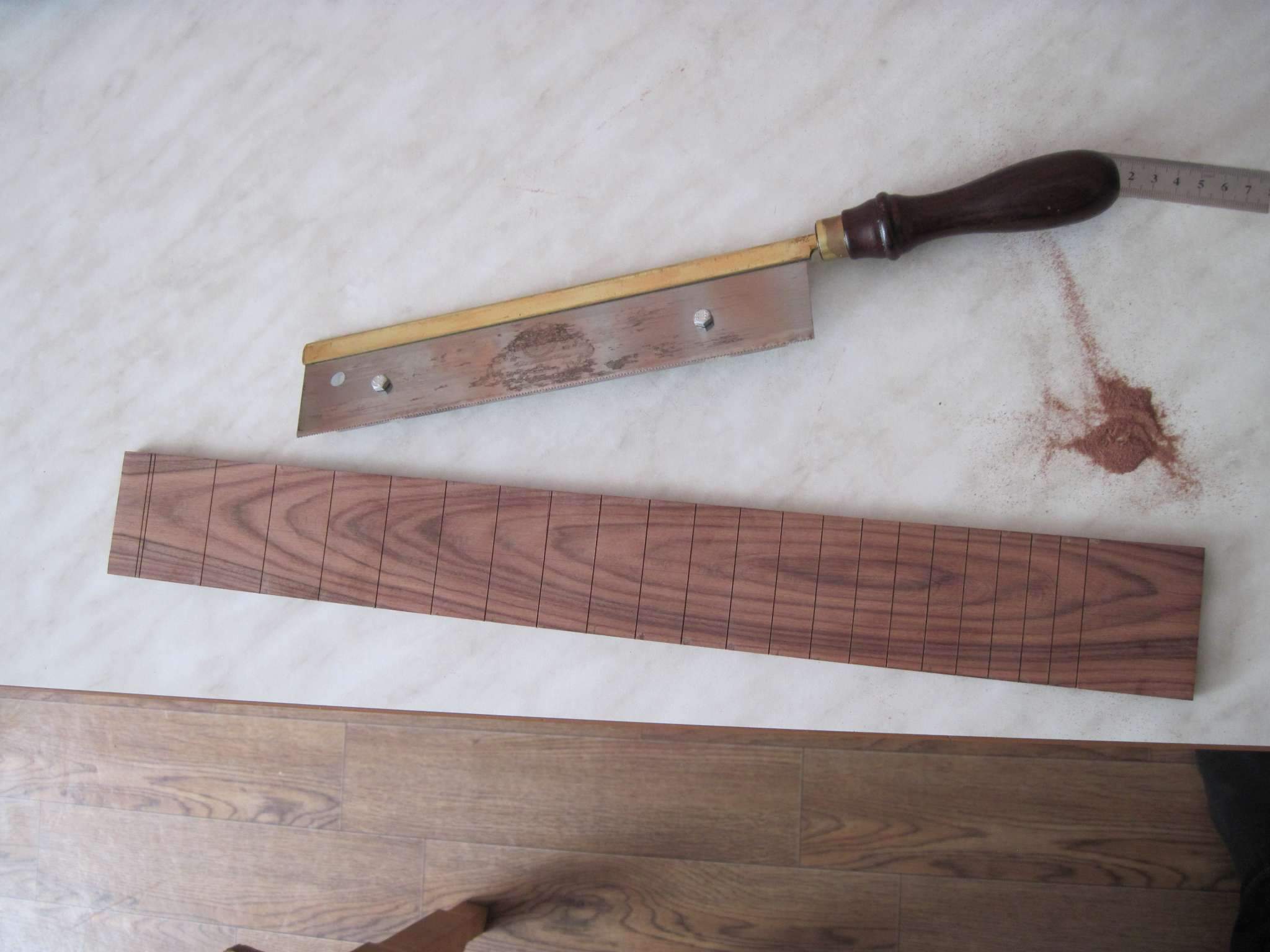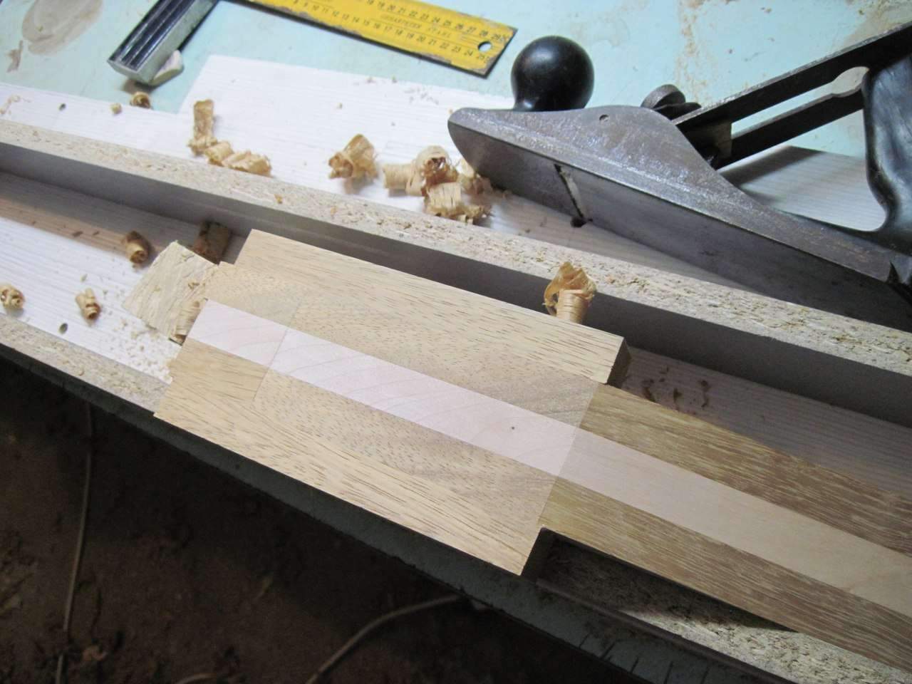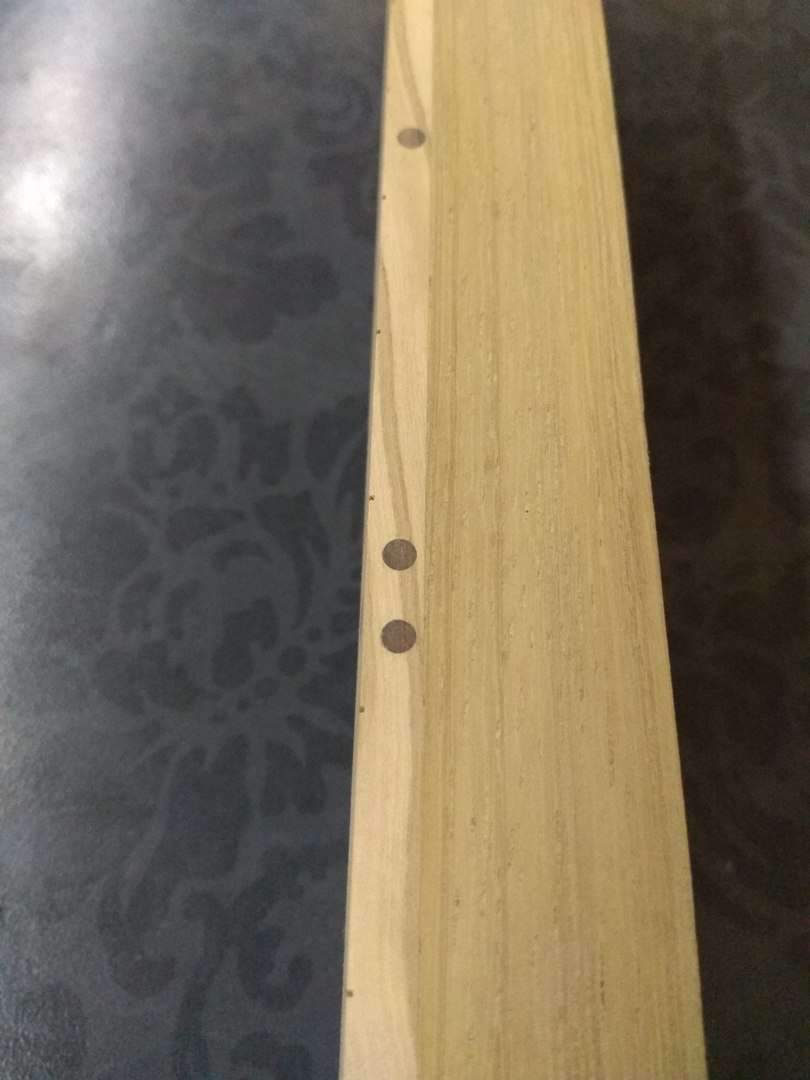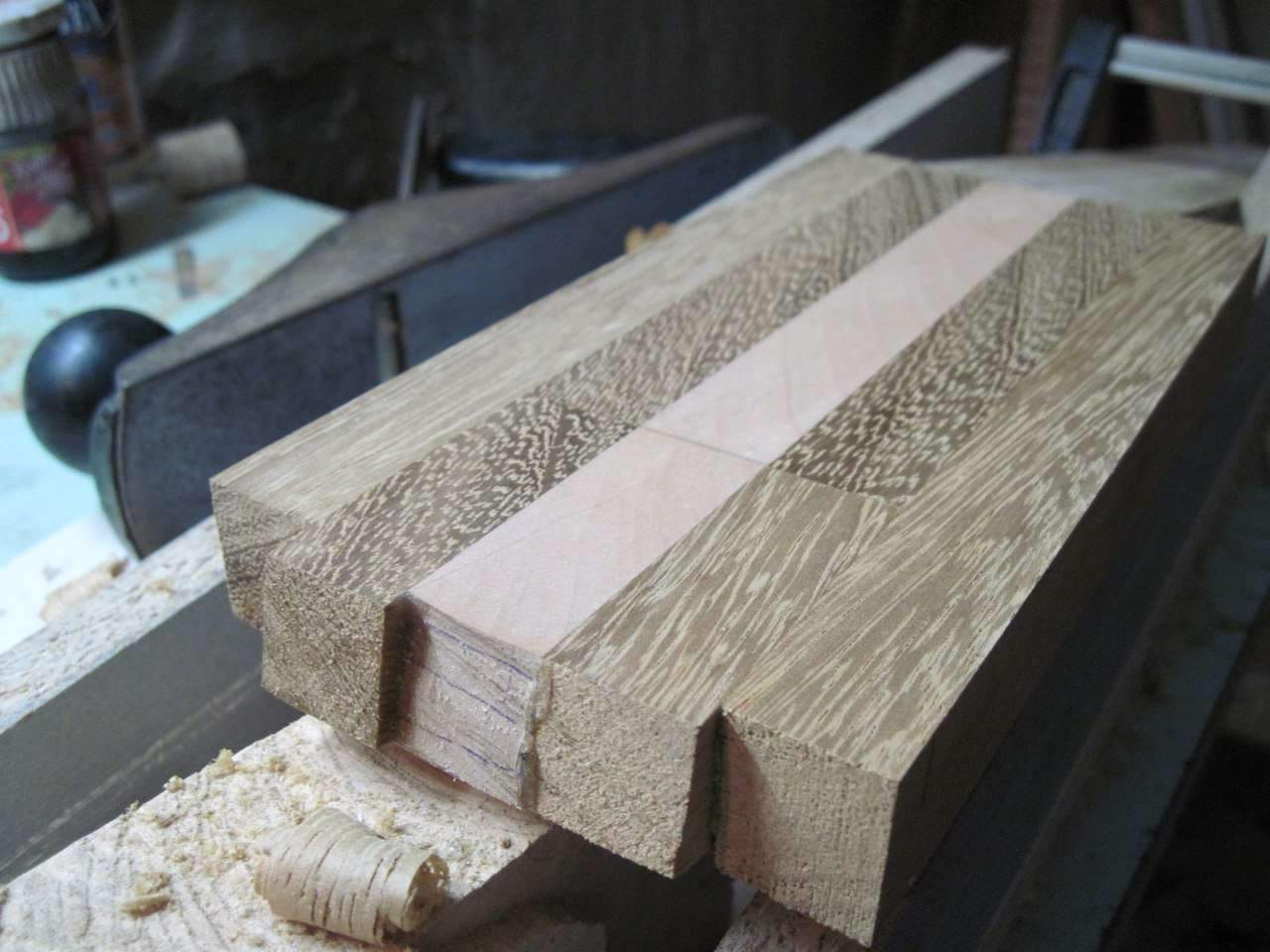 Здравствуйте, Всем. Хочу поделиться своим экспериментом, если можно так сказать. Решил сделать электрогитару. На листе бумаги, отталкиваясь от контуров телековского корпуса, нарисовал что то, что мне понравилось. Работа началась с изготовления грифа. Он переклей ироко и клена с накладкой из оливкового дерева.
