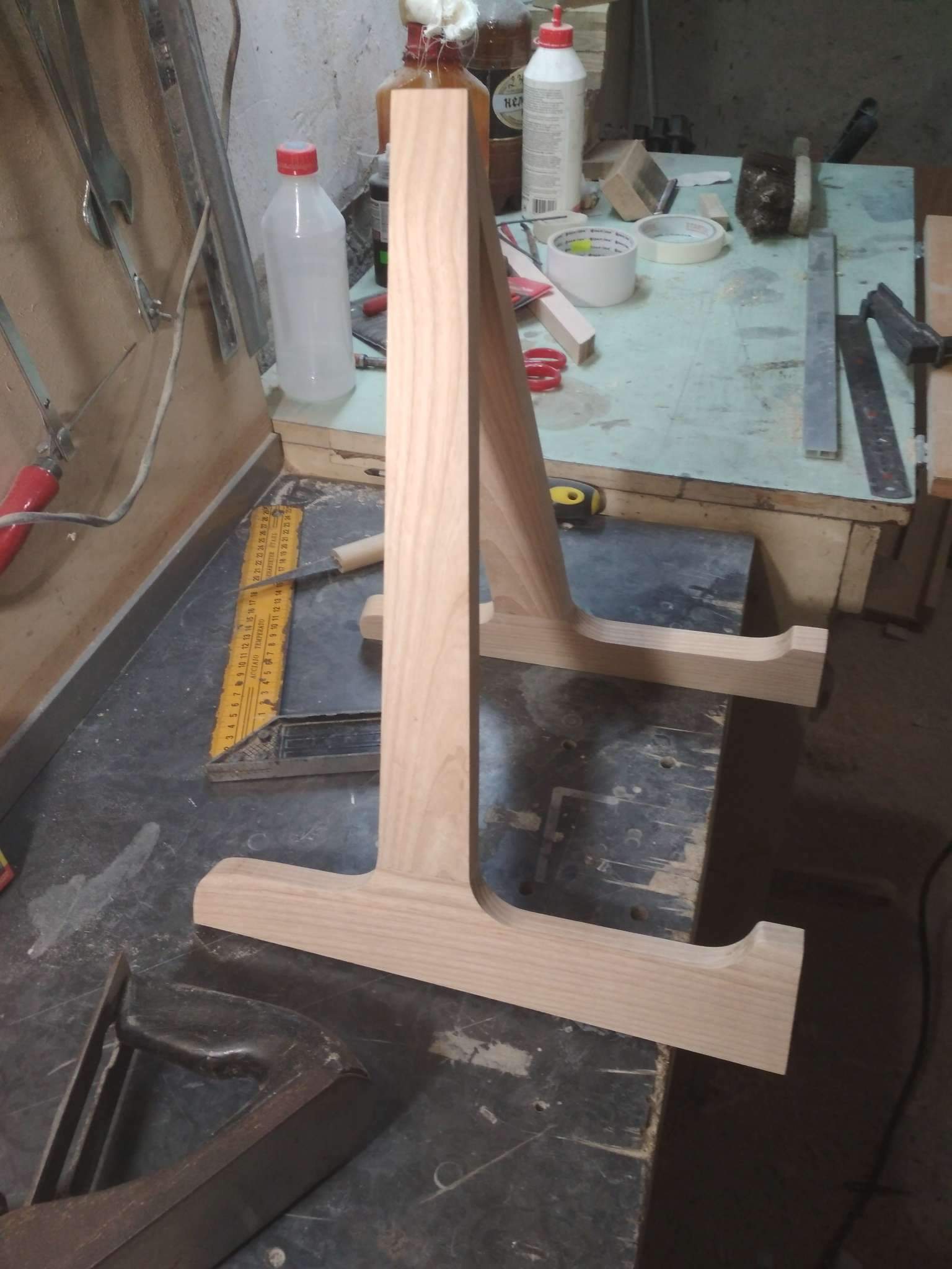 Доброго) решил сделать гитарную стойку из дерева. В принципе, ничего особенного. Конструкция обычная. Задача новая) Стойка будет из ясеня. Сделал две т-образные заготовки, соединил детали на шип. Отрисовал контуры половинок и обработал. Эти детали будут соединены через подвижный узел. Части которого будут сделаны из ореха. Сейчас орех приклеивается. Ну, а дальше будем сочинять что да как...
