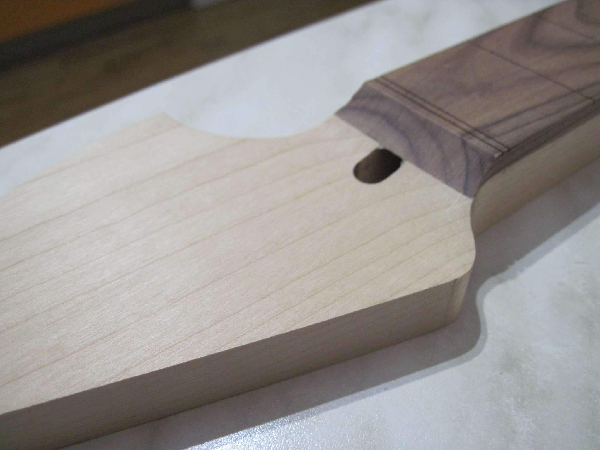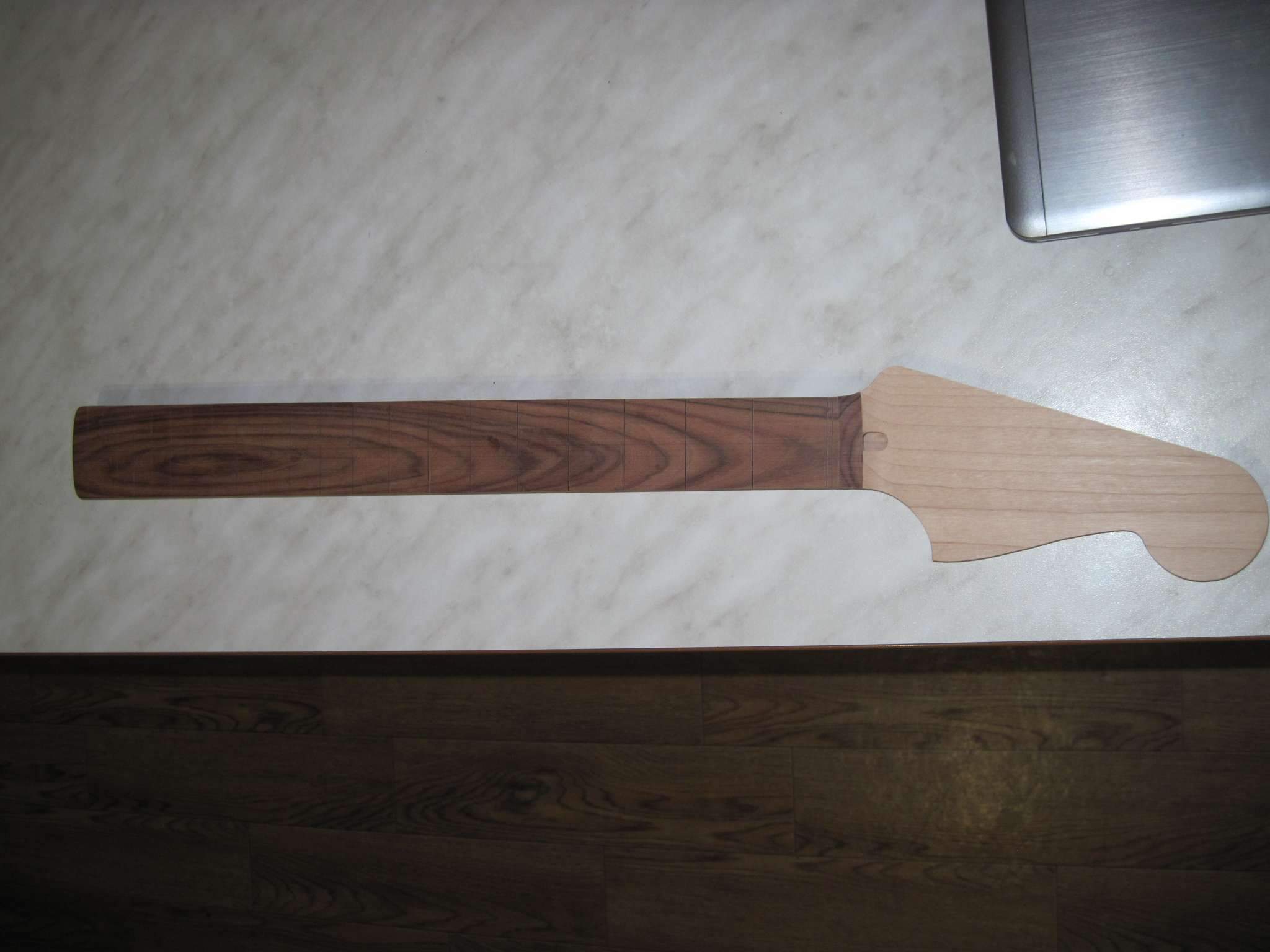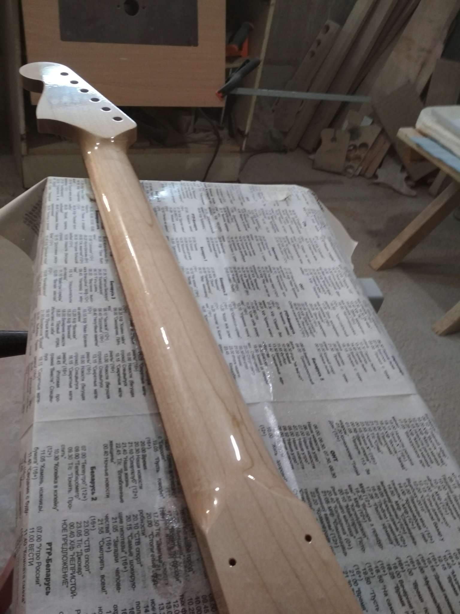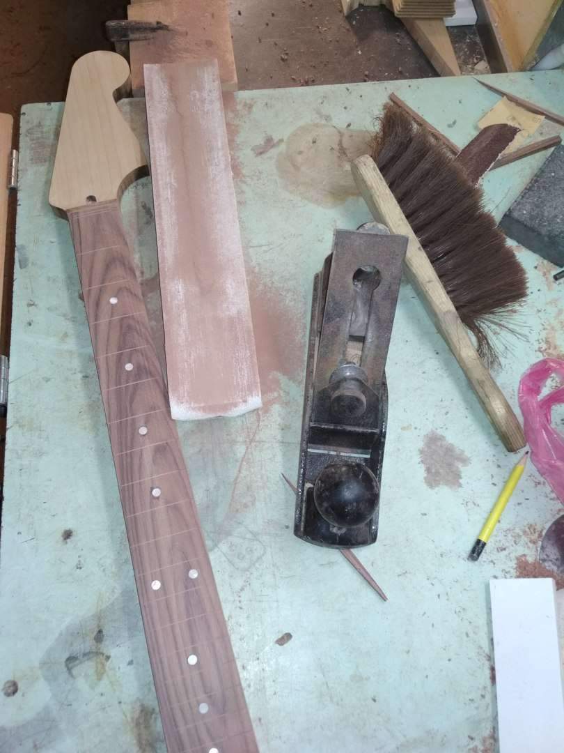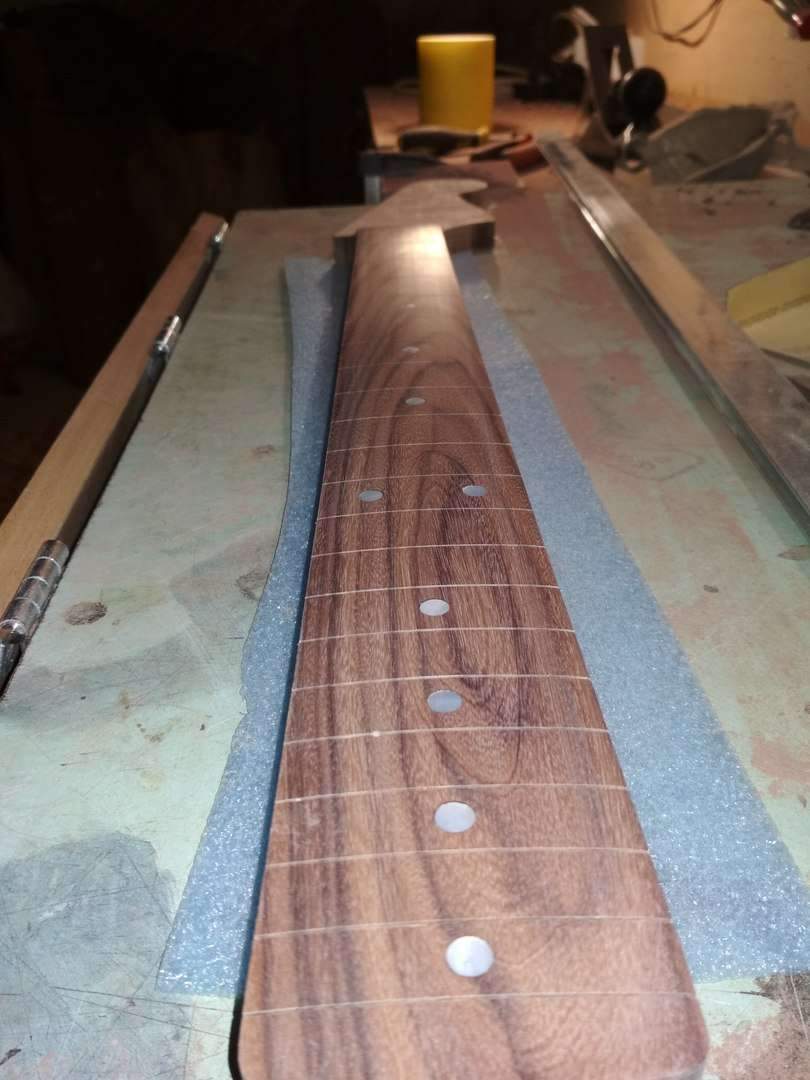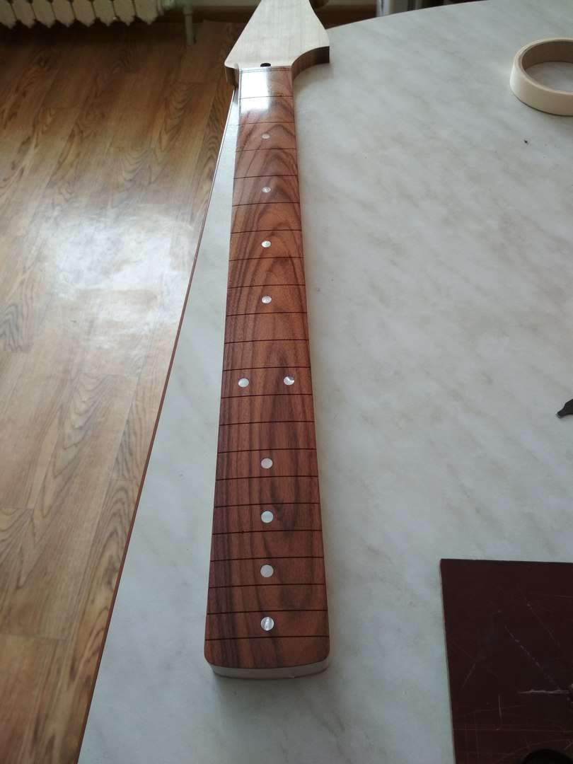 Schmeller, Я еще и маслом покрыл, но не лимонным как обычно все делают, а типа датским, тонким слоем. Когда оно высохло я растер его фетром, после этого она стала немного матовой на вид но приятной, гладкой на ощупь. Сделал так чтобы закрыть слегка им поры в палисандре и чуть цвет его чтоб изменился. Сейчас накладку я заклеил малярной лентой, чтобы на нее пыль не лезла. Когда гриф полностью будет завершен располирую накладку тем же фетром.