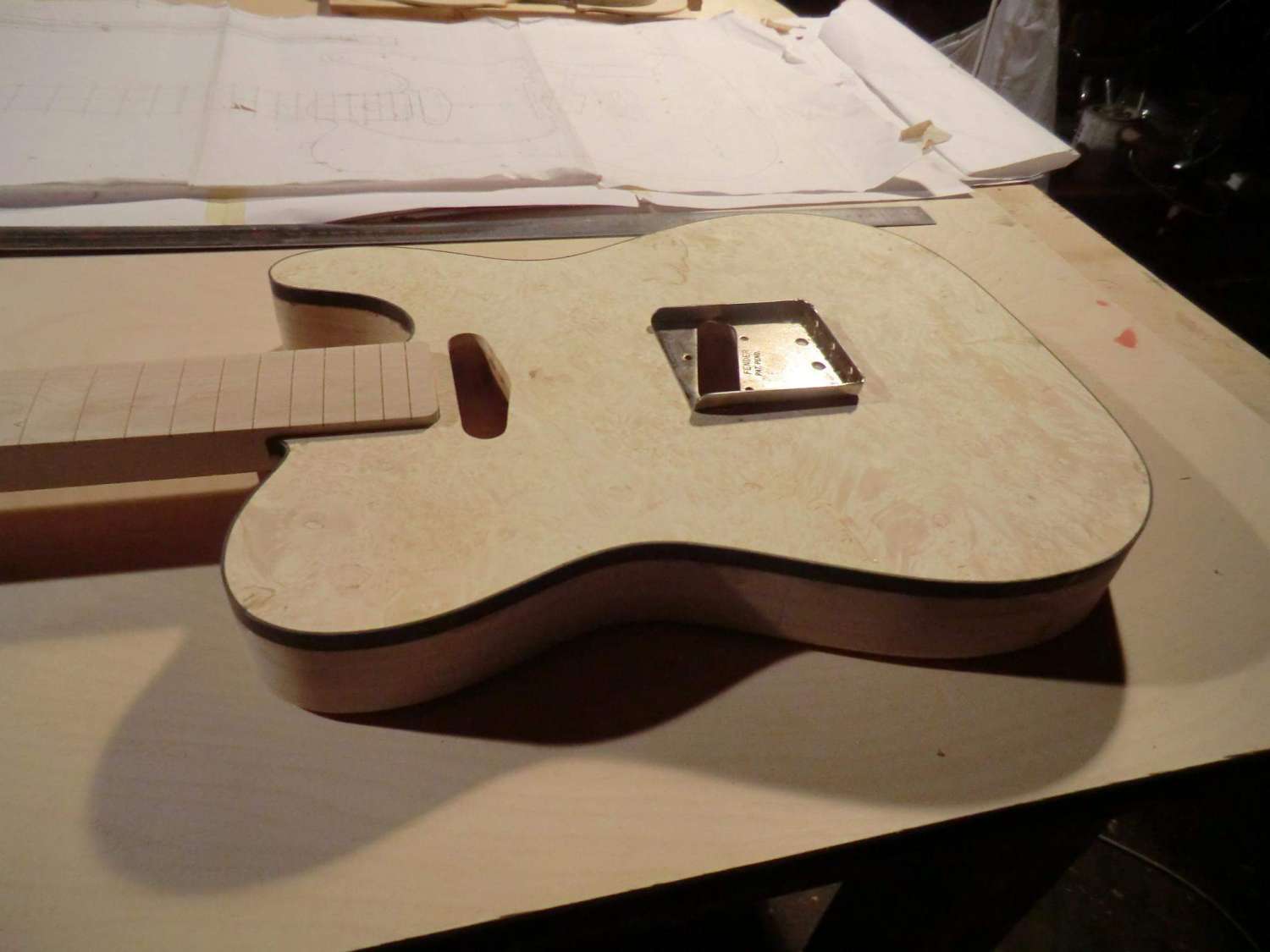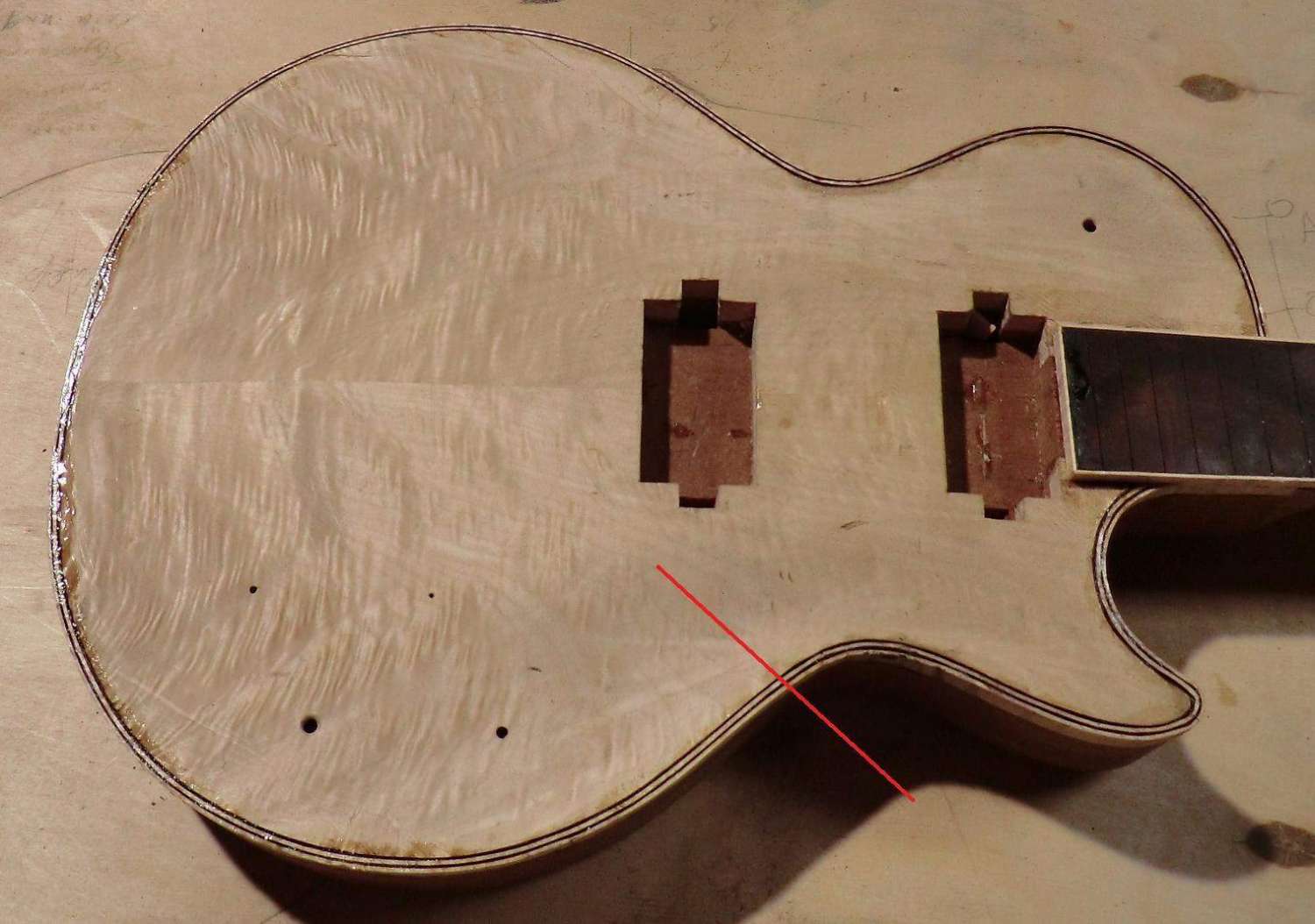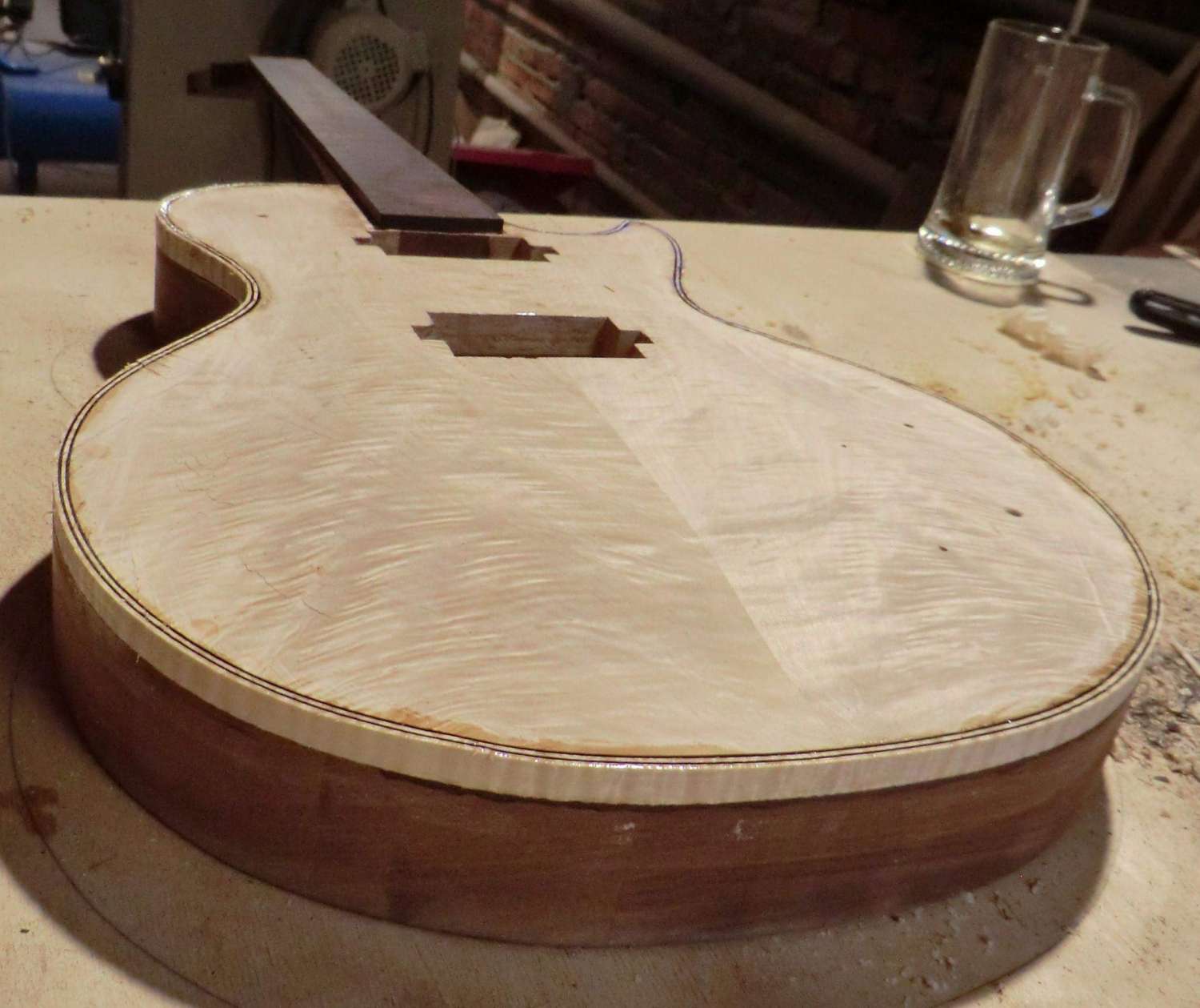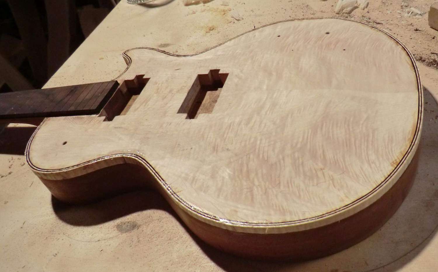 Сегодня выполнил кант на деке LP. Четверть под кант фрезеровал, дорезал ножом. Пластику предпочел венге, в сочетании с дикобезумноволнистым кленом, не скрою были сложности, клен оказался очень хрупким поперек волокон, а венге вдоль. Композиция так же своя, навеяна классическим скрипичным эбеновокленовым усом.