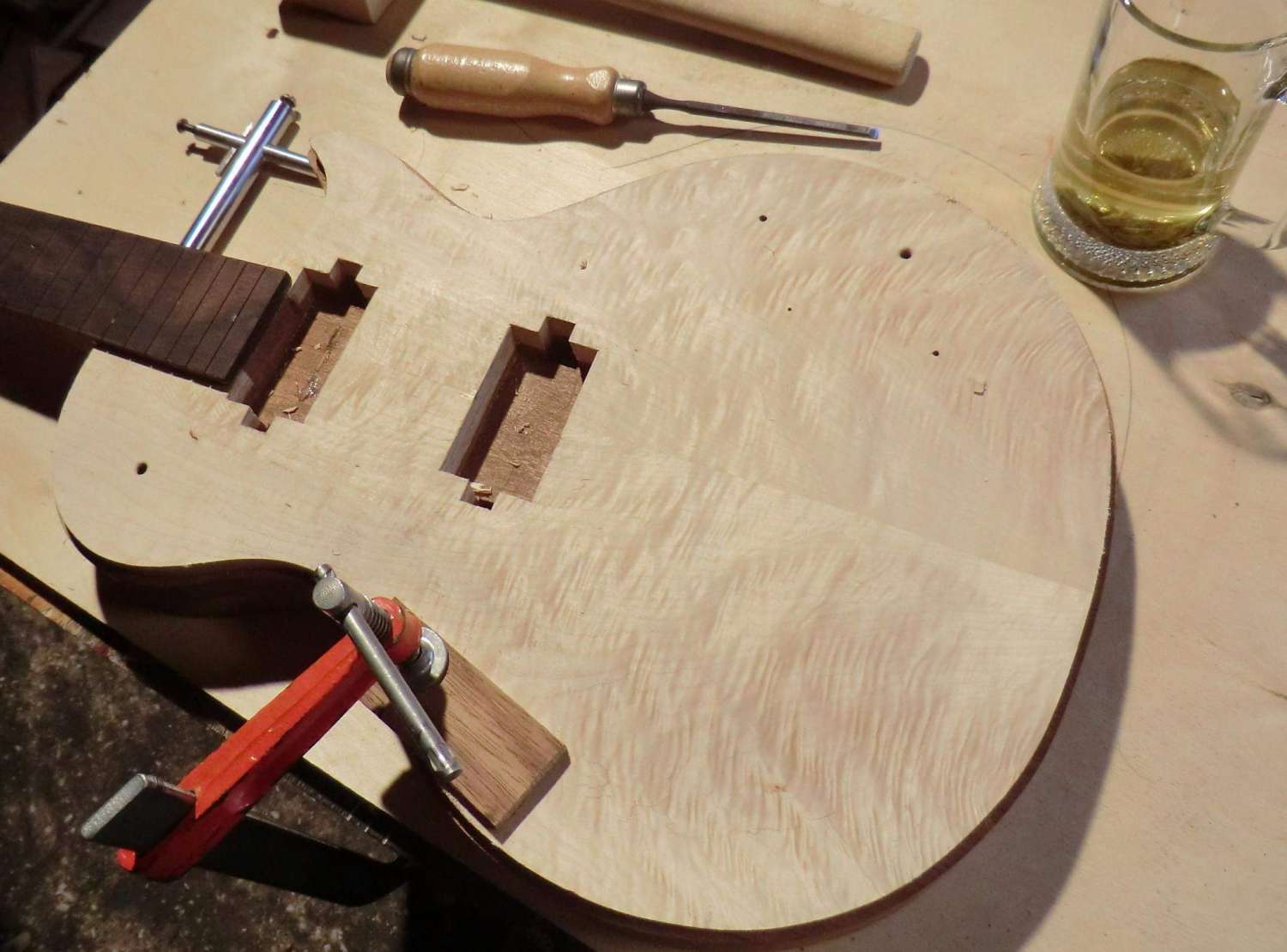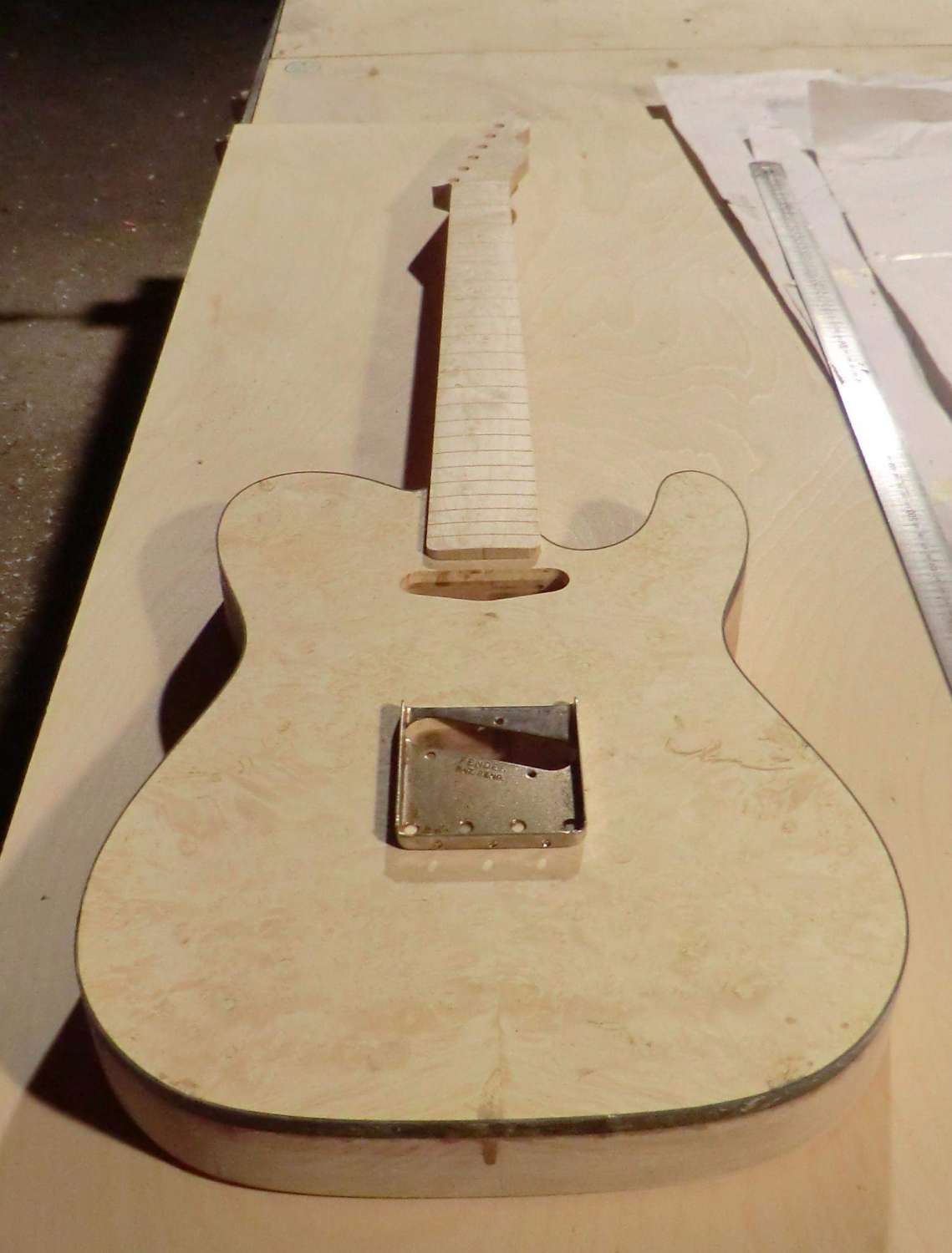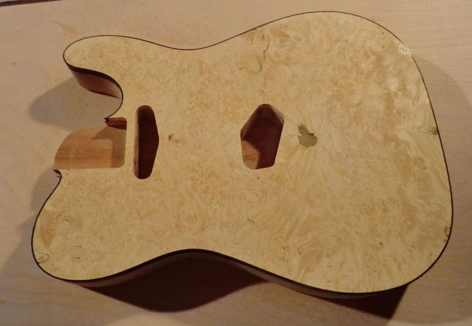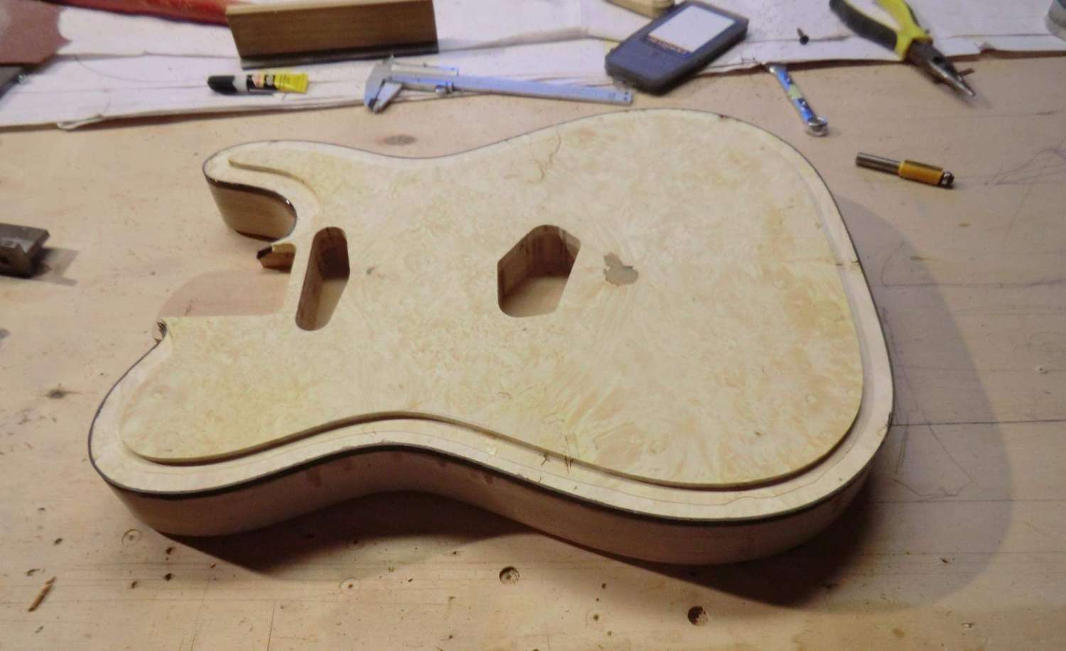 Сегодня выполнил кант на деке LP. Четверть под кант фрезеровал, дорезал ножом. Пластику предпочел венге, в сочетании с дикобезумноволнистым кленом, не скрою были сложности, клен оказался очень хрупким поперек волокон, а венге вдоль. Композиция так же своя, навеяна классическим скрипичным эбеновокленовым усом.