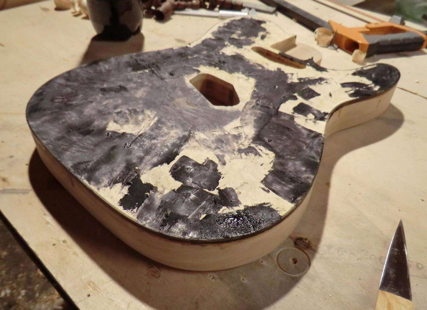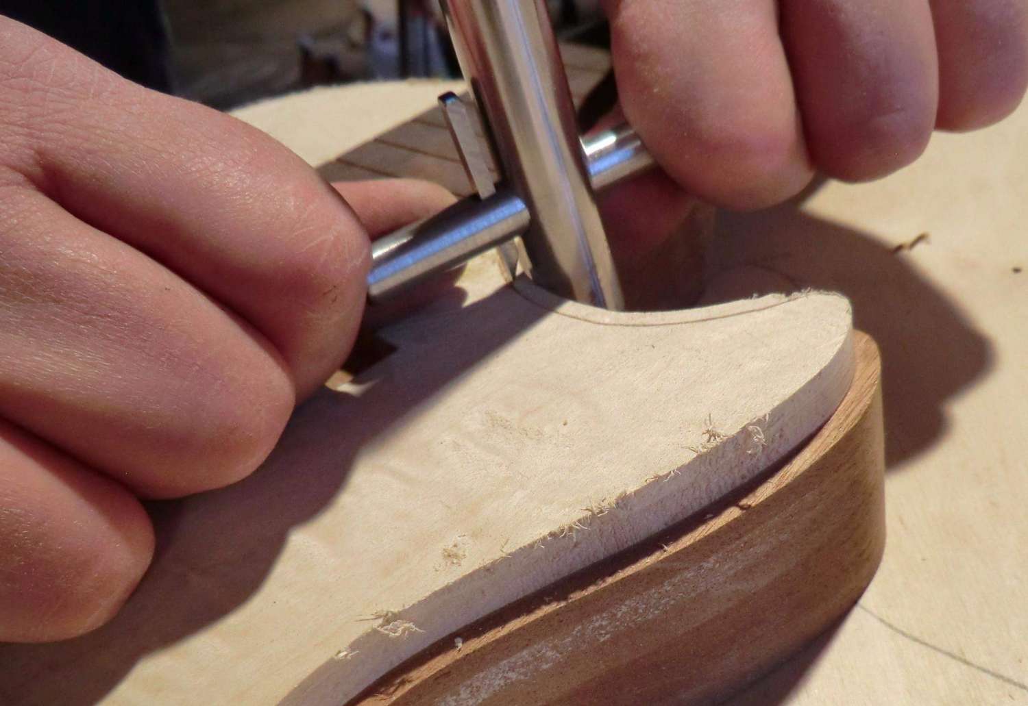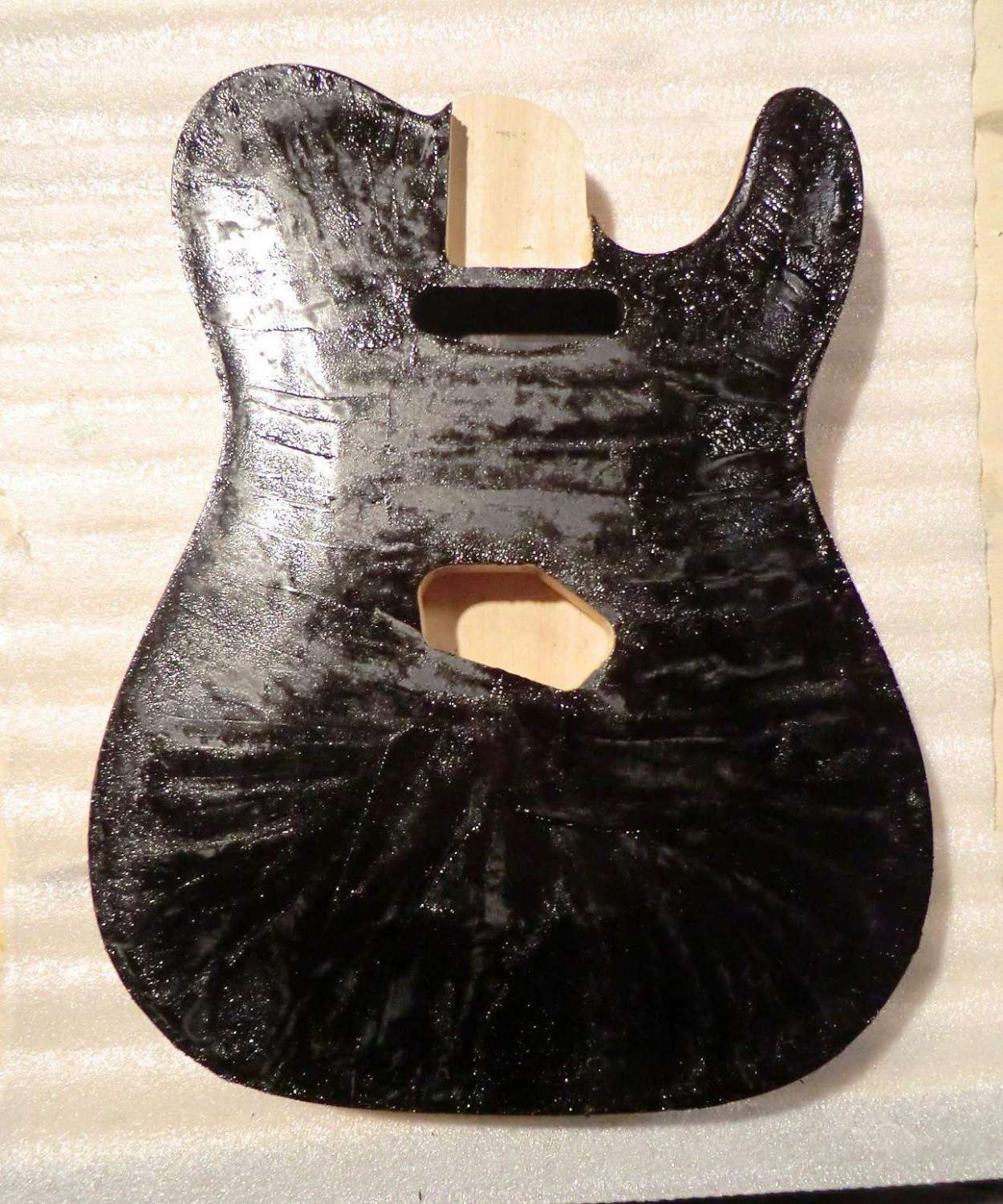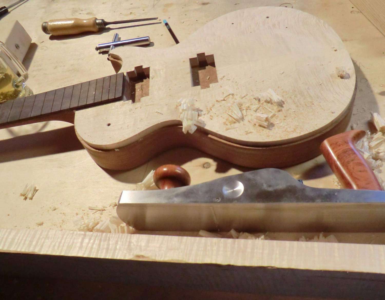 Сегодня выполнил кант на деке LP. Четверть под кант фрезеровал, дорезал ножом. Пластику предпочел венге, в сочетании с дикобезумноволнистым кленом, не скрою были сложности, клен оказался очень хрупким поперек волокон, а венге вдоль. Композиция так же своя, навеяна классическим скрипичным эбеновокленовым усом.