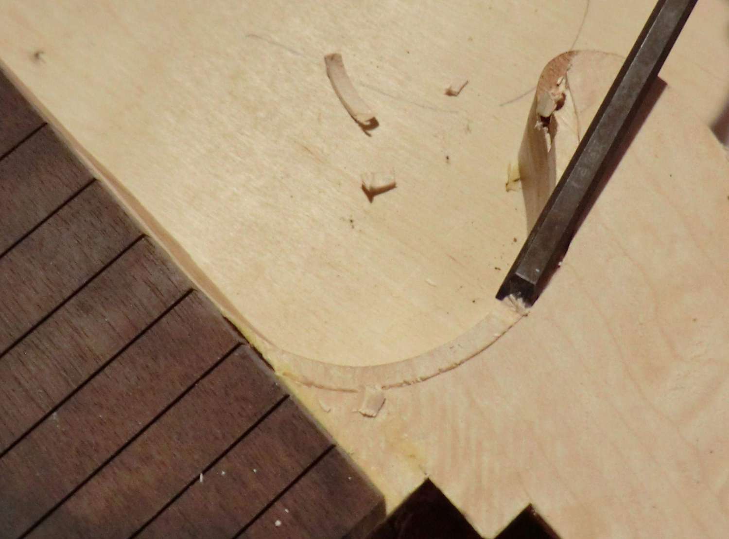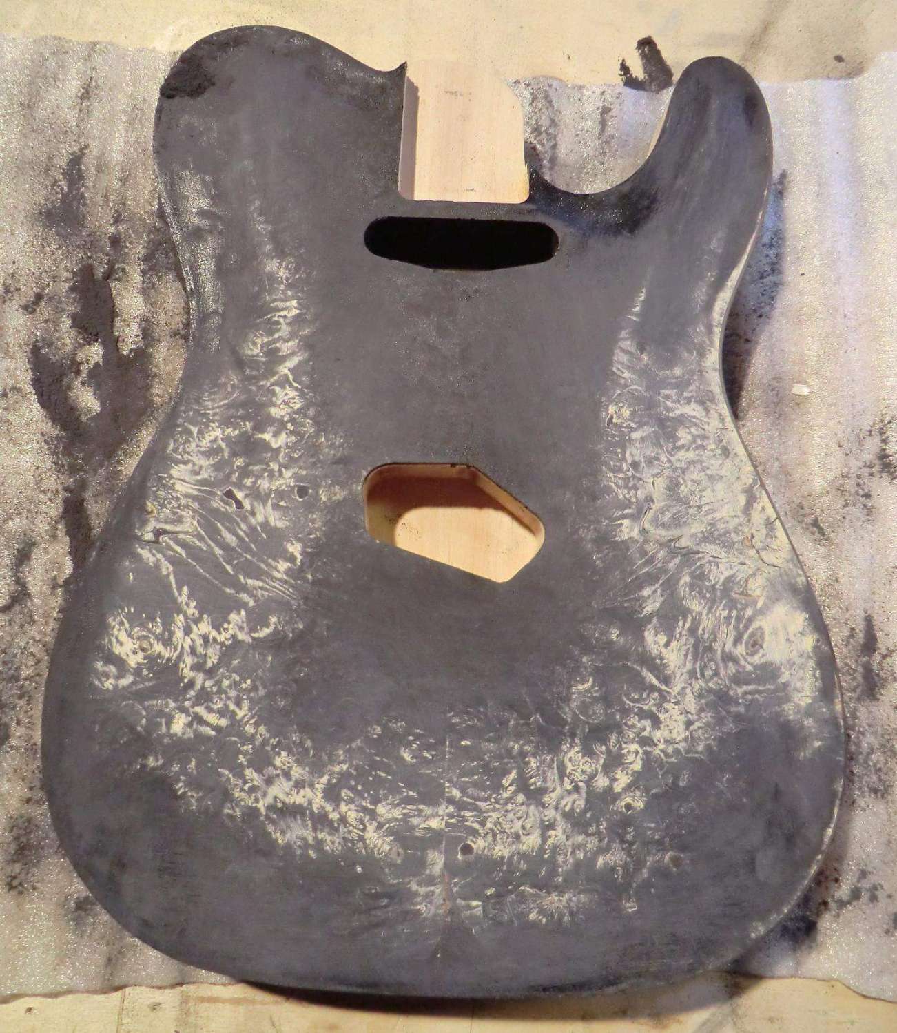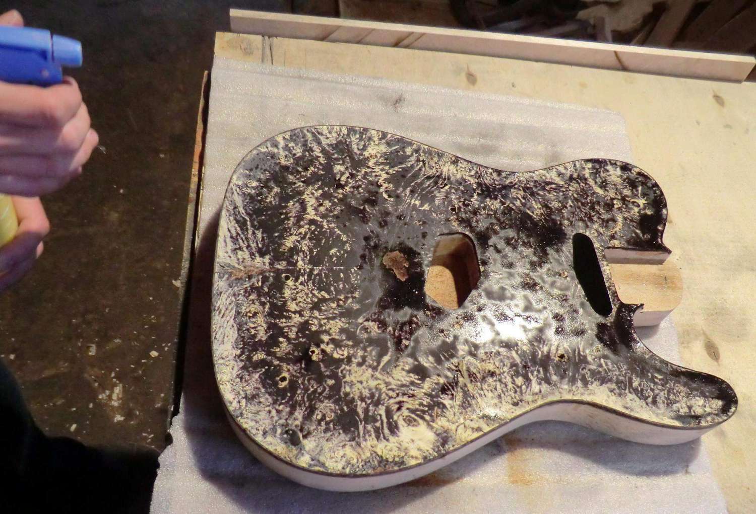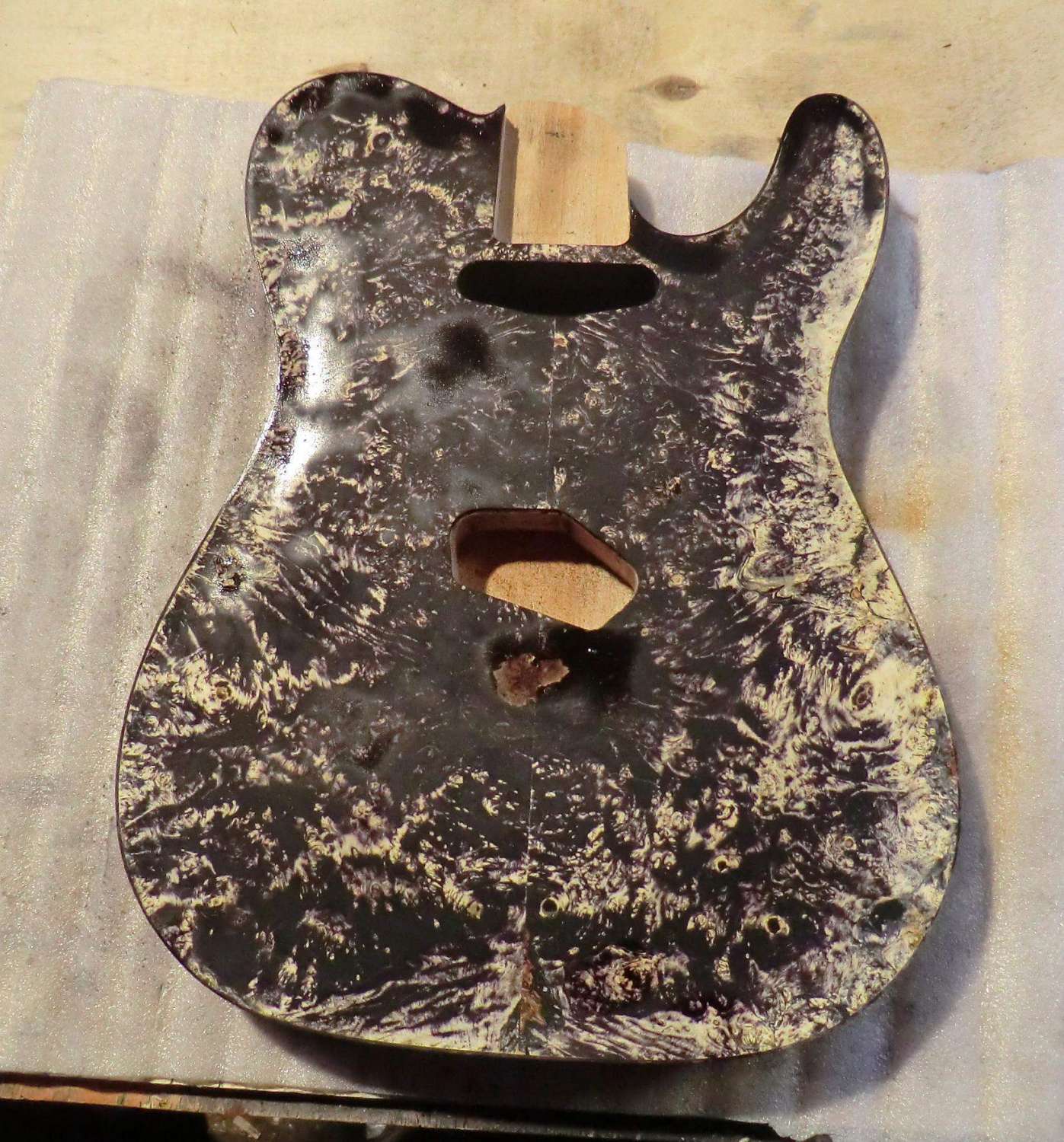 Сегодня выполнил кант на деке LP. Четверть под кант фрезеровал, дорезал ножом. Пластику предпочел венге, в сочетании с дикобезумноволнистым кленом, не скрою были сложности, клен оказался очень хрупким поперек волокон, а венге вдоль. Композиция так же своя, навеяна классическим скрипичным эбеновокленовым усом.