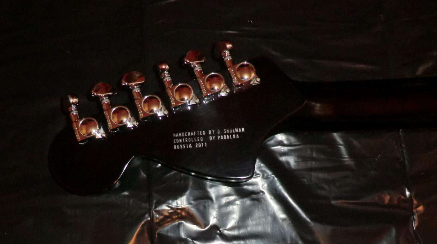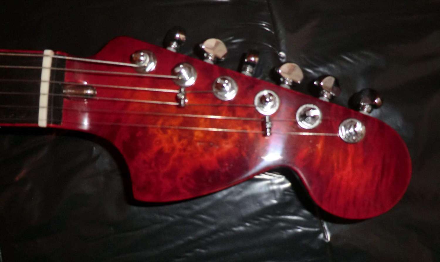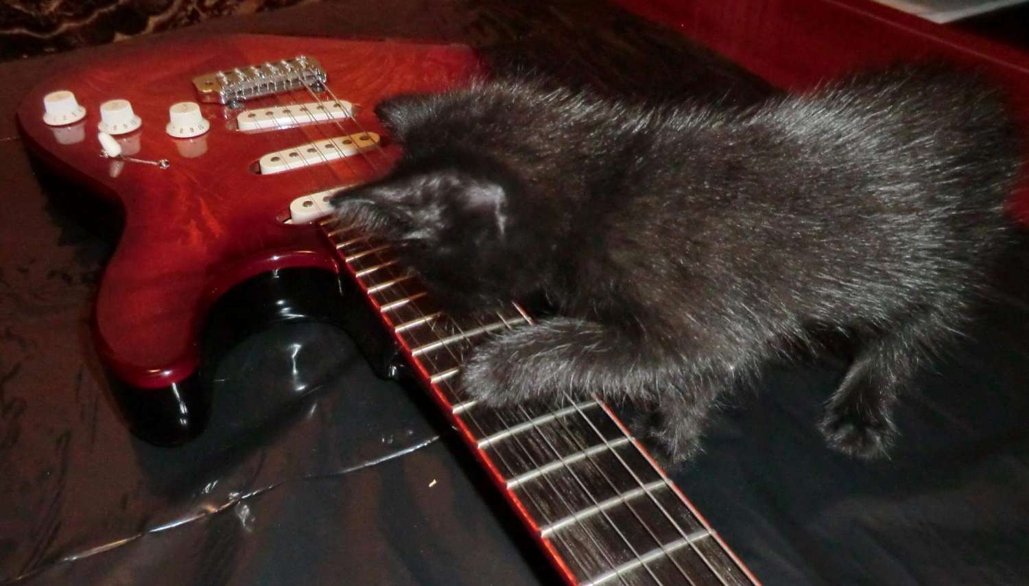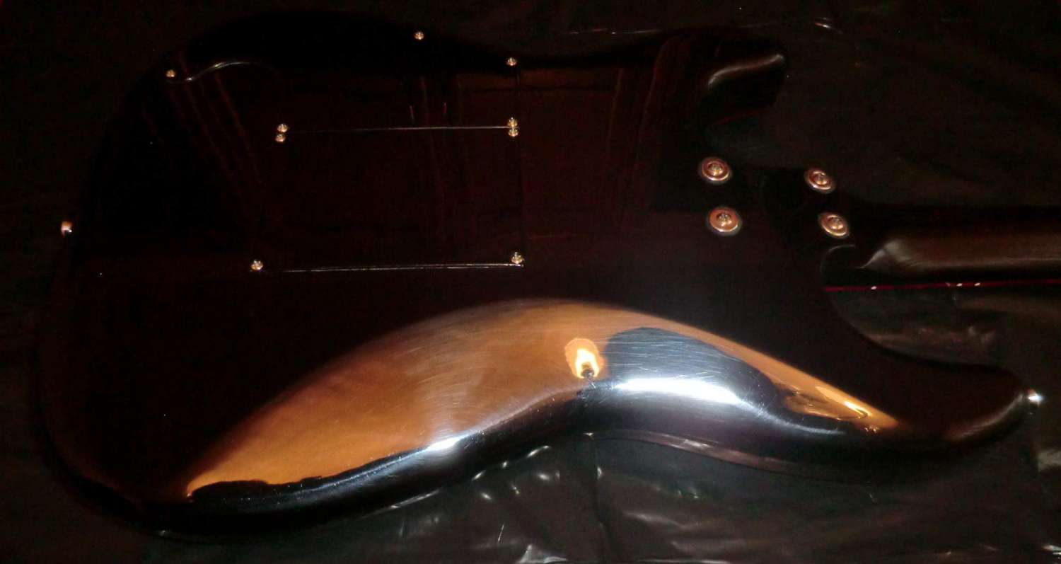 Наконец прошел год с момента закладки кленово-орехового страта, дерево успокоилось, пришло время предпродажной подготовки, за время эксплуатации выявлены незначительные (на мой взгляд) дефекты: немного вылез лад, просел лак, немного царапин. Ну и традиционное котэ, знакомьтесь, это Багира, порода: «кубанская сторожевая», оценивает состояние инструмента.