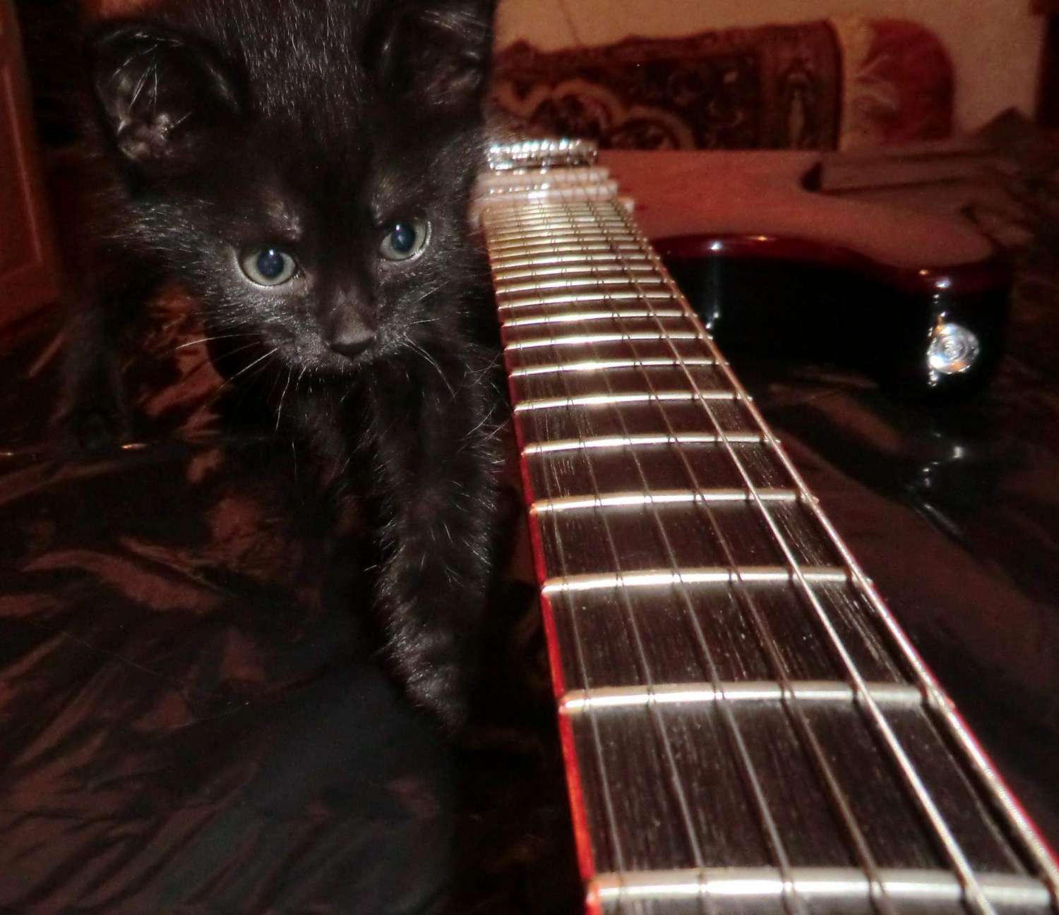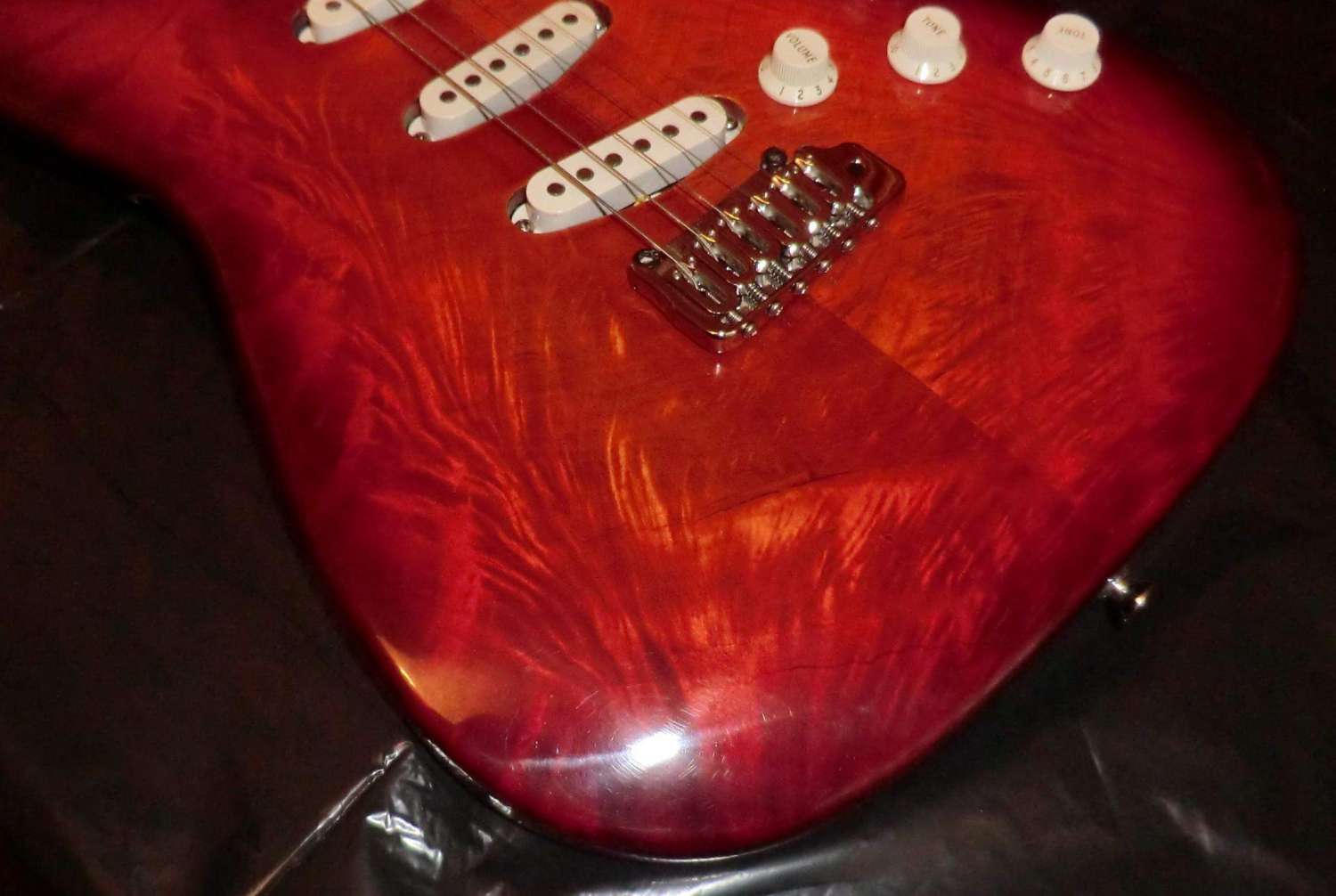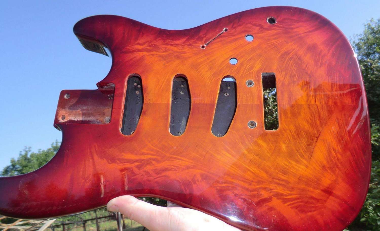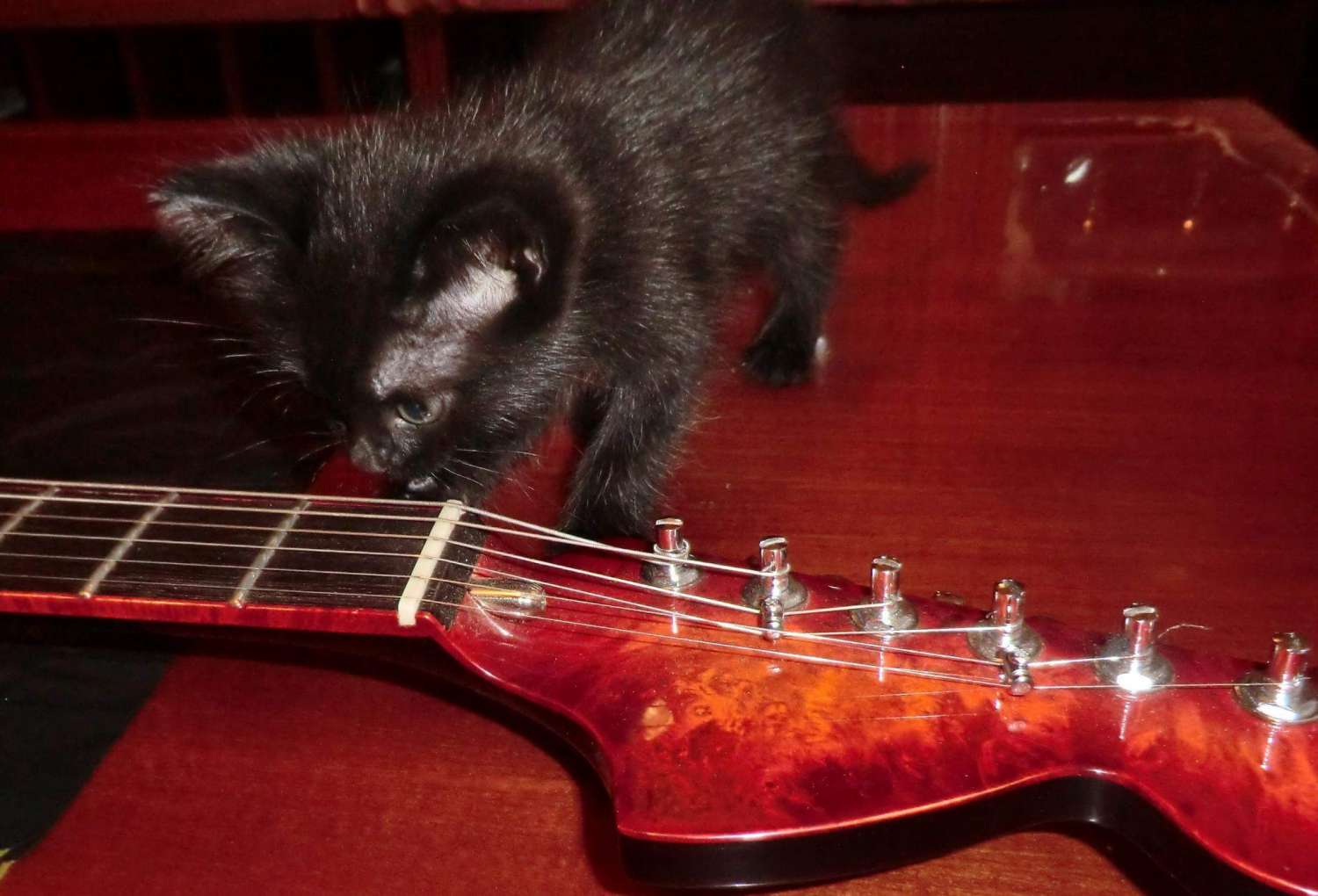 Наконец прошел год с момента закладки кленово-орехового страта, дерево успокоилось, пришло время предпродажной подготовки, за время эксплуатации выявлены незначительные (на мой взгляд) дефекты: немного вылез лад, просел лак, немного царапин. Ну и традиционное котэ, знакомьтесь, это Багира, порода: «кубанская сторожевая», оценивает состояние инструмента.