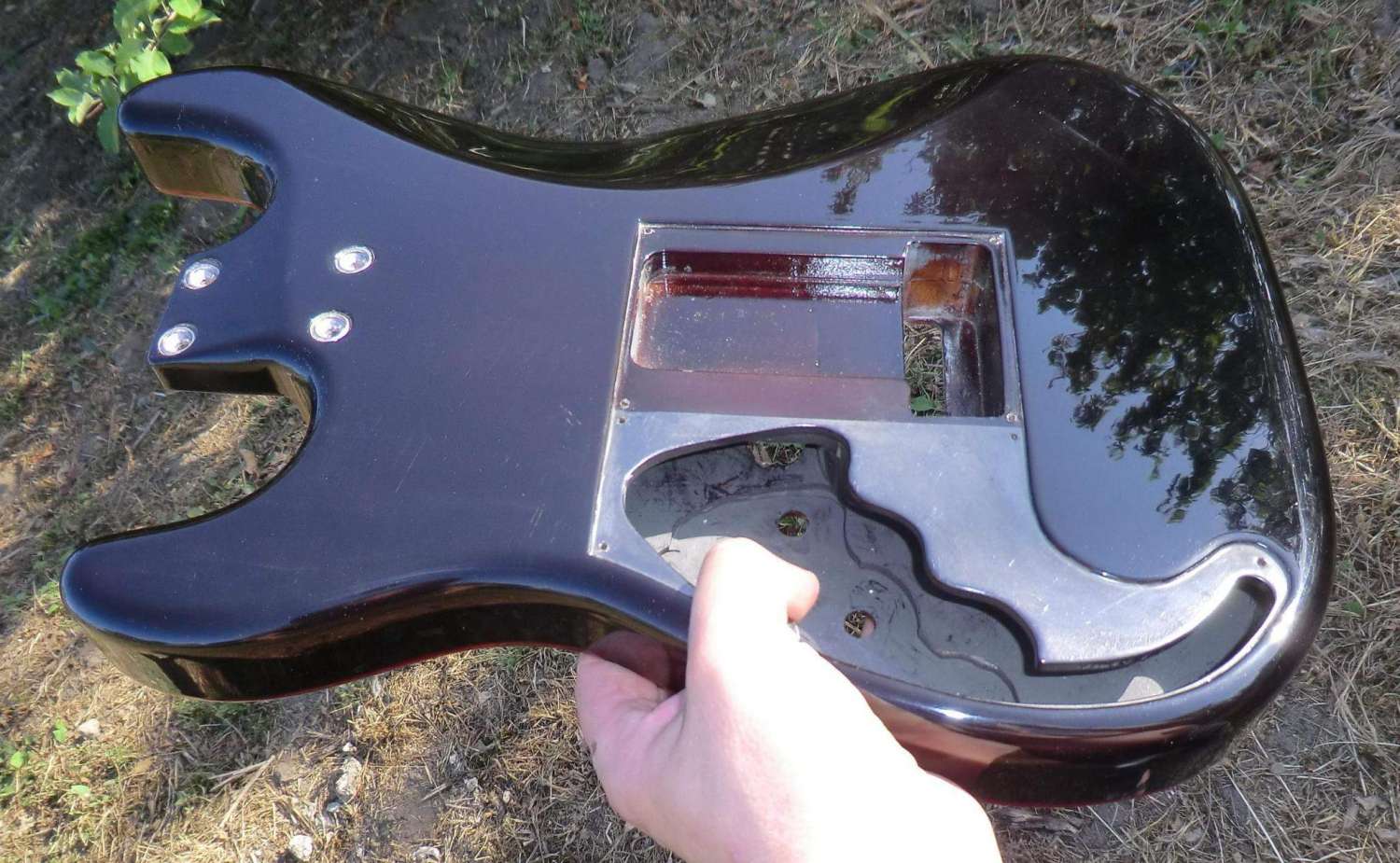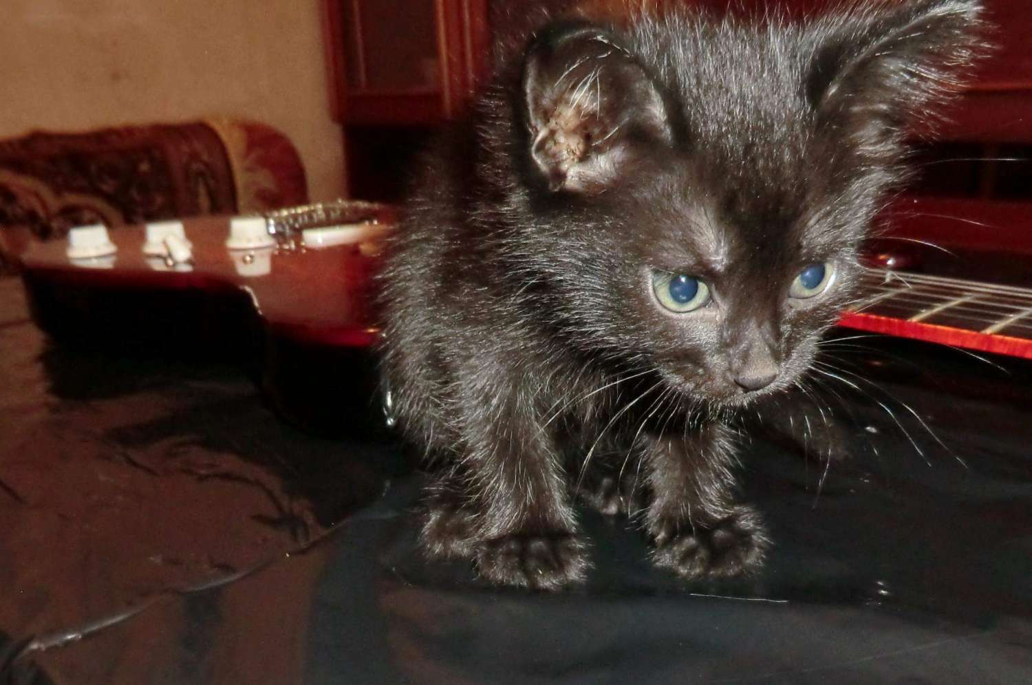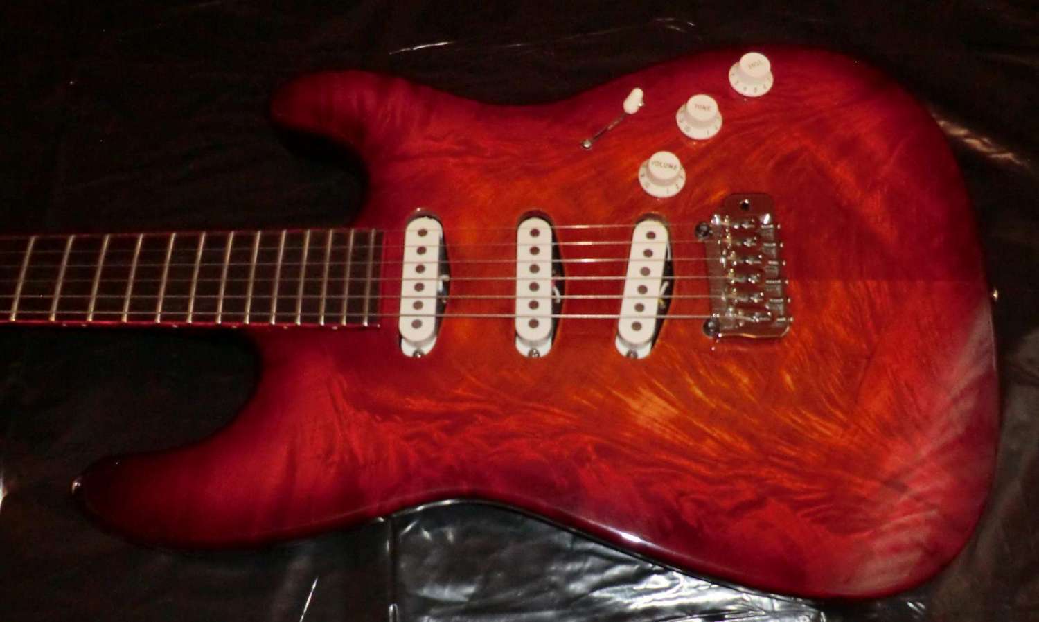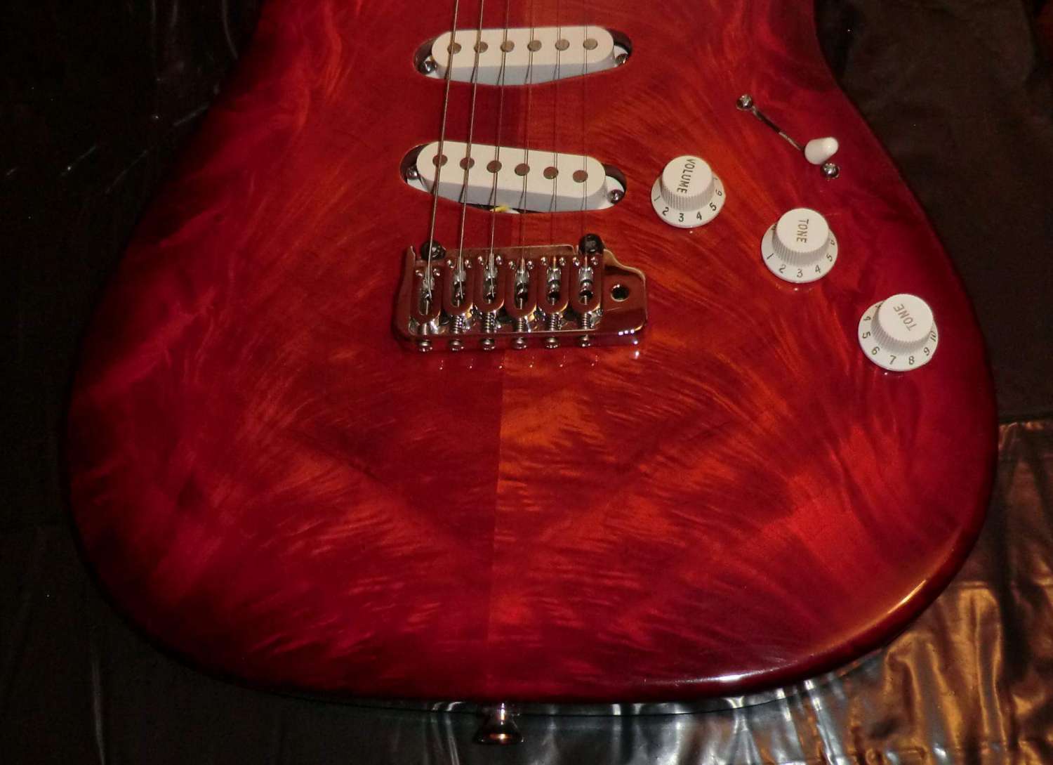 Наконец прошел год с момента закладки кленово-орехового страта, дерево успокоилось, пришло время предпродажной подготовки, за время эксплуатации выявлены незначительные (на мой взгляд) дефекты: немного вылез лад, просел лак, немного царапин. Ну и традиционное котэ, знакомьтесь, это Багира, порода: «кубанская сторожевая», оценивает состояние инструмента.