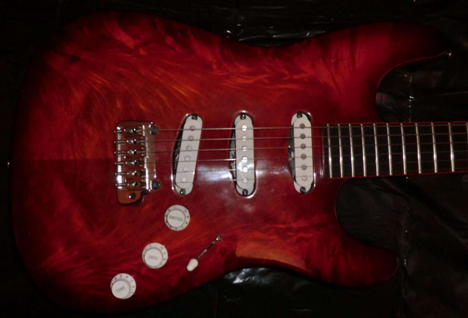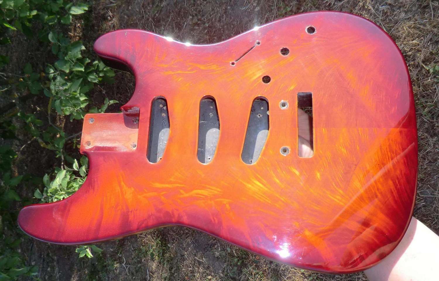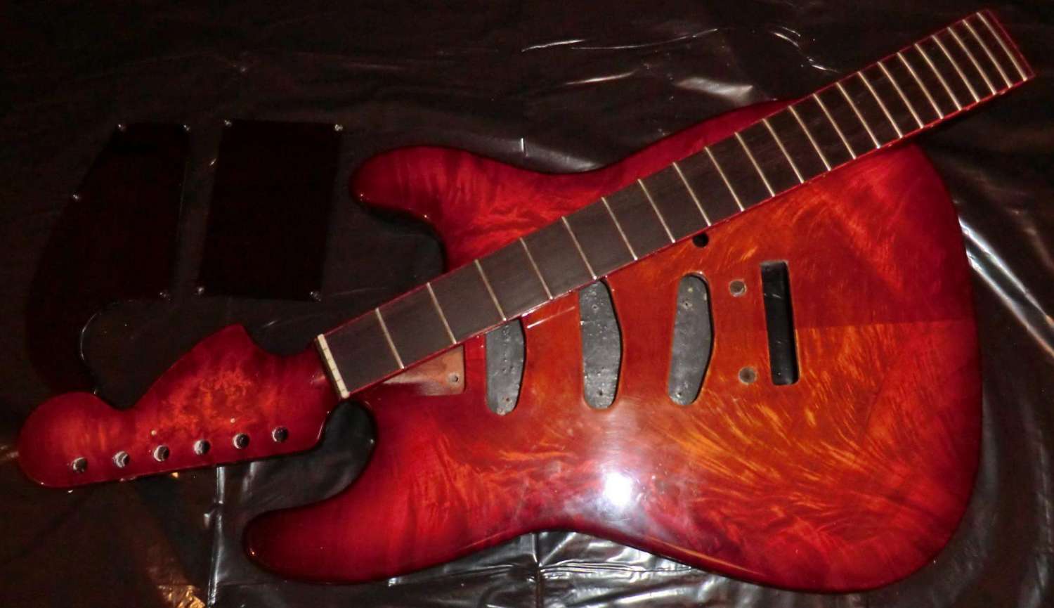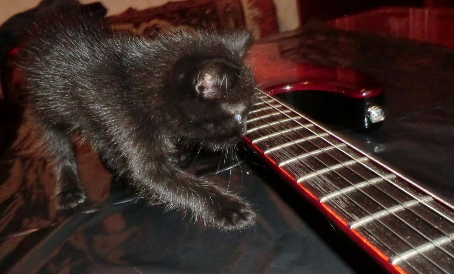 Наконец прошел год с момента закладки кленово-орехового страта, дерево успокоилось, пришло время предпродажной подготовки, за время эксплуатации выявлены незначительные (на мой взгляд) дефекты: немного вылез лад, просел лак, немного царапин. Ну и традиционное котэ, знакомьтесь, это Багира, порода: «кубанская сторожевая», оценивает состояние инструмента.