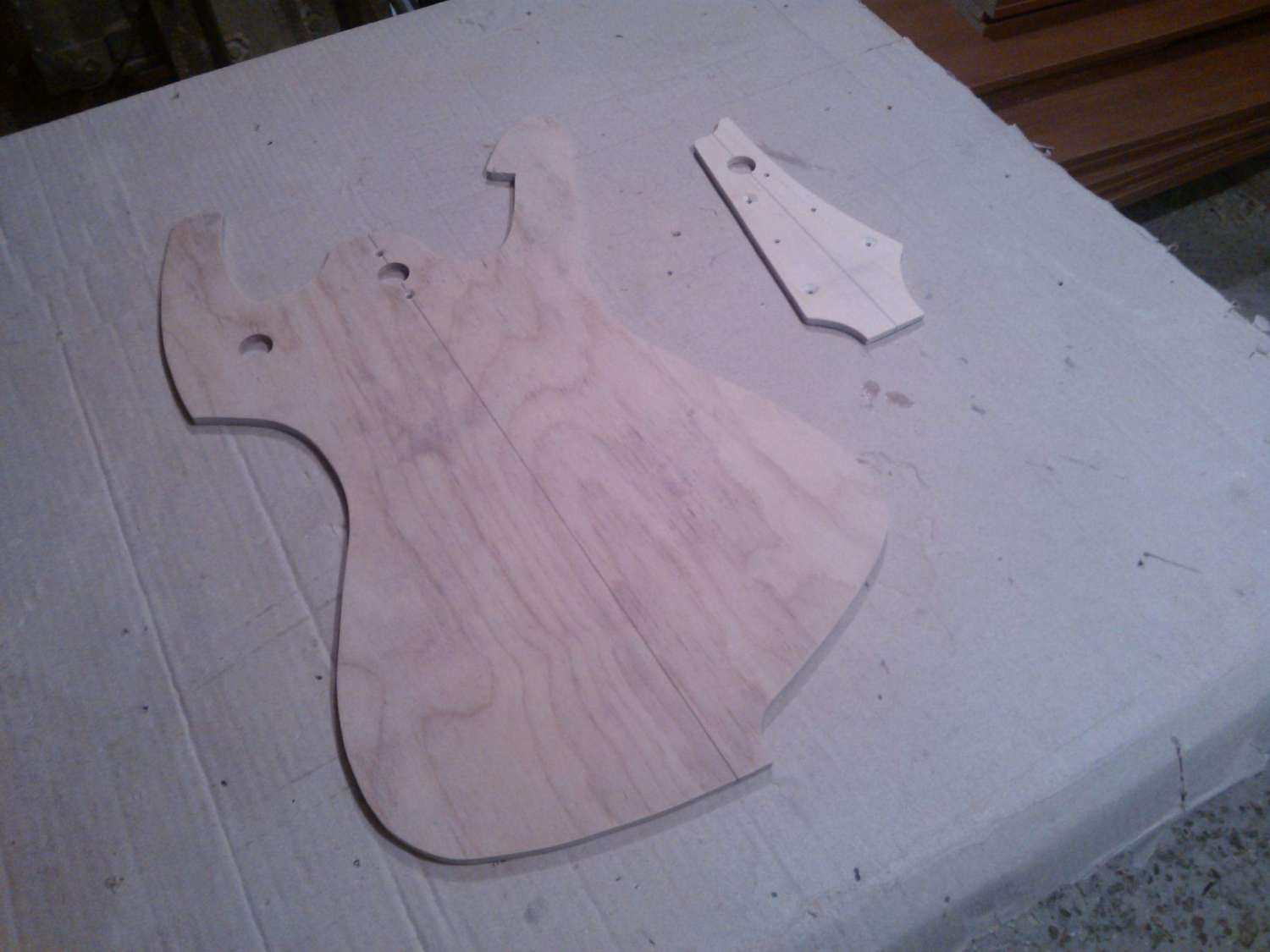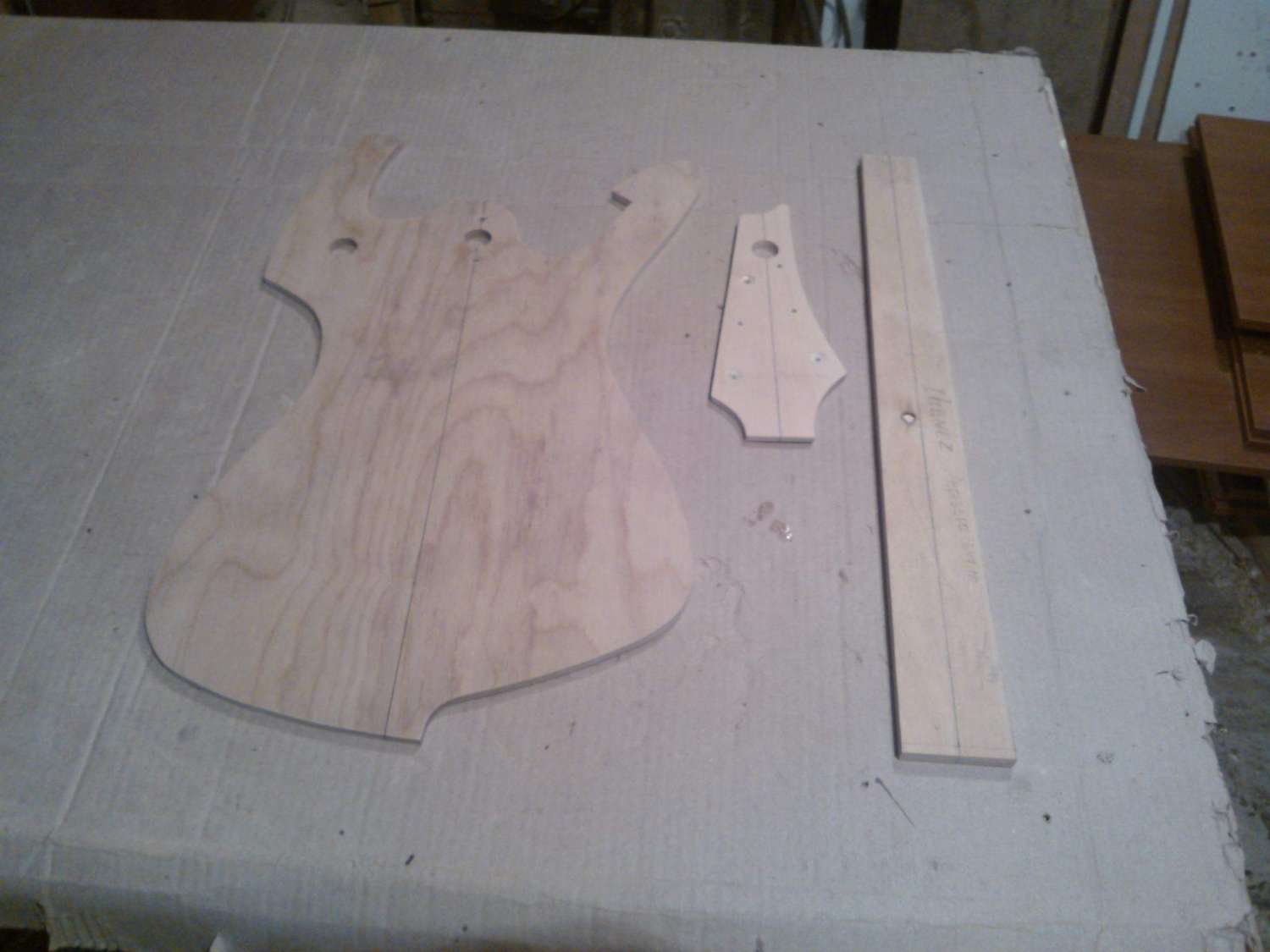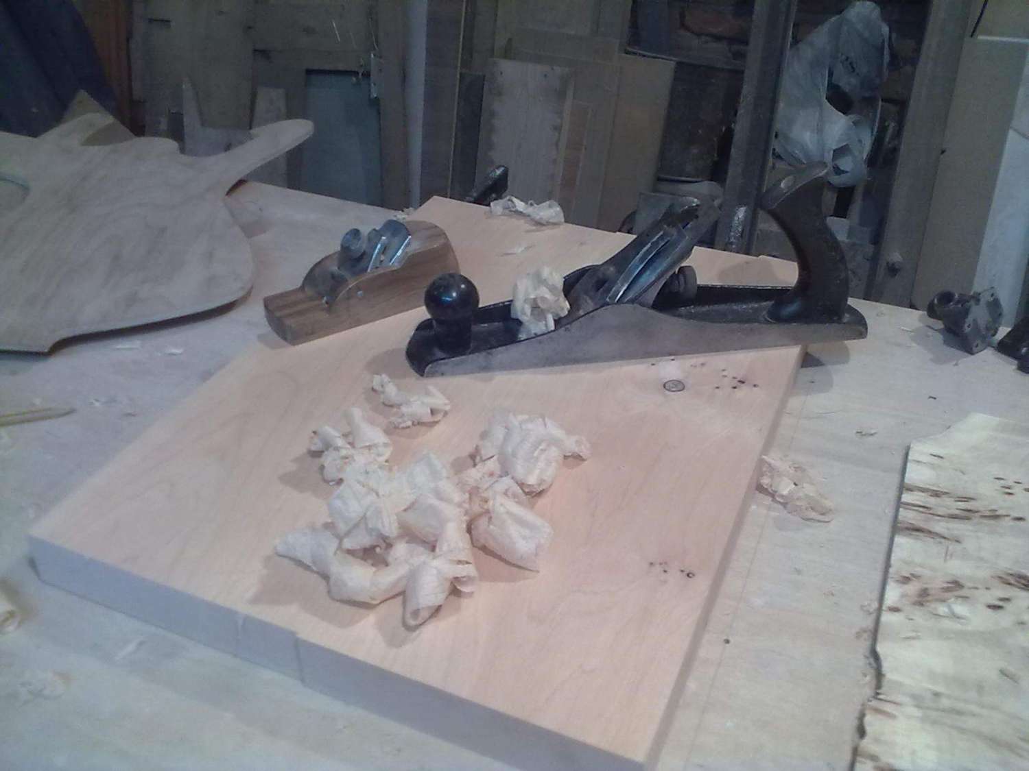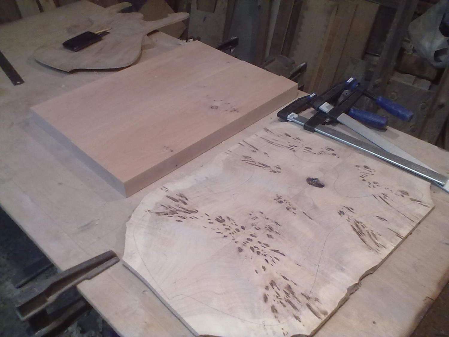 Начал работу над еще одним проектом, это будет помесь Ibanez Aice men с гитарой фирмы Parker, так называемый Aice Flai. Для деки я выбрал ольху, топ тополь, гриф клен, мензура 25.5'' 648мм, с датчиками еще пока не ясно. Вот фото начала работ, съема размеров, строжки деки и приклейки топа.....