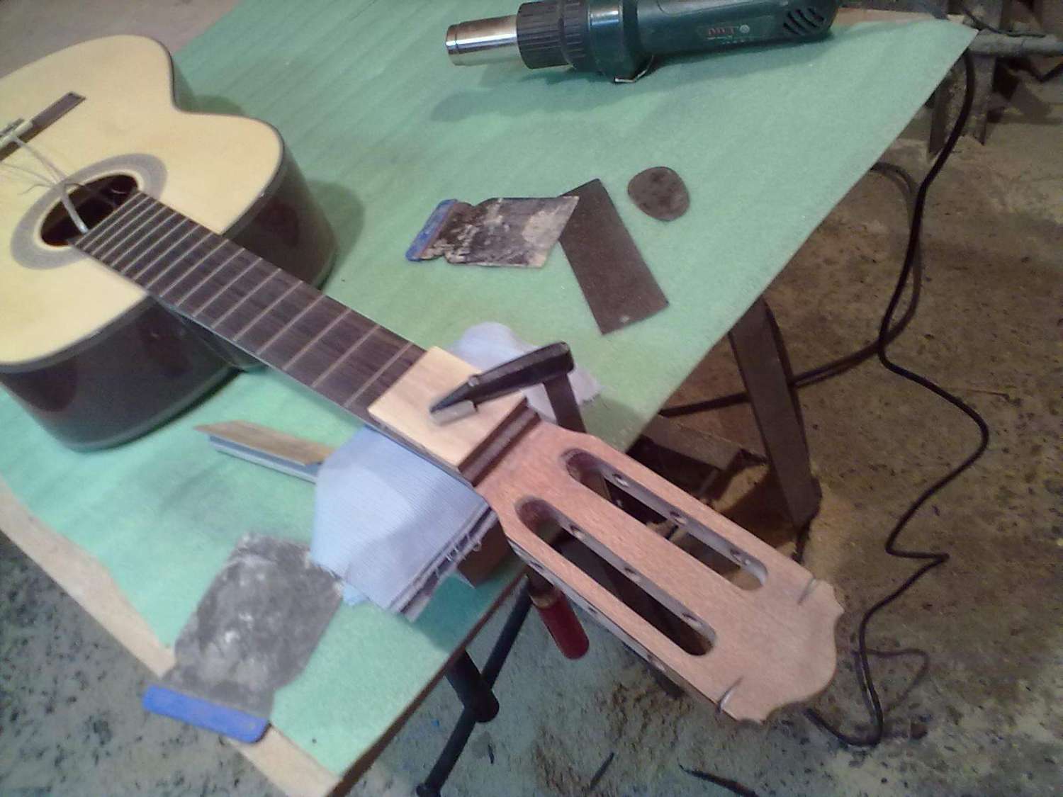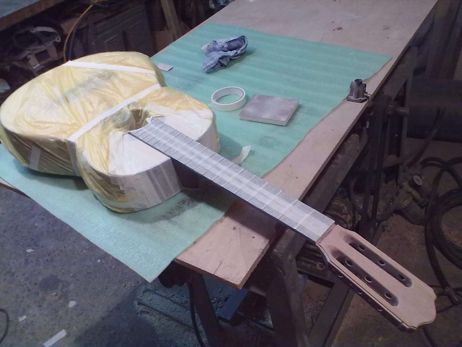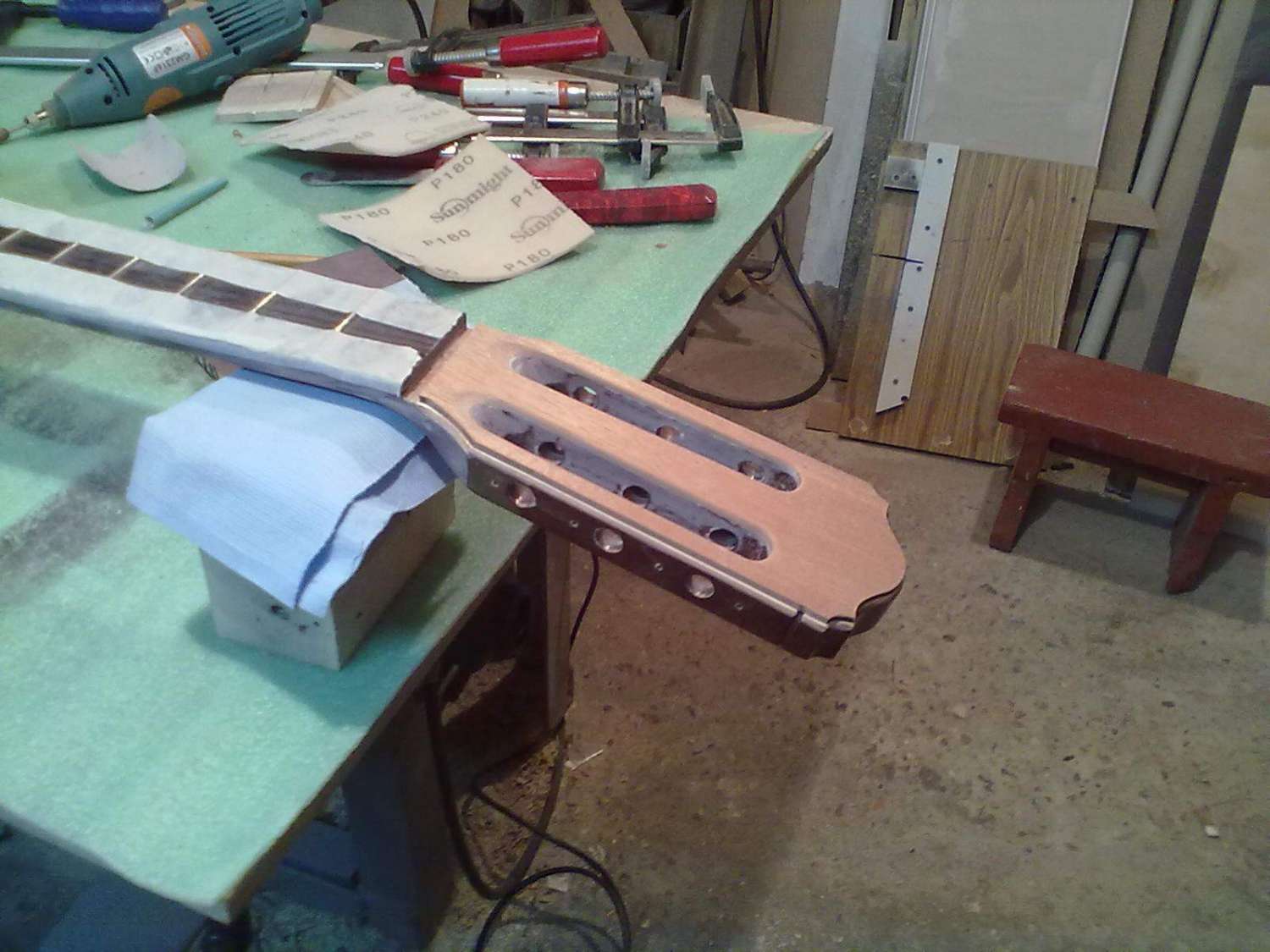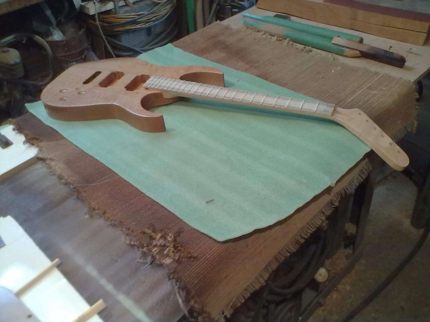 Начал работу над еще одним проектом, это будет помесь Ibanez Aice men с гитарой фирмы Parker, так называемый Aice Flai. Для деки я выбрал ольху, топ тополь, гриф клен, мензура 25.5'' 648мм, с датчиками еще пока не ясно. Вот фото начала работ, съема размеров, строжки деки и приклейки топа.....