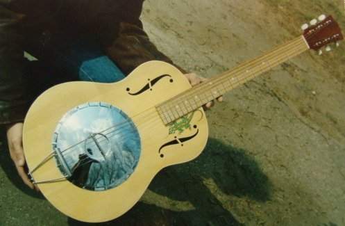А принцип один: создать в гитаре дополнительный резонатор для более громкого и специфического "кастрюльного" звука. Насколько я читал на тех же штатовских форумах, дядьки берут акустику, врезают этот самый резонатор и пользуются. Так что если всё сделать аккуратно, вполне проканает и автомобильный колпак. Внутри не обязательно делать хитроумную машинерию как у "Добро", можно и вот так: