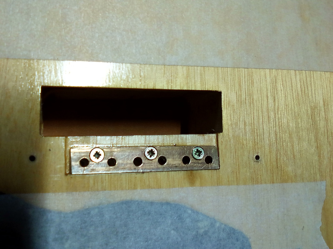 Хочу предложить вашему вниманию небольшую доработку фендеровского тремоло.Почему пришлось это сделать?Имею два страта собственного производства-один из аводире,другой из ольхи тангенциального раскроя.Через 2 года обратил внимание на опорные винты тремоло и заметил,что они немного наклонились вперед.Это стало заметно по расстоянию до панели.В деке из аводире это было менее заметно-так и дерево плотнее намного.Тем не менее,все-таки 120 кг давит на 6 винтов.Вот и решил сделать из бронзы 3-4мм толщиной вот такую потайную панельку.