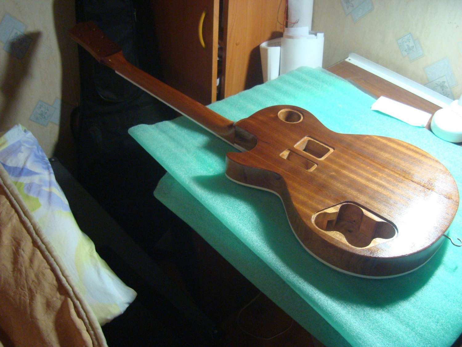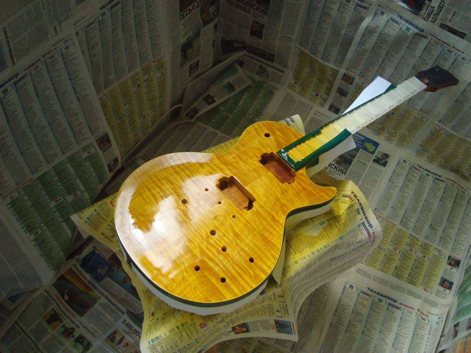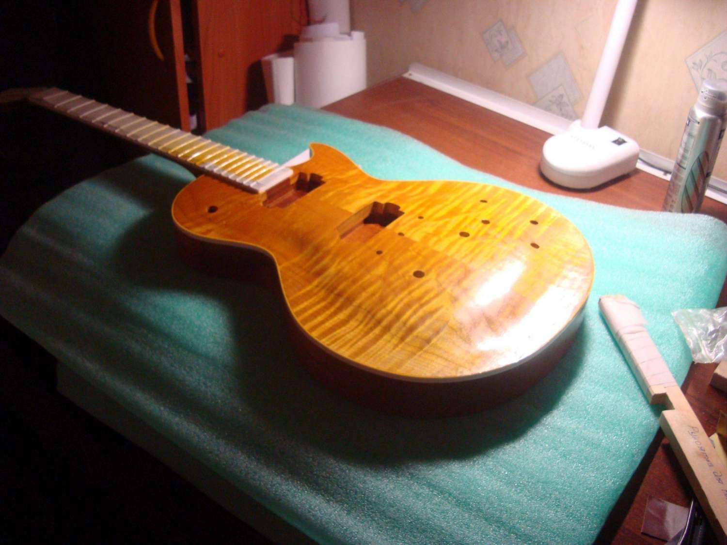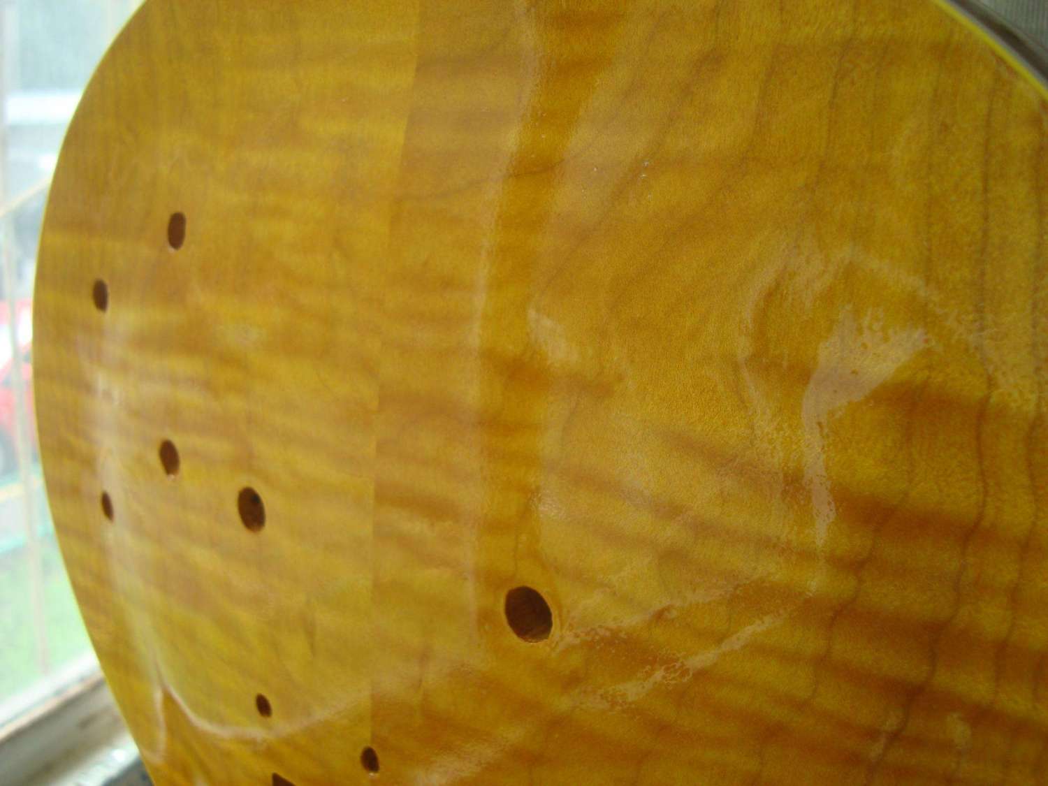 Итак вернувшись с работы переклеил маски и задул топ желтым лаком. Положил специально на голое дерево сразу цветной и побольше, что бы фактура и рисунок древесины был более ярко выраженный. Завтра - послезавтра все вышкурю и задую снова. Причем топ будет вышкуриваться практически полностью, и потом следующий слой будет класться более светлый и не такой толстый, и после него, без прошкурки уже буду класть простой лак до ровного состояния с промежуточной шлифовкой... Я так понимаю я сделал все наоборот