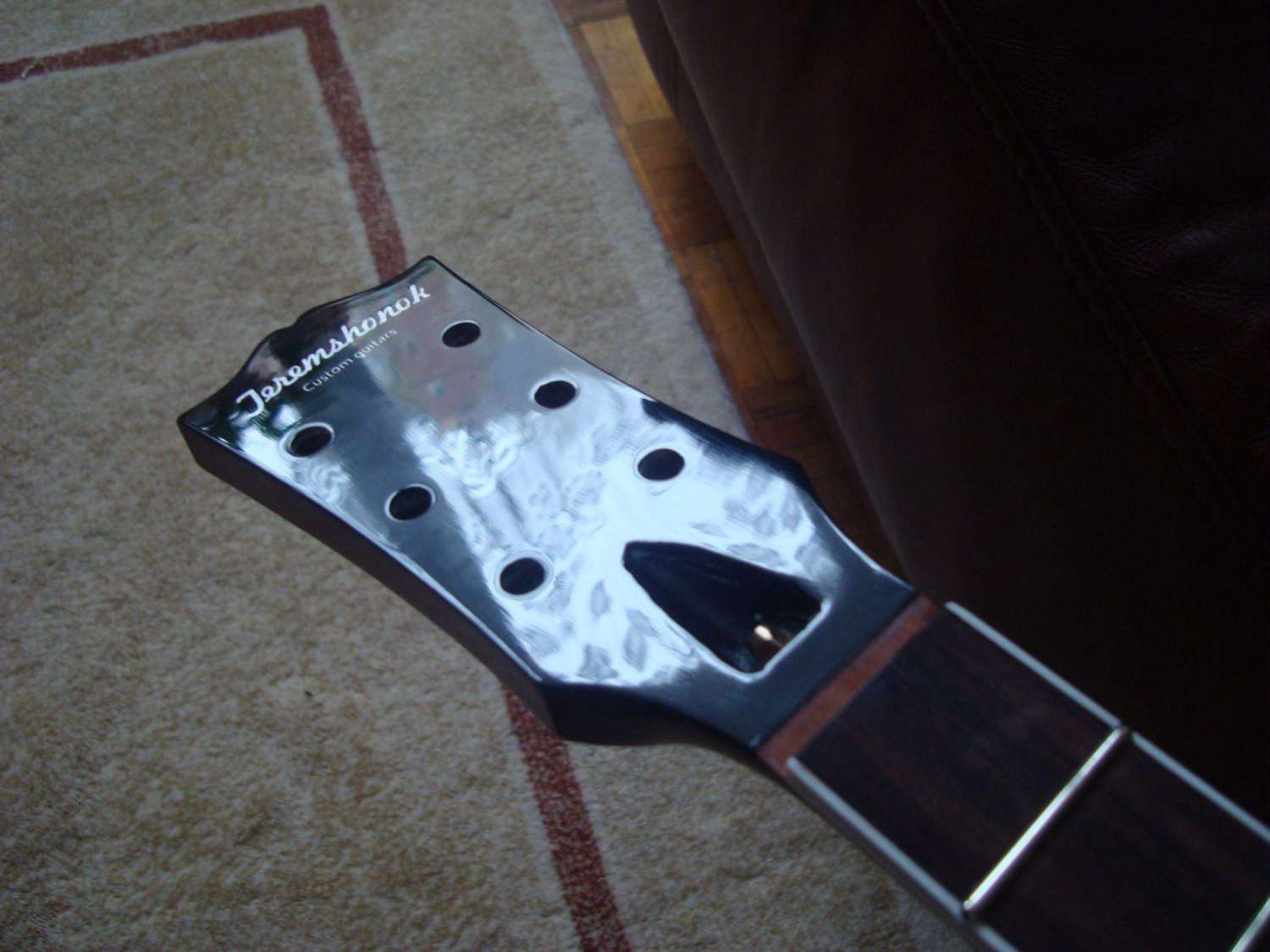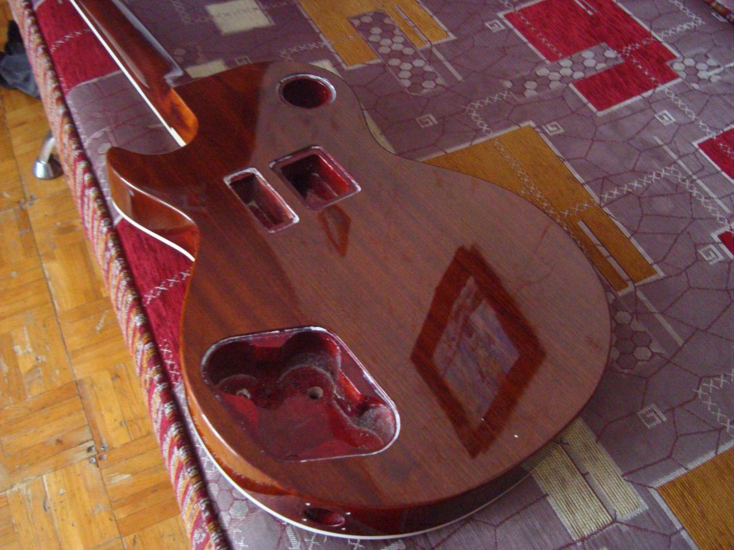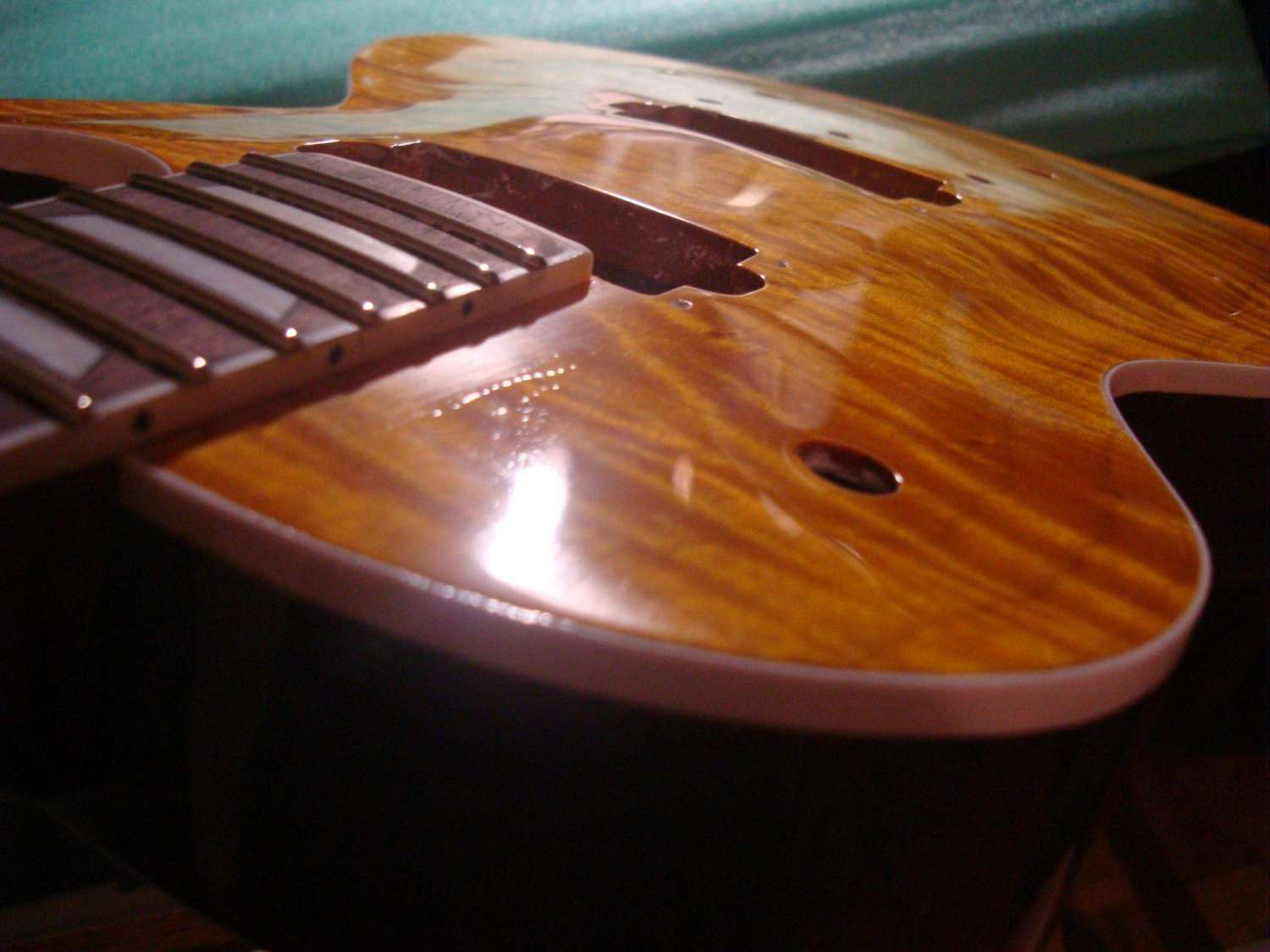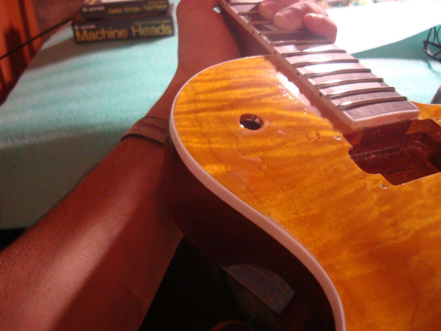 И тут я снова осел и задумался - что это может быть? Я четко соблюдал последовательность номеров, откуда царапины и почему не убрались пастой? Причем ладно бы вся гитара была такой, но на грифе вообще все отлично - зеркало (учитывая то что еще не до конца отполировано)! может лак достаточно осел и это царапины на деревяшке? я там больше 360 не шкурил... короче говоря сейчас спать завтра со свежей головой буду думать... Скорее всего вмятины залью супер клеем (раньше так делал, если заполировать потом вроде прокатывает), царапины постараюсь по максимуму заполировать абразивкой... да здравствует колхоз. наносить еще один слой лака не могу. Нет ни лака, ни денег, ни погоды, ни желания... Надеюсь что после того что я смогу выжать из отделки она хоть звучать будет более менее...