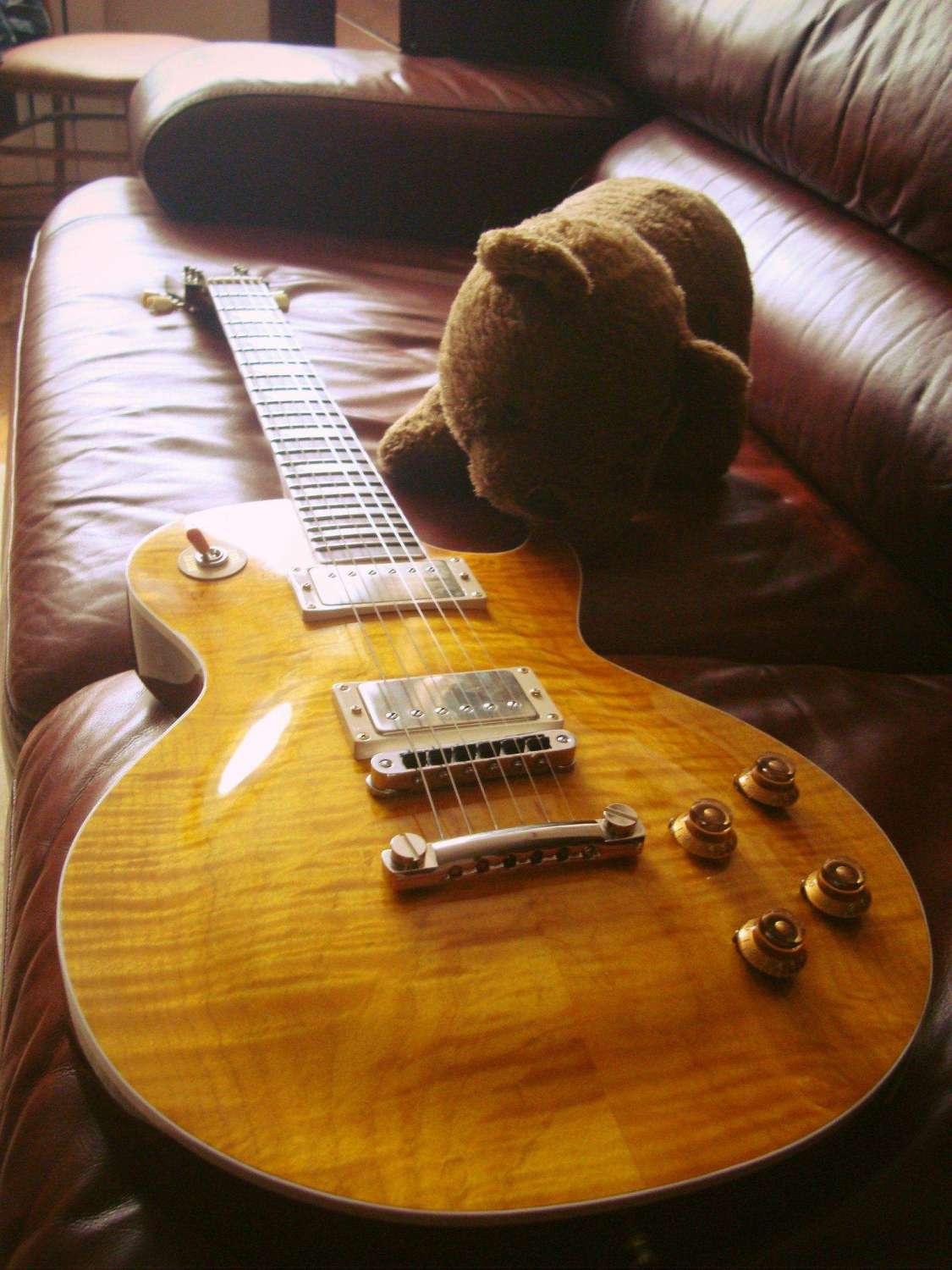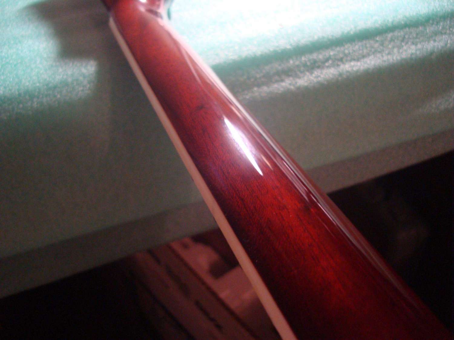 На самом деле напрямую такой мысли не было, наверное она возникла где-то на подсознательном уровне... Вообщем все началось в четверг, я взял шкурку 800 и начал шкурить (само собой с водой), потом 1200, потом 2000. Потом я взял 74 пасту, но так как полировалось вручную окзазалось нереально долго, а круга у меня не было, я взял колесико от бормашинки, которым полировал лады, зажал его и начал полировать. И о ужас - из колесика вылезла железяка и все мне передавила, оставив кучу следов... на этом я успокоился и сел обдумывать - что сделать дальше, повесится сразу или помучатся еще немного (шутка), решил помучится. Вышкурил то место убрав (вроде бы) следы, съездил в магазин купил полировальники и диск для дрели. Прошел 74 пастой (в попытках хорошенько все убрать, полировал от души, в одном месте на уголке снял лак) и затем 75. И о ужас дубль 2