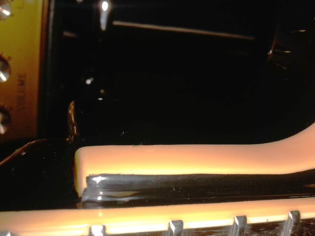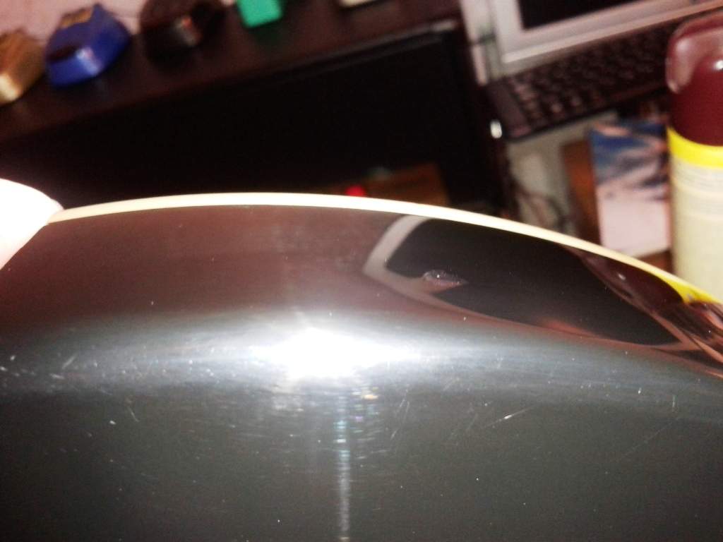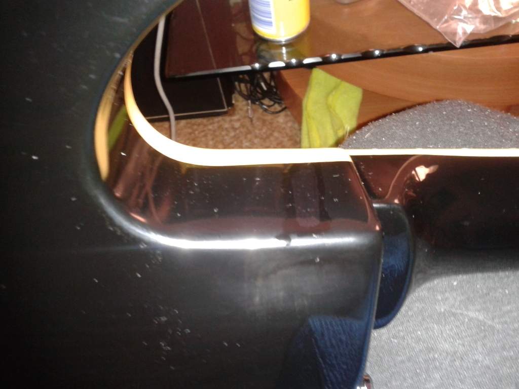 меня несколькими вмятинами черного глянцевого лака. Один дефект маленький, точечный и можно было бы не обращать на него внимание. Второй - полоса длиной около 3-х сантиметров и шириной 0,5 сантиметра вдавленного лака. С одной стороны лак треснул и вдавился в дерево, другая сторона лак просто прогнулся внутрь. Долго просматривал разные материалы в интернете, прикидывал так и этак.