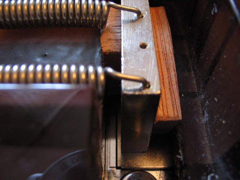 Относительно блокировки проволокой. На фото тремоло на двух винтах, после блокировки ложится на деку. В случае FR, который было бы неплохо поставить параллельно деке, просто отпадает необходимость в большом внешнем бруске, а внутренний строгается с тем расчетом, чтобы зафиксированное тремоло встало под нужным углом, уперевшись в него.