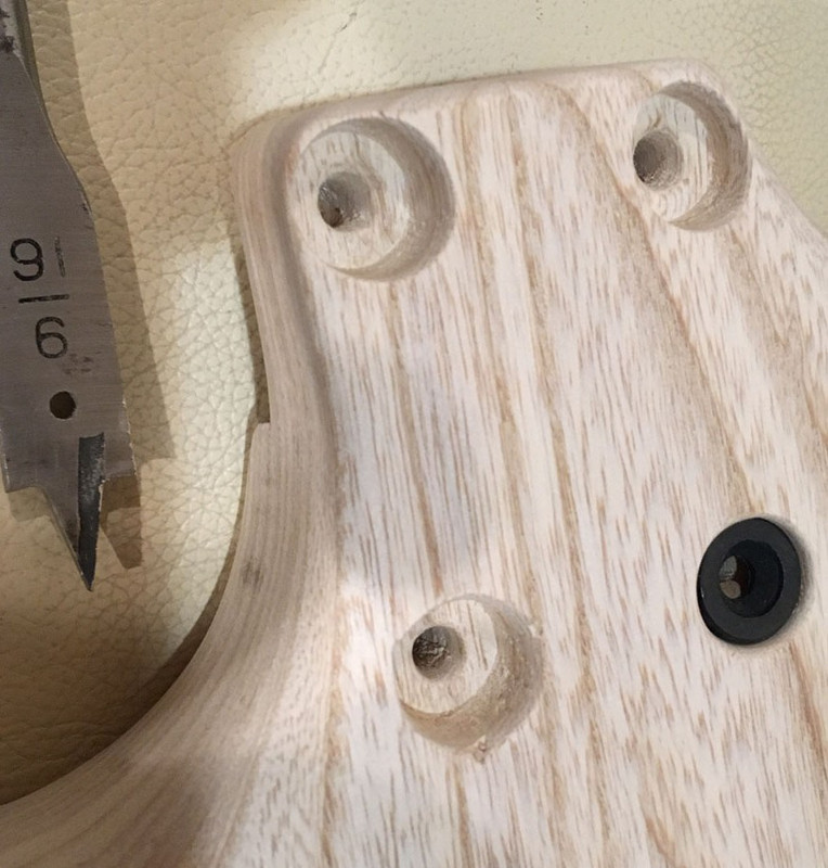Просверлил дырки в деке для шурупов крепления грифа ручной дрелью и даже не перекосил, под плэйт было бы всё нормально, но захотелось попробовать рассверлить под шайбы...