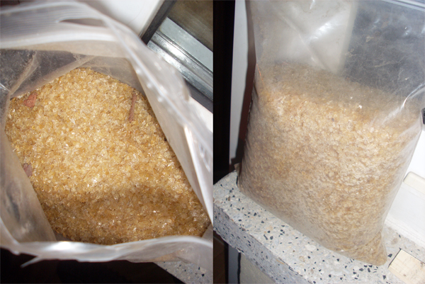 Приступим к приготовлению мездрового клея.Клей, в виде гранул или порошка, кладут в клеянку и заливают водой комнатной температуры так, чтобы весь клей скрылся под водой, но не более. В качестве сосуда для клея я использовал хорошо промытую, чистую маленькую баночку. Если, во время разбухания, у клея появился гнилостный запах, то такой клей не пригоден к работе.