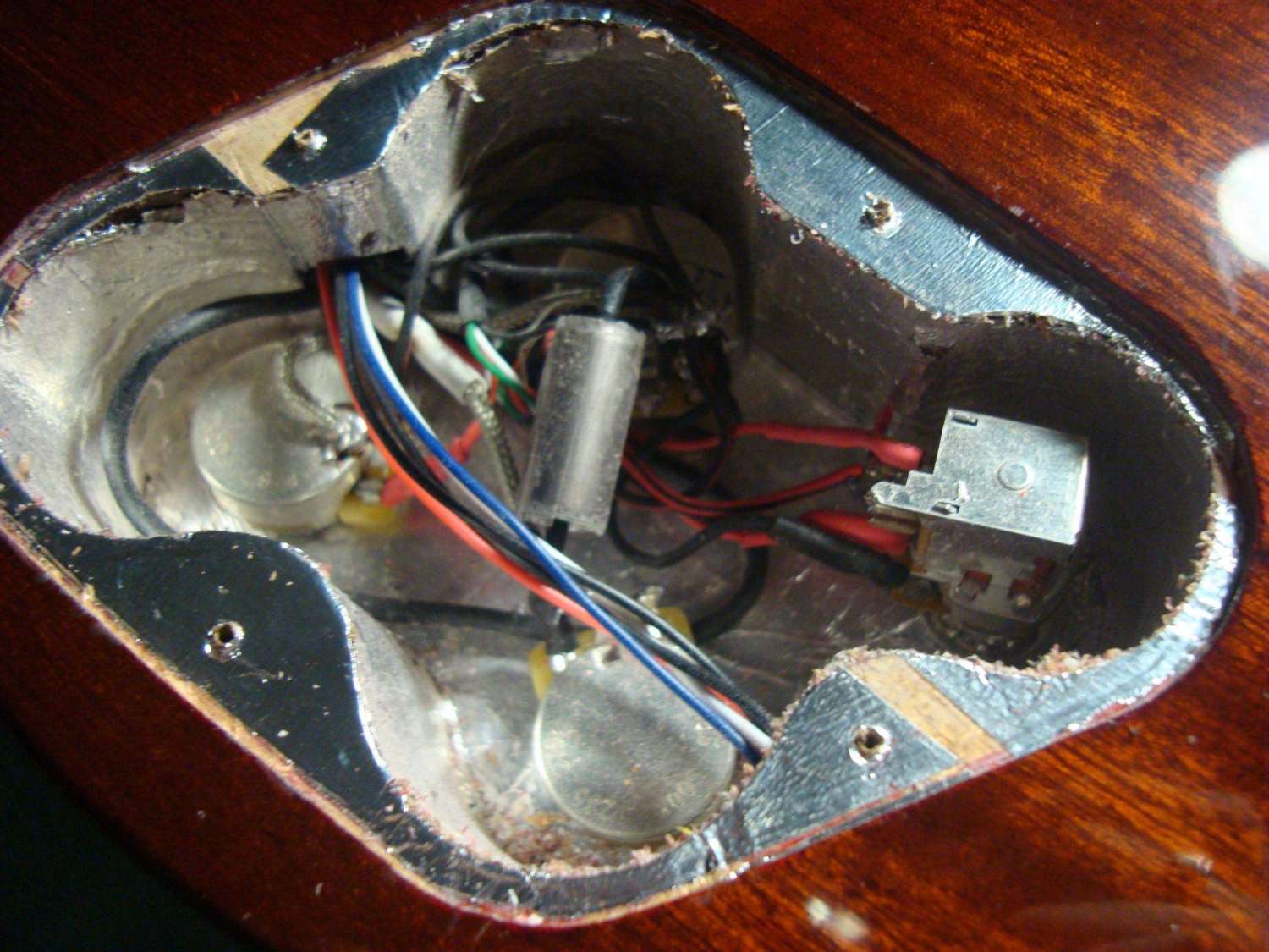 По последней схеме. С конденсаторами ошибка. Надо перемычку слева между потами убрать и вместо нее конденсатор. Т.е. выводами кондер растягиваем между выводами 1 громкости и тона. Затем с вывода 3 громкости (земля) перемычка до вывода 2 тона и с вывода 2 тона перемычка до переключателя отсечки.