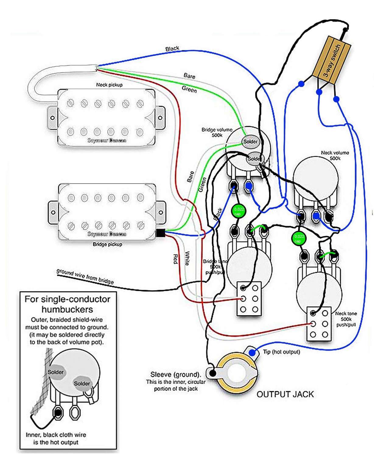 При той распайке, что я показал, основной напор на обычную луженую моножилу 16-18 AWG без изоляции. Для перемычек на пуш-пуши можно потоньше, это не проблема. Для распайки гнезда и переключателя надо прикупить экранированный кабель с центральной жилой в тканевой изоляции. И большая рекомендация каждый такой проводок в индивидуальную термоусадку чтобы не было взаимных замыканий экрана.