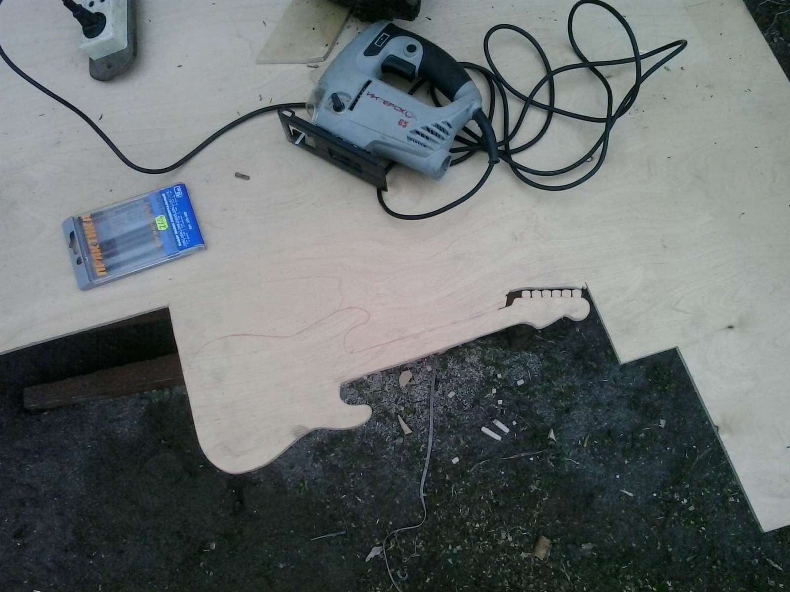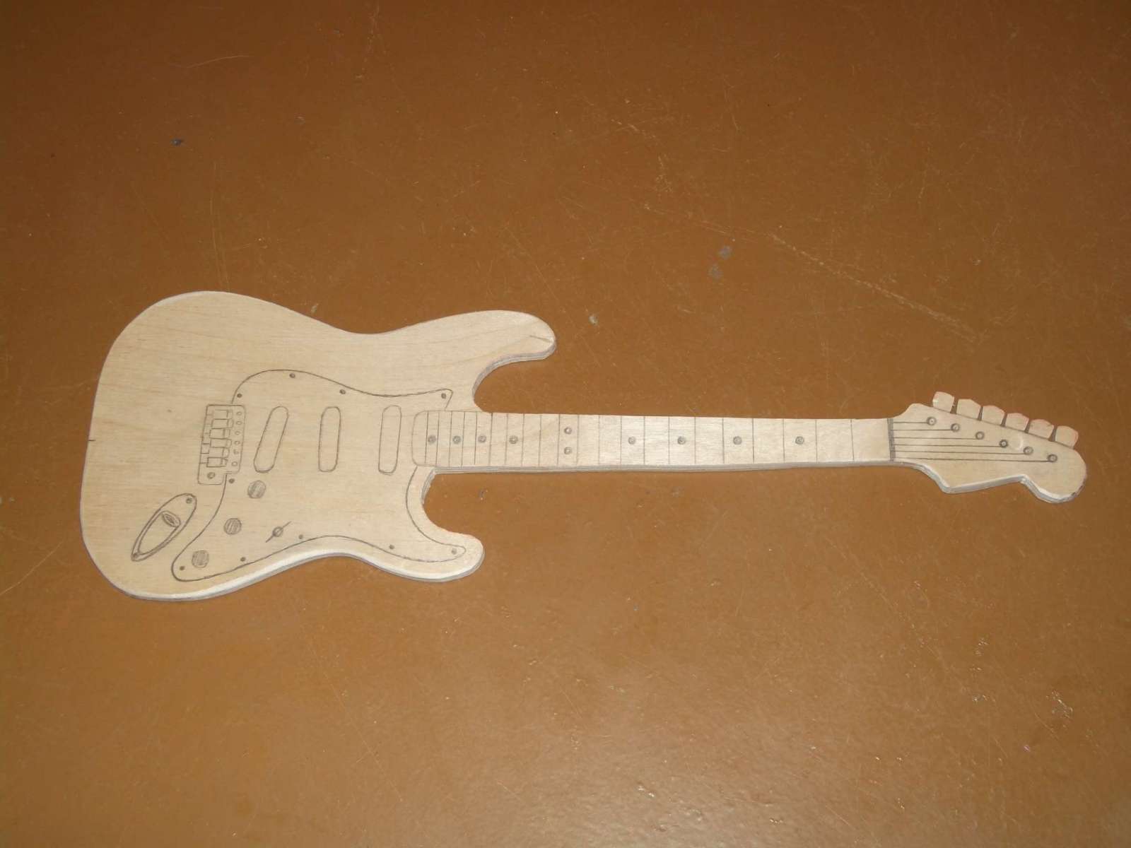 Вырезал профиль гитары. После склейки гитара получилась на два листочка. (Если кто подскажет, как из исходного большого чертежа уменьшить и произвольно разместить чертеж, буду благодарен. Пока приходится печатать все листы)