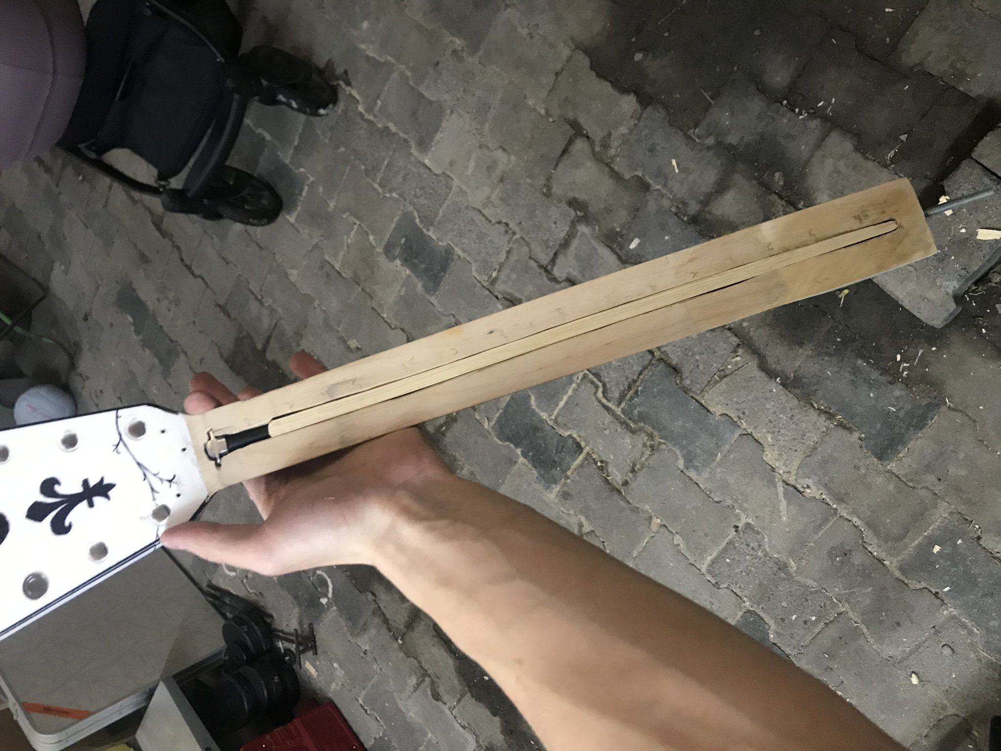 Нее наоборот береза выгнулась и анкером не смог вытянуть обратно. Анкер компрессионный исполнен в виде изогнутой 6 мм шпильки внутри грифа ... и добавил:Накладка из березового капа спиленного в лесу ... и добавил:Анкер уложен в изогнутый пропил и закрыт также изогнутой деревяшкой