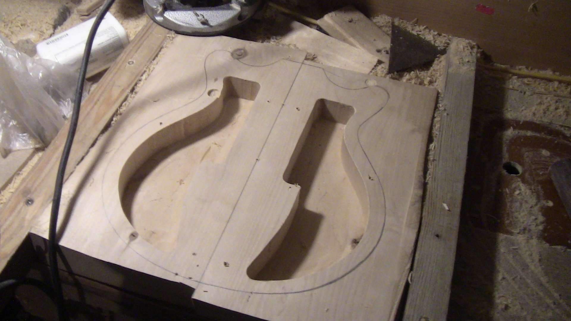 Для начала достал я из резервов березовую доску в метр длиной и 45 мм толщиной, выдержанную лет этак 8-9, очень легкая и вместе с тем крепкая, была распилена на две части, отфугована фрезой на 40 мм толщины и склеена в заготовку корпуса. Далее, изготовив шаблон, я выгрыз внутренние полости, оставив центральный блок.