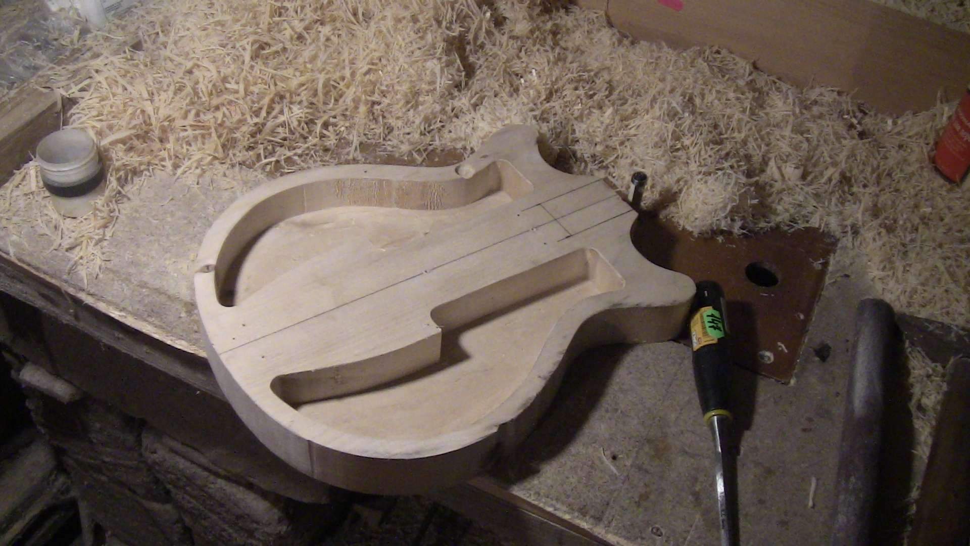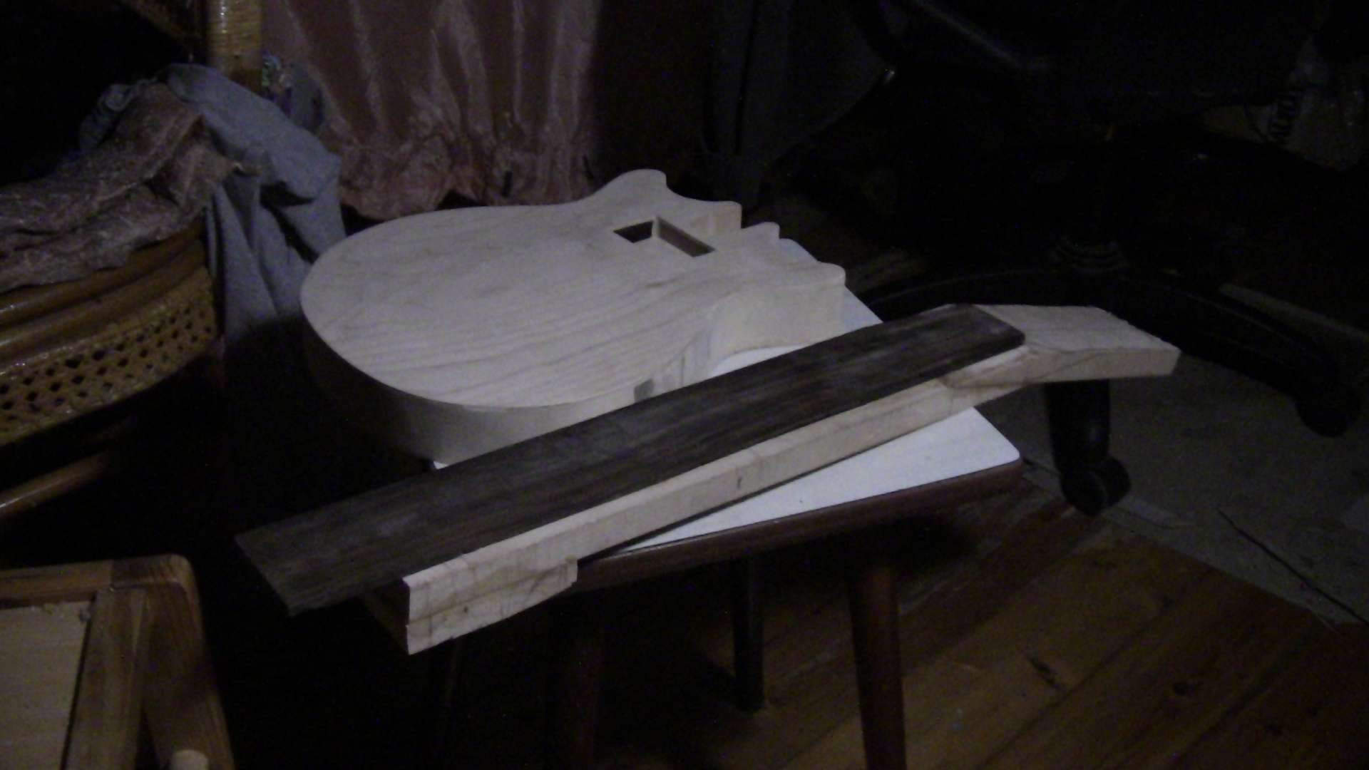 выдроч... выточить радиус (опять же близкий к гибсоновскому, примерно 14"-16"), сделать пропилы под лады и поставить сами лады. Забивать я не хочу, поэтому надо еще собрать простенький рычажный пресс (все нужные части уже есть, надо только собрать до кучи). Корпус обкатать сзади радиусной фрезой и вырезать окно под нековый датчик и заднее окно для доступа в чрево. После всех этих делов можно склеивать корпус и гриф вместе. На борту будет стоять бридж тюн-о-матик, а вот со струнодержателем пока определенности нет - либо собрат бриджа, либо сделаю сам из пластины нержавейки, винтажикЪ. По электрике - хватит и одной громкости, научится - купит себе Лес Пол