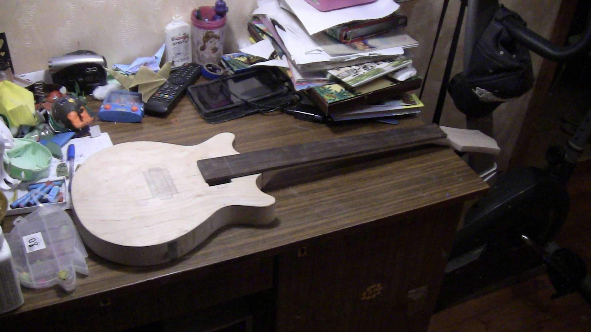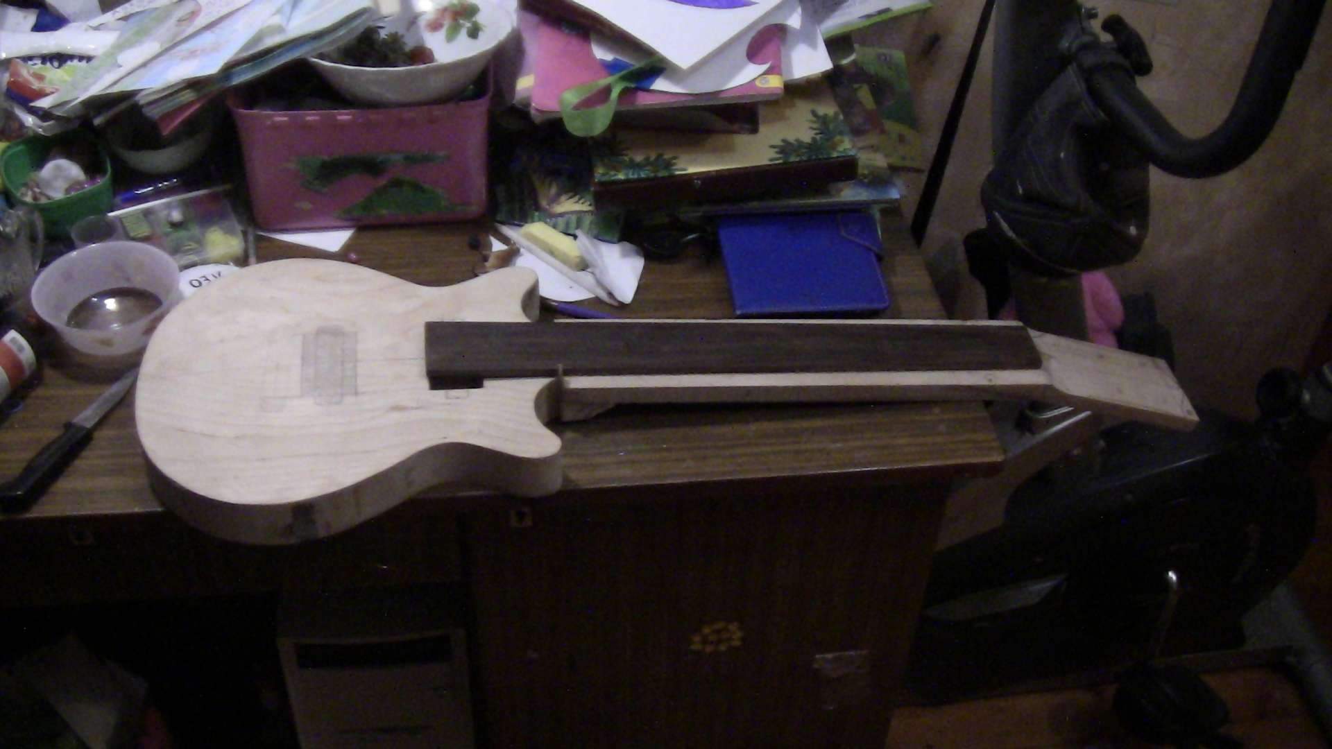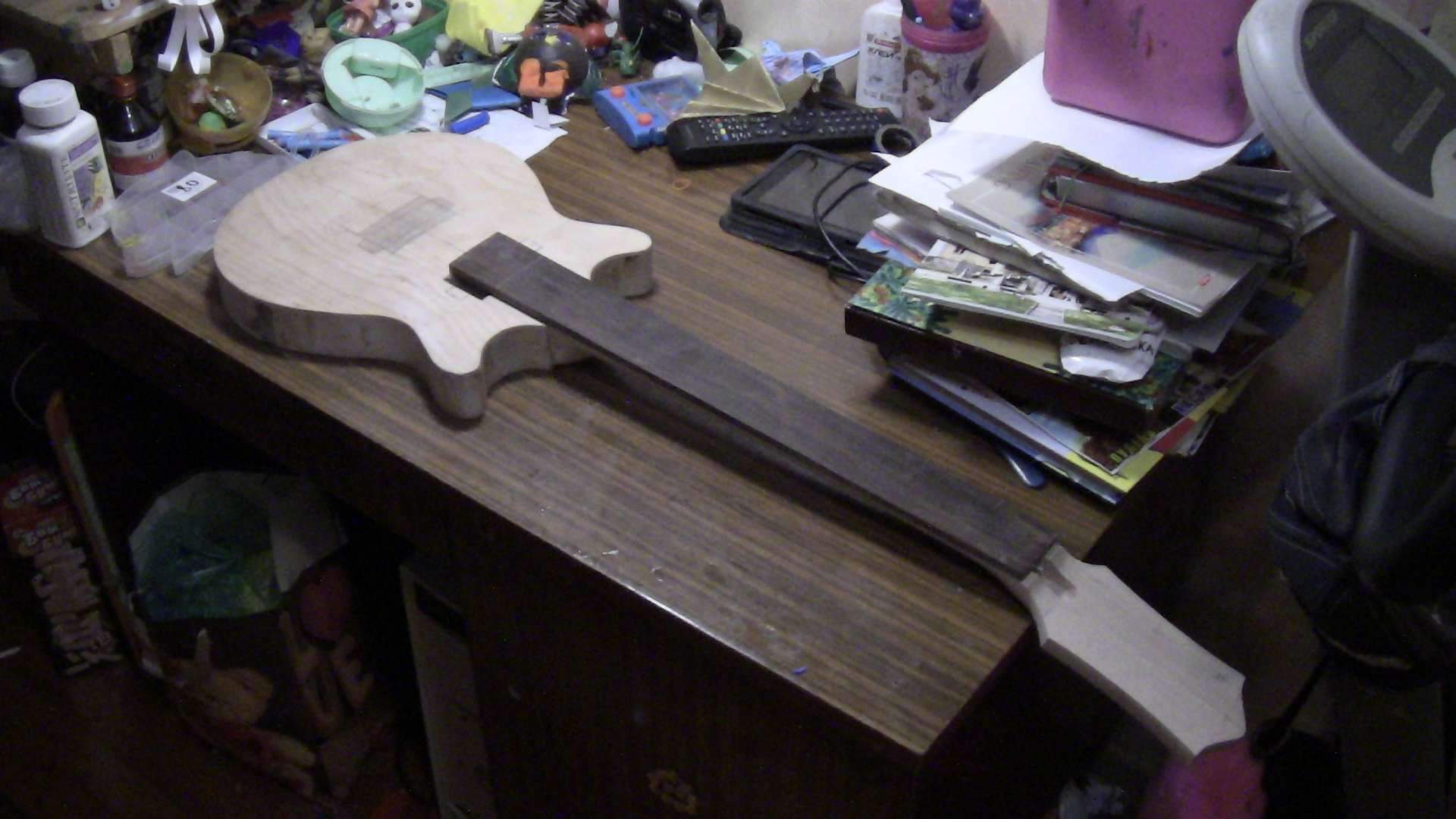 На данный момент полностью склеен и обточен гриф, просверлены отверстия под колки, на голову наклеена декоративная накладка красного дерева. Корпус склеен и в нем профрезовано окно под нековый датчик, которого на самом деле там не будет - оно будет служить отверстием-резонатором. В будущем, если дочка захочет, то датчик всегда можно поставить.